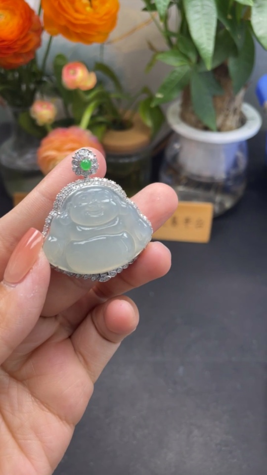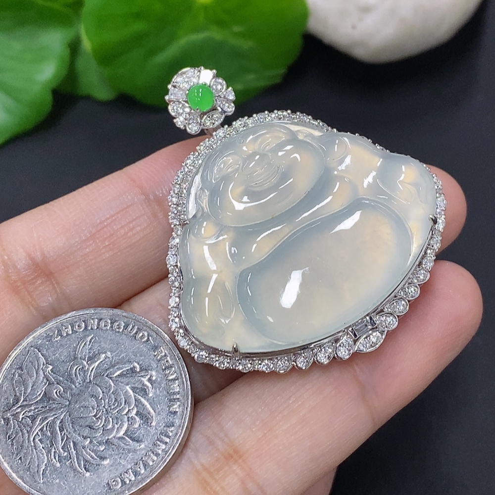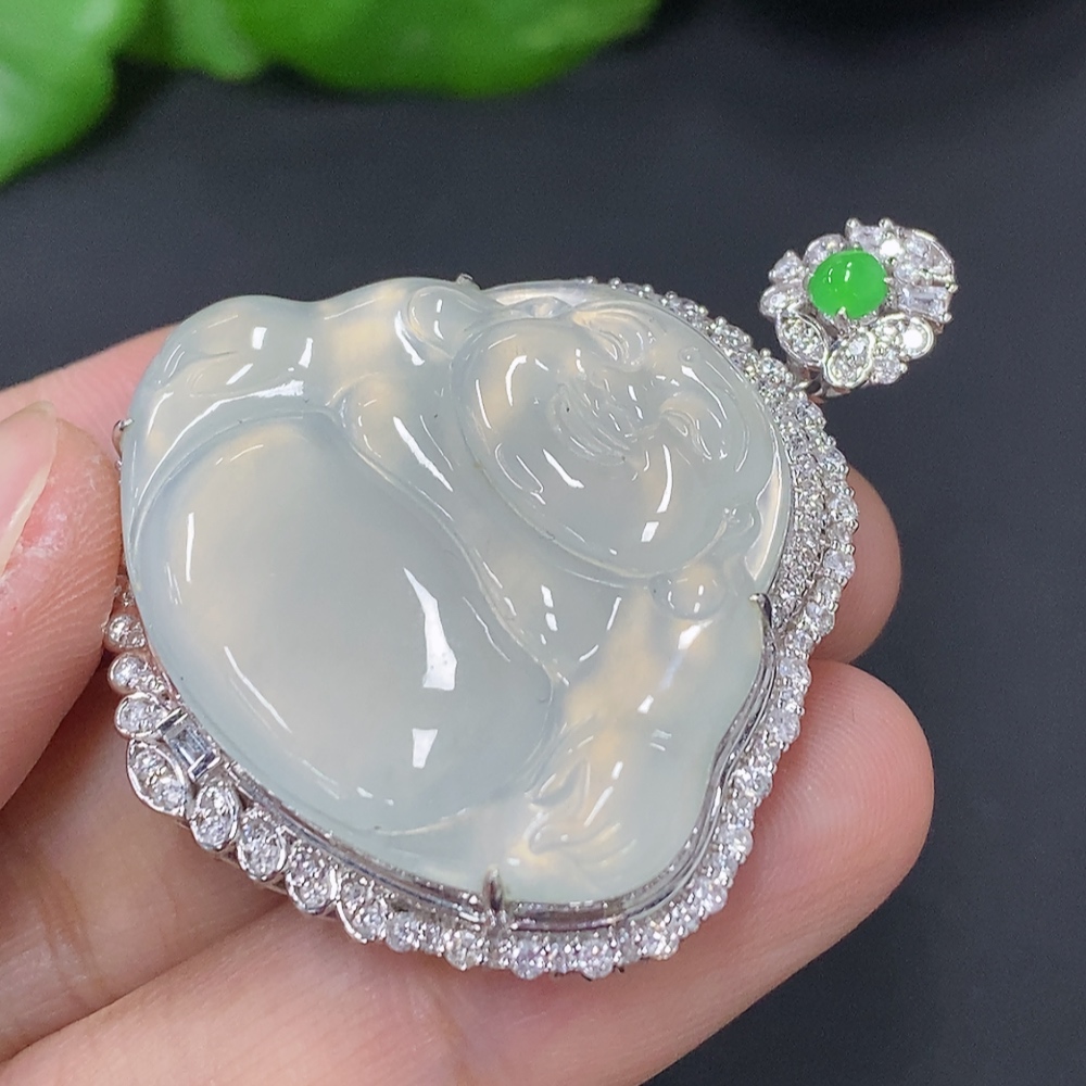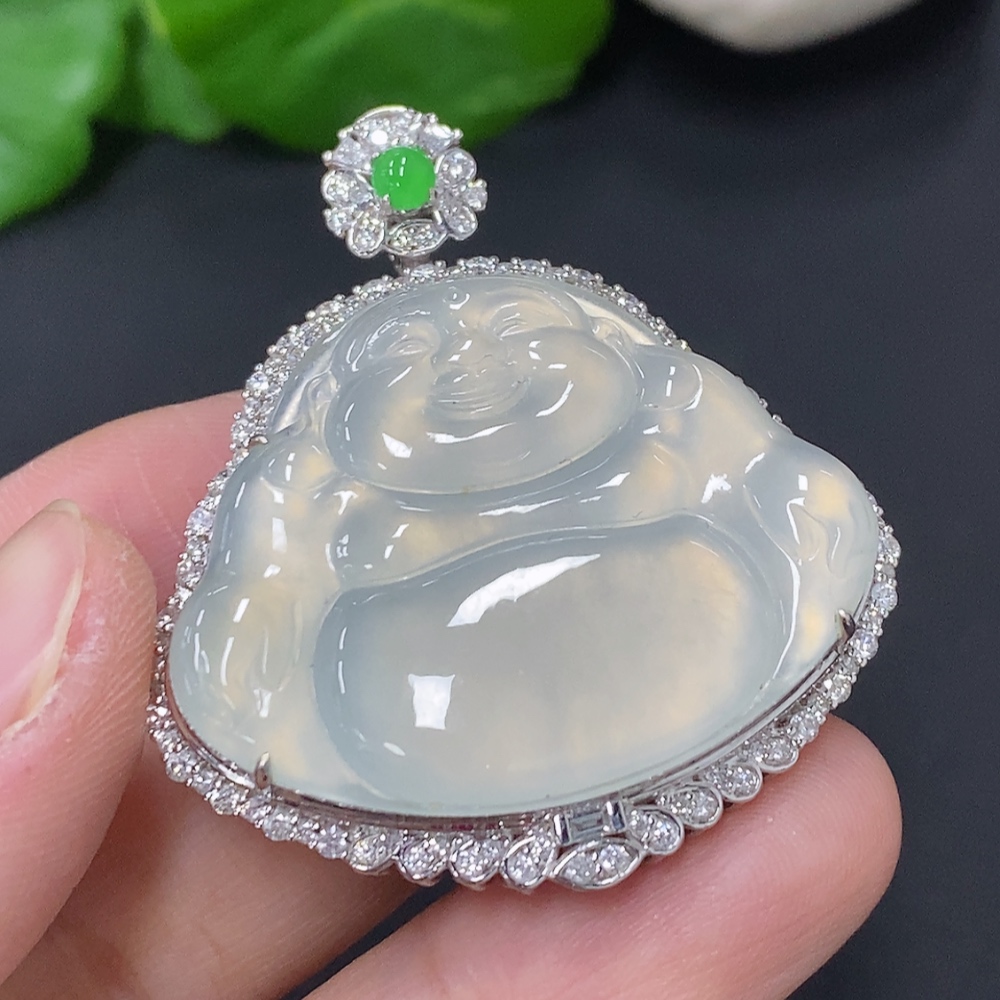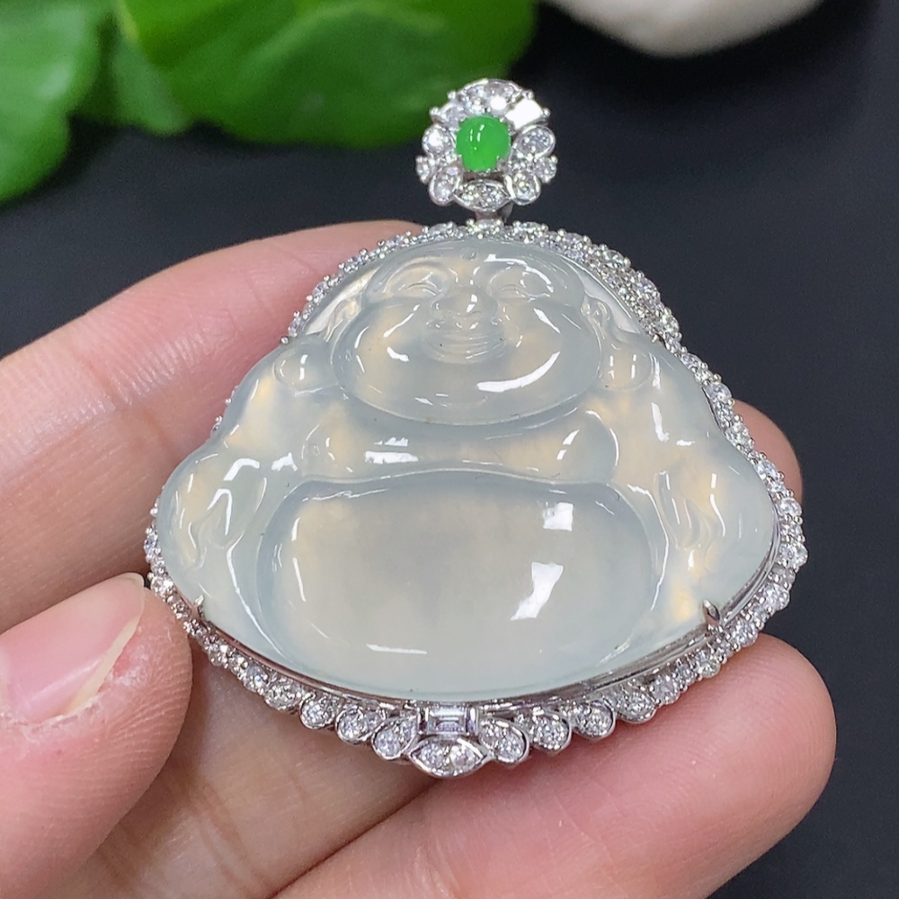 Jadeite Buddha Pendant Set in 18K Gold, Total Weight Approx. 18.2g (with Diamond Accents)