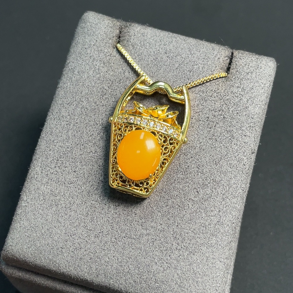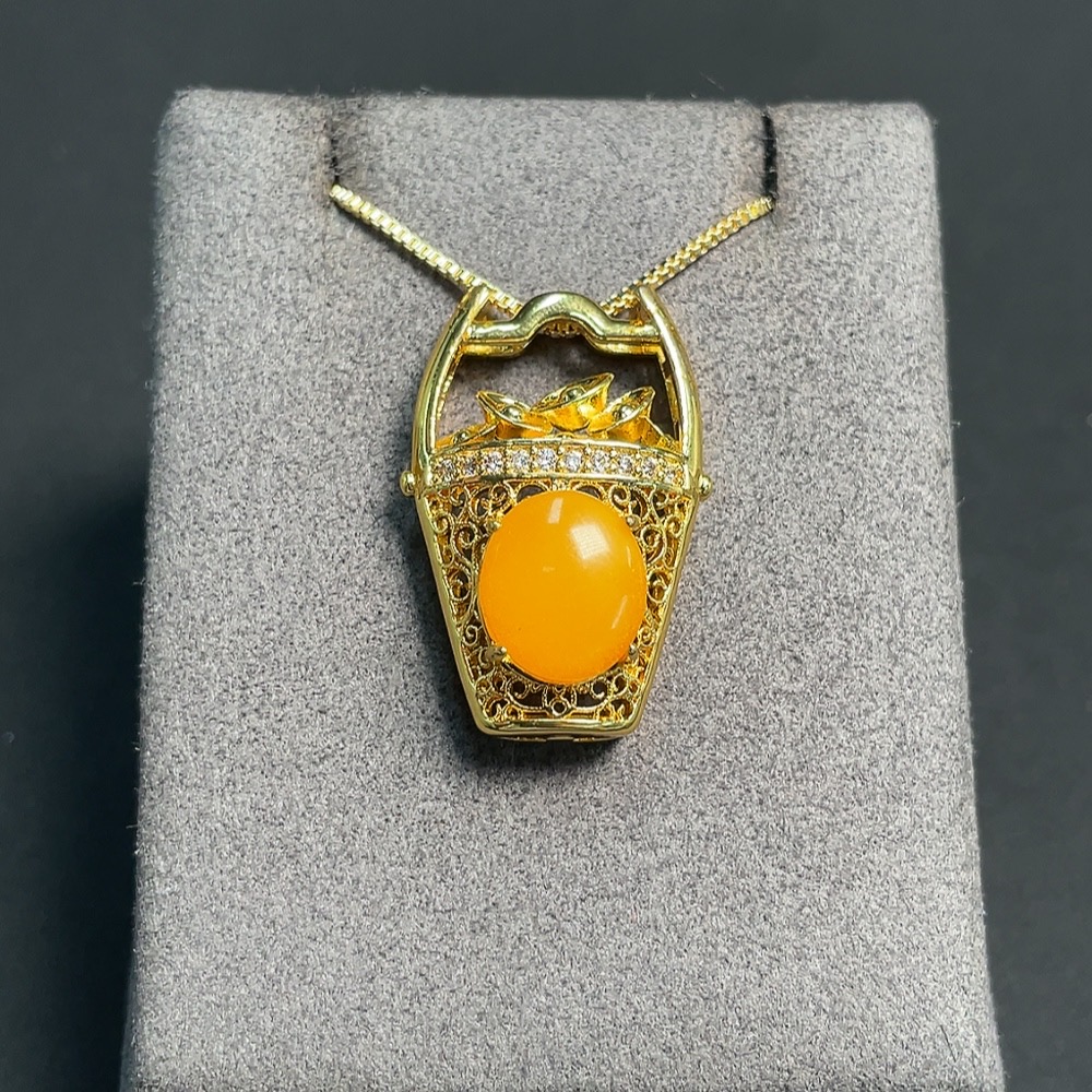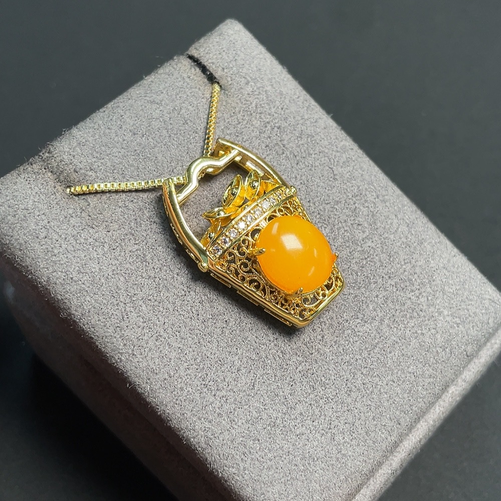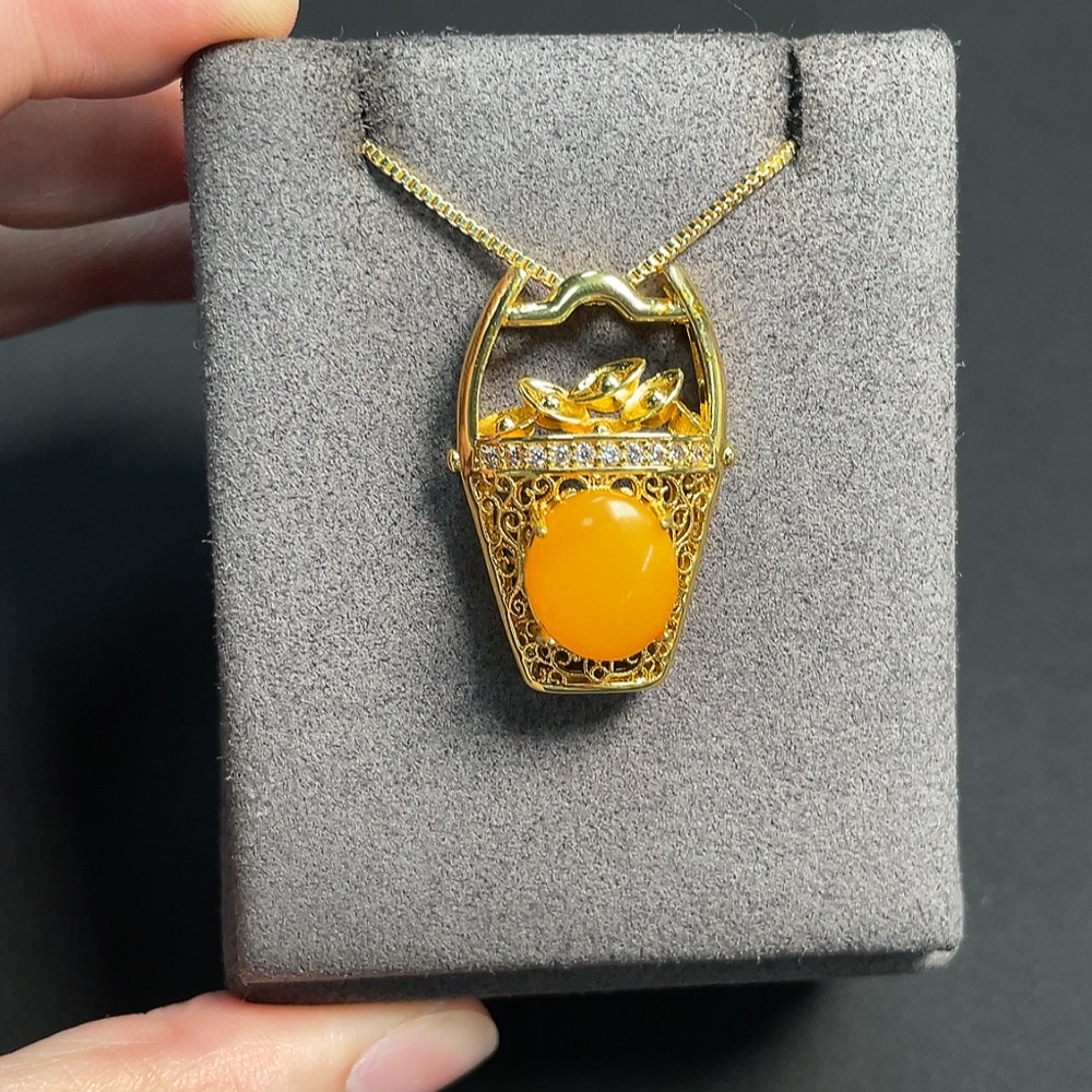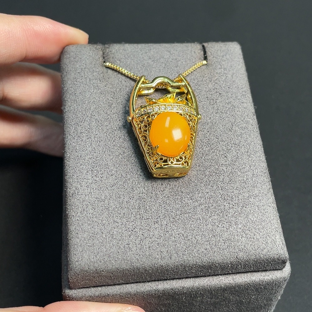 Amber and Beeswax Inlaid Pendant (Non-Gold Inlaid, Total Weight Including Chain Approx. 9.29g)
