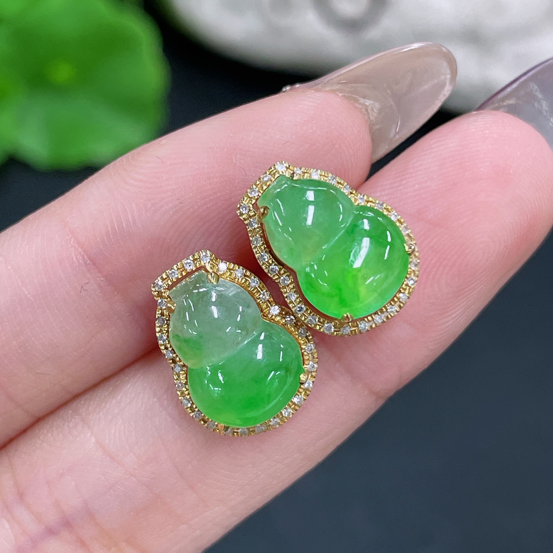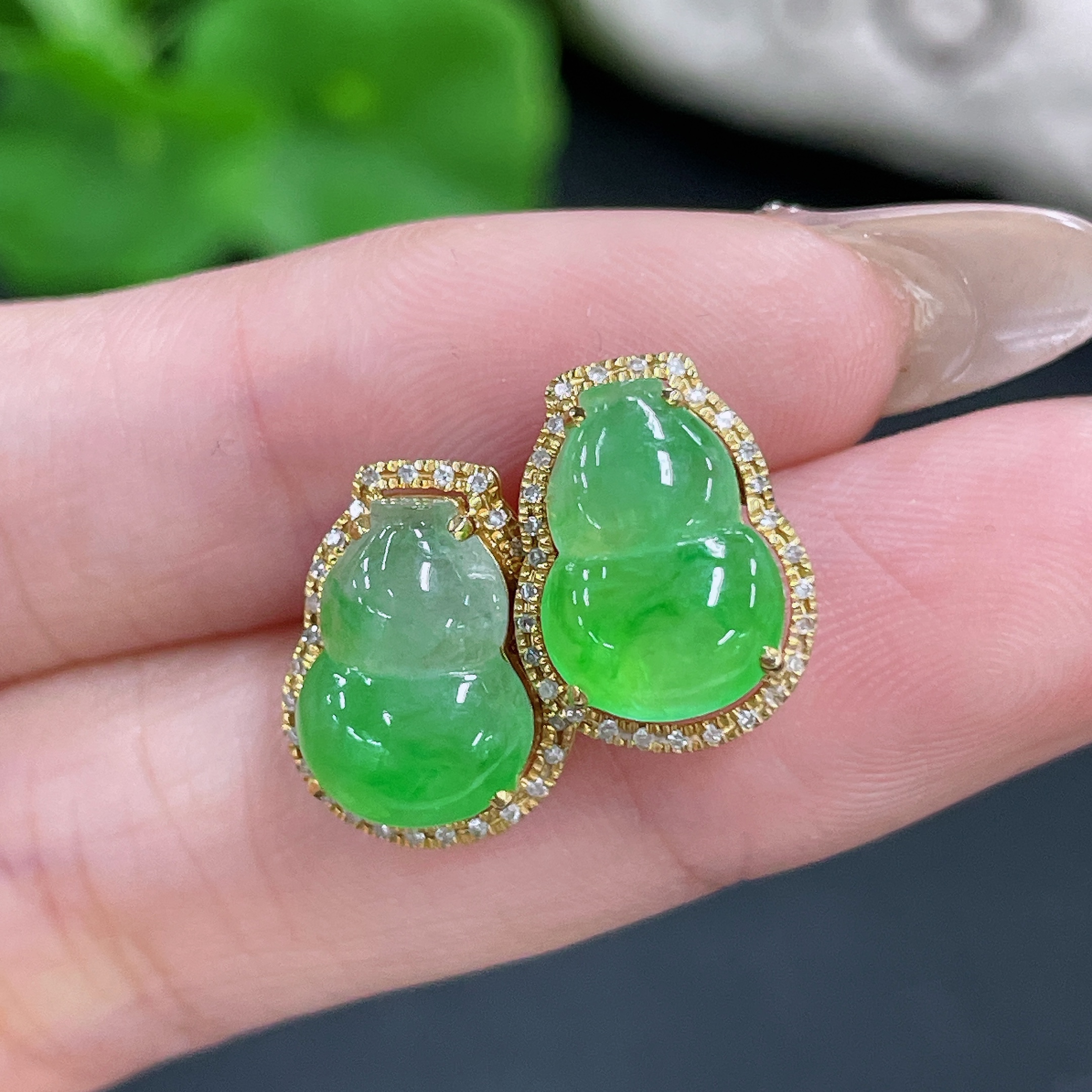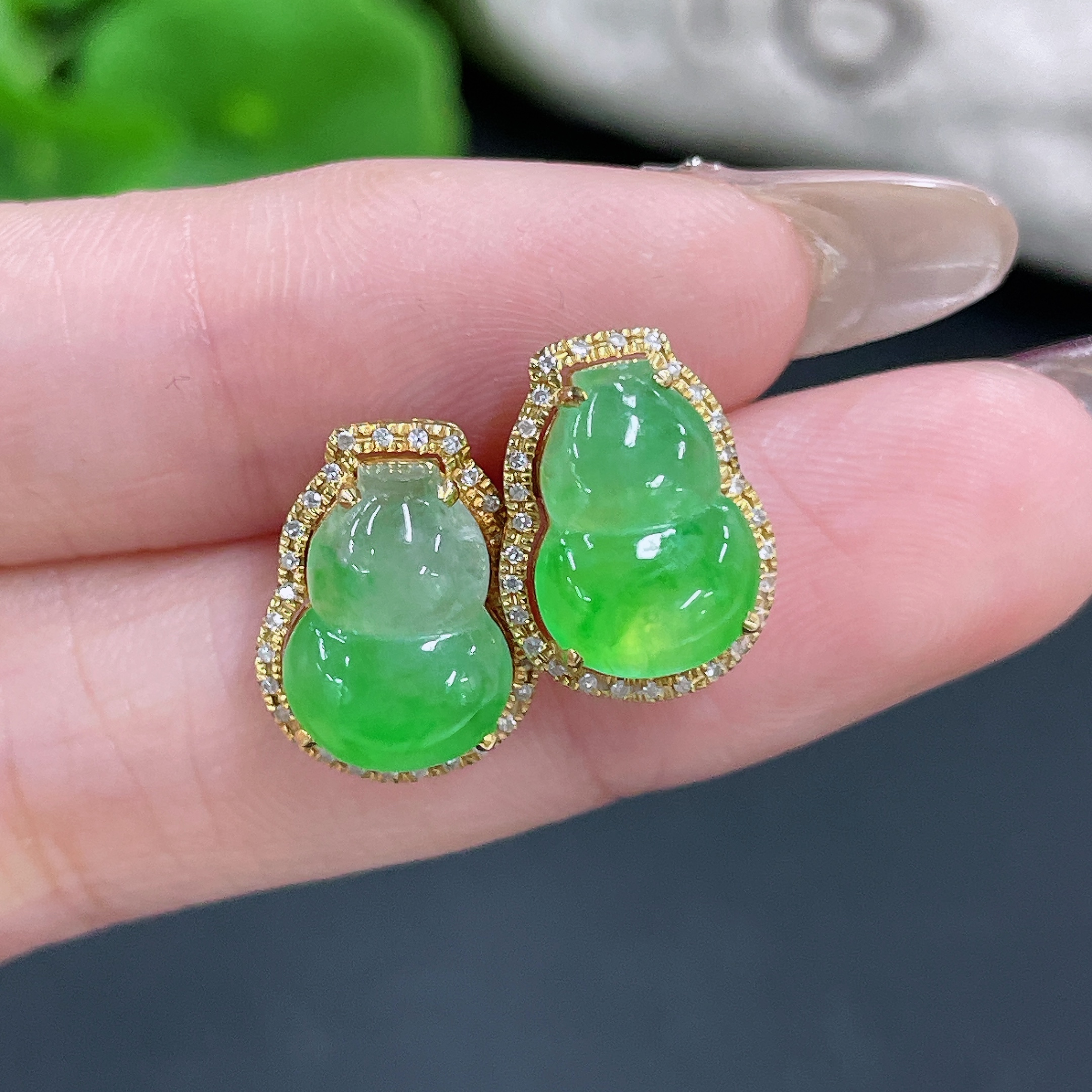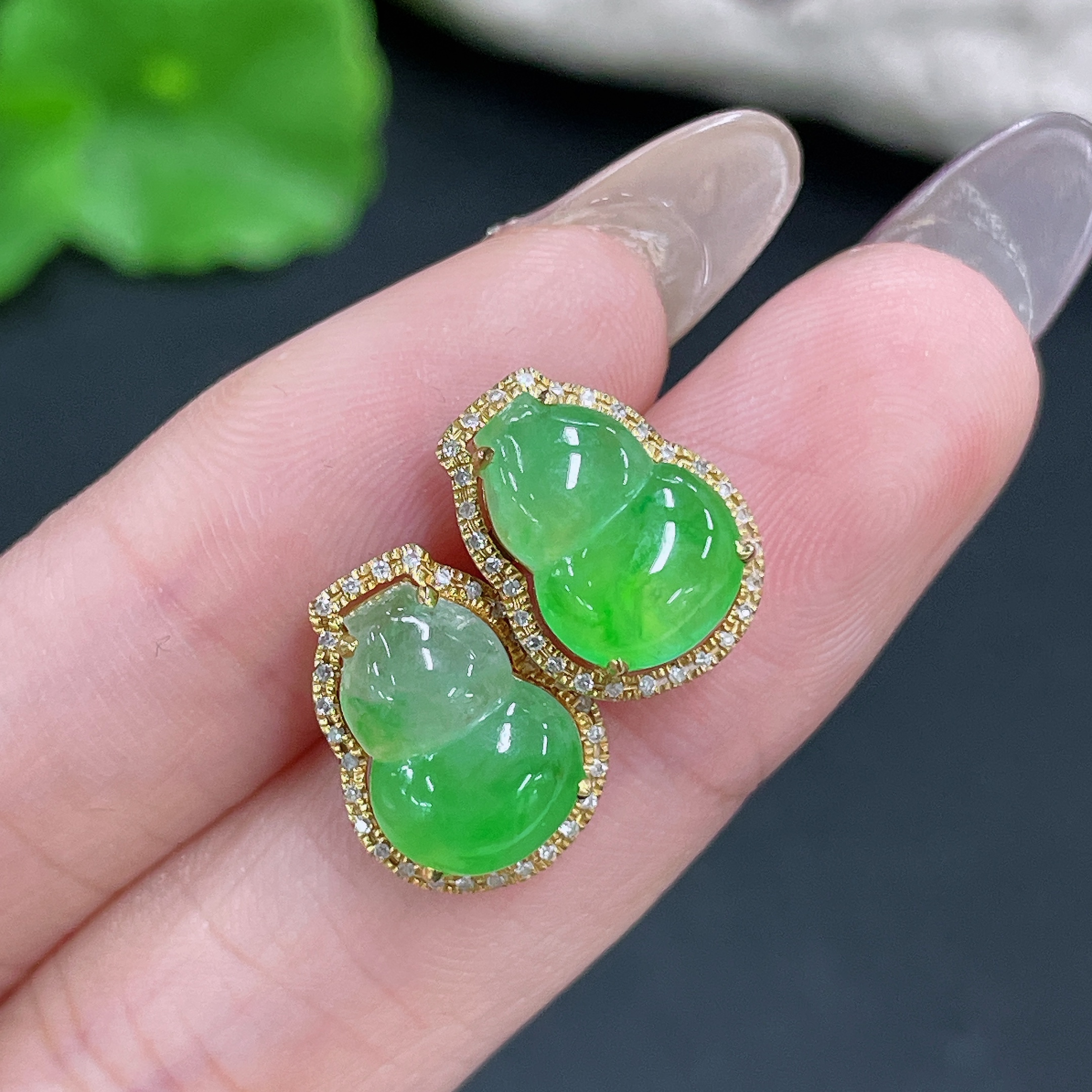Jadeite Earrings No Hallmark Tested 18K Gold Black Parts Uncertain Accented with Diamonds Total Weight Approx. 3.33g