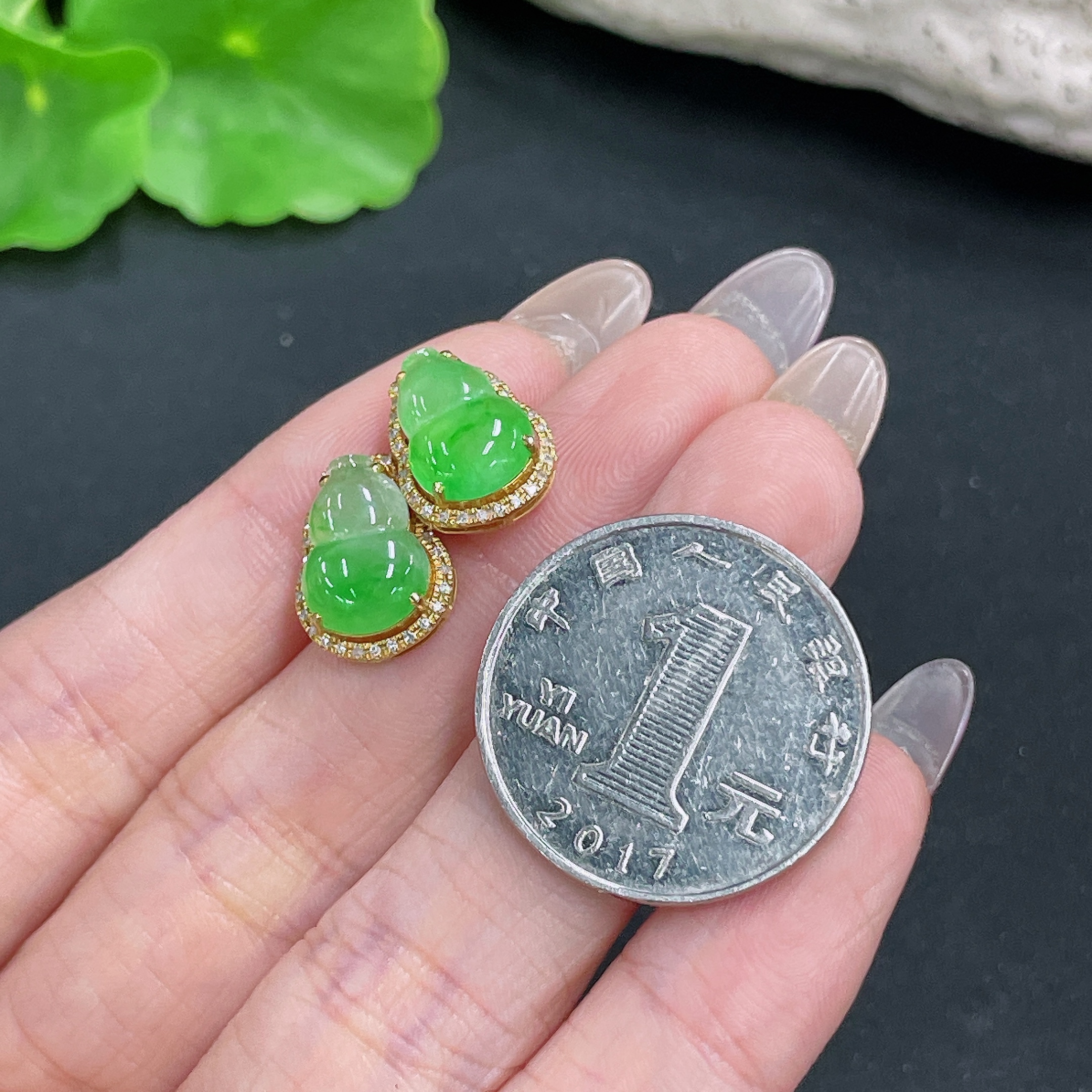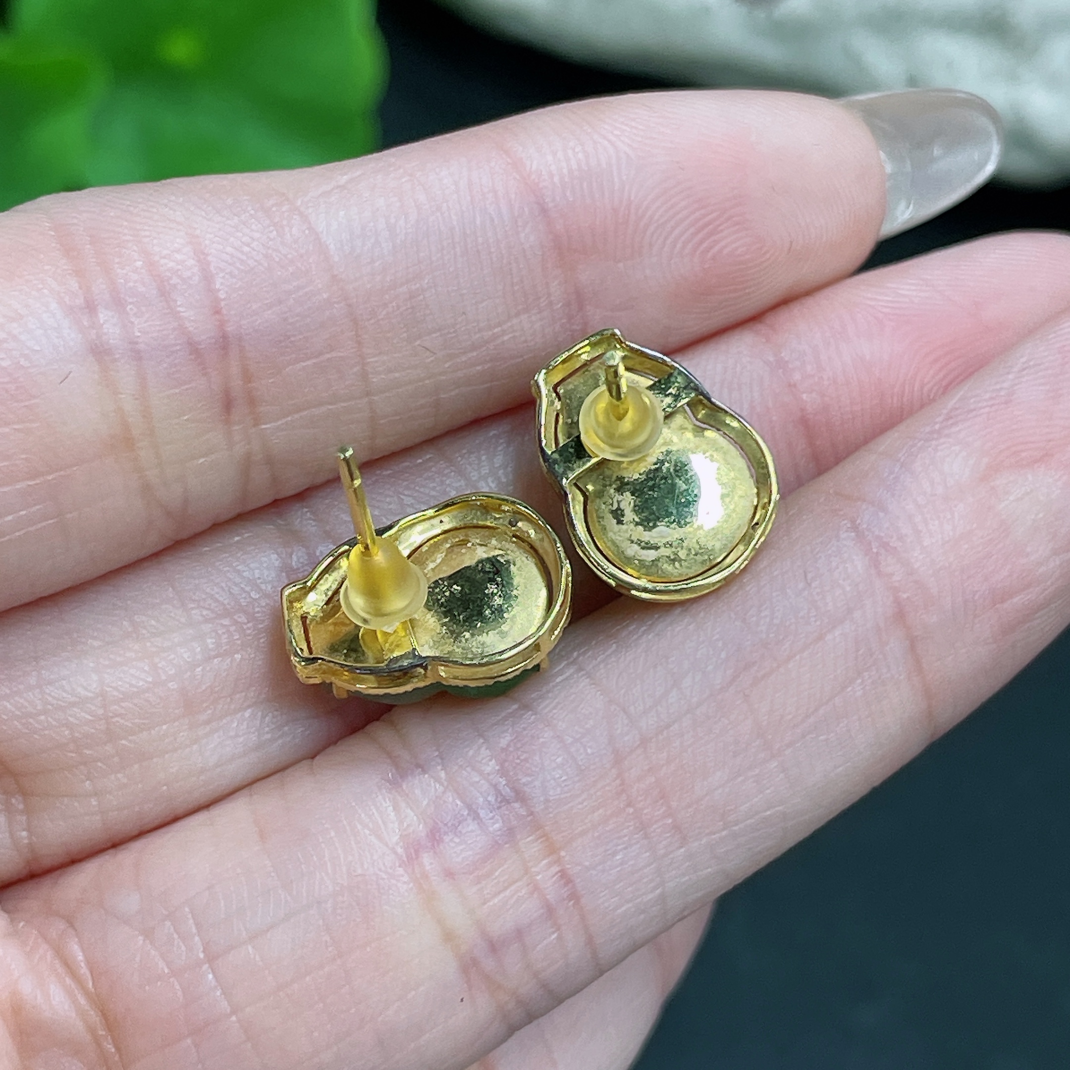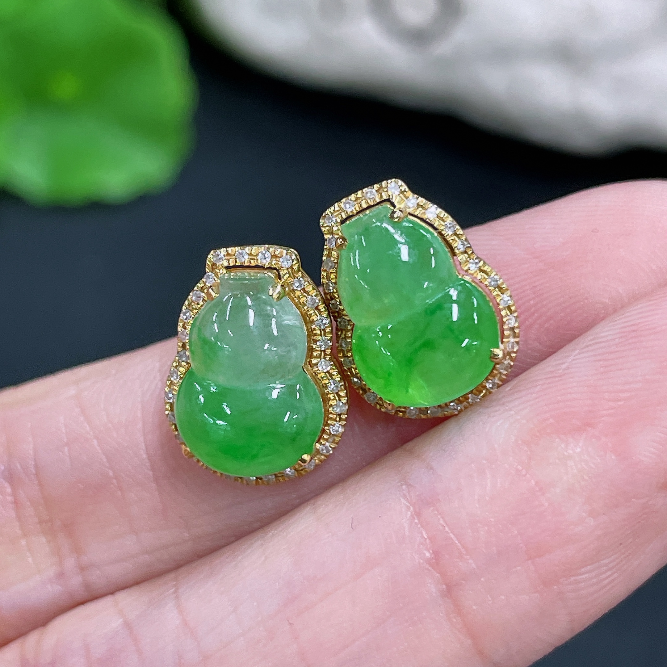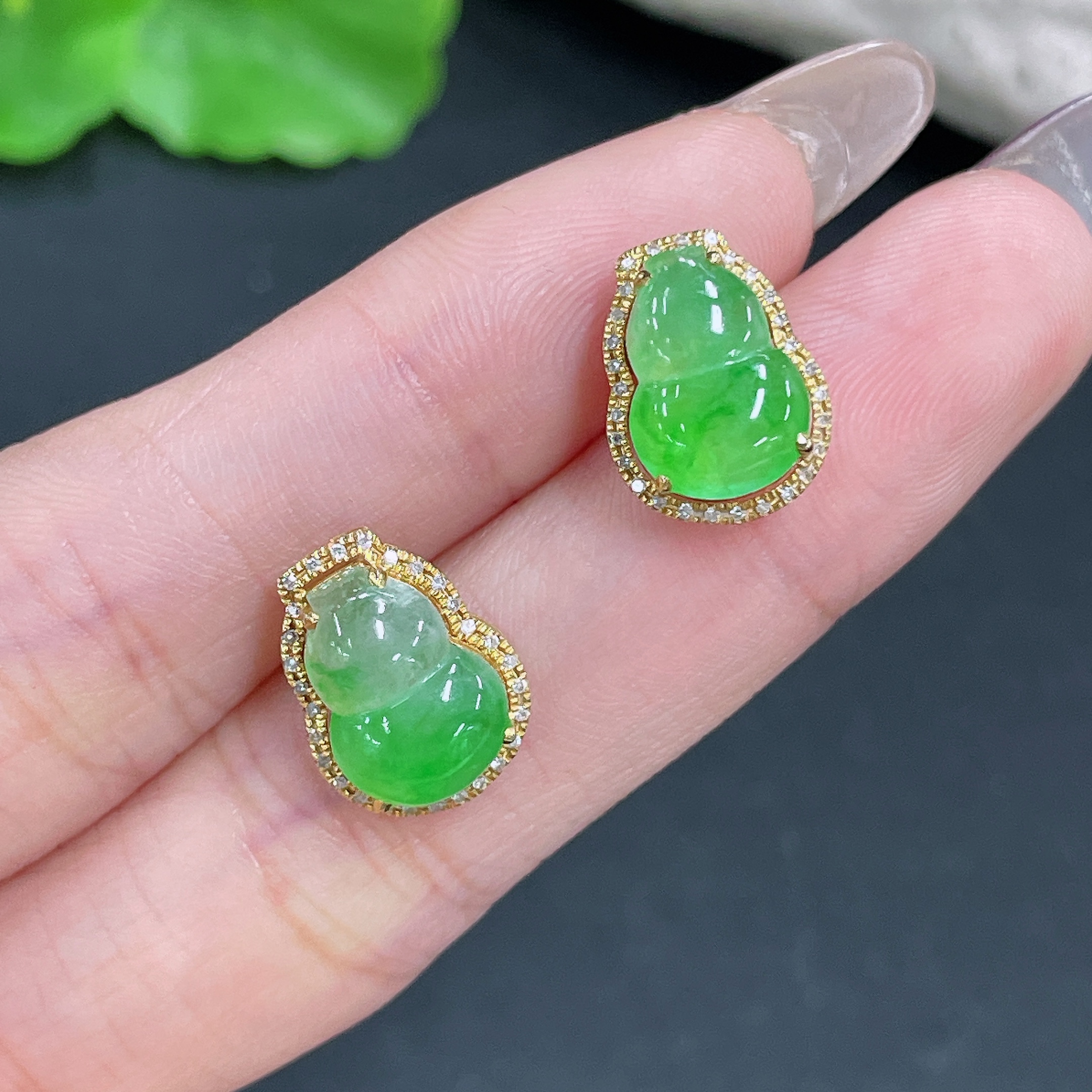 Jadeite Earrings No Hallmark Tested 18K Gold Black Parts Uncertain Accented with Diamonds Total Weight Approx. 3.33g