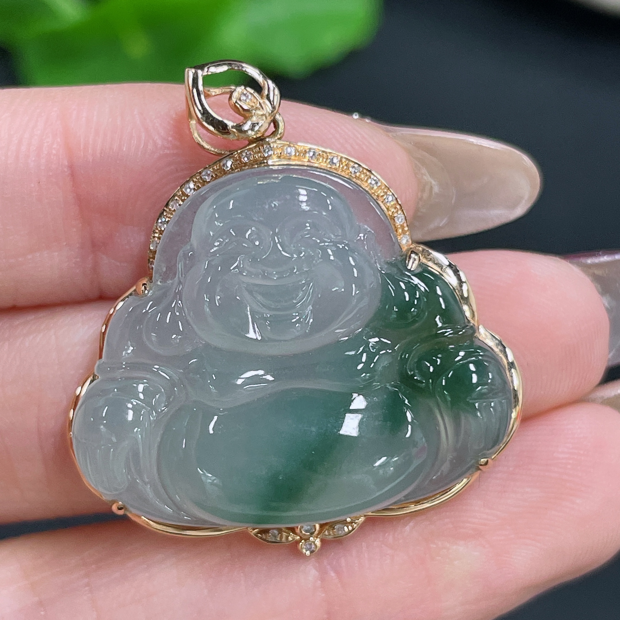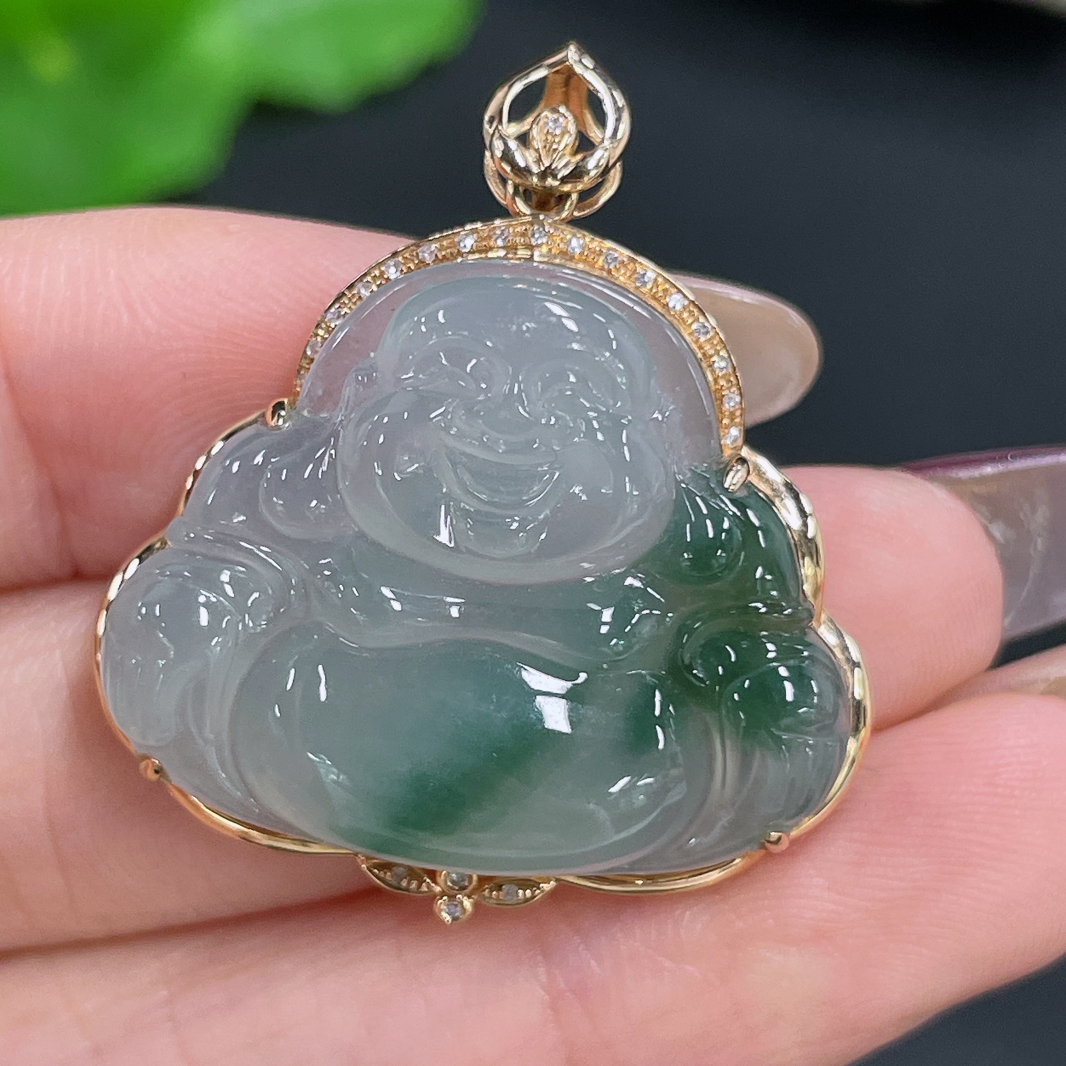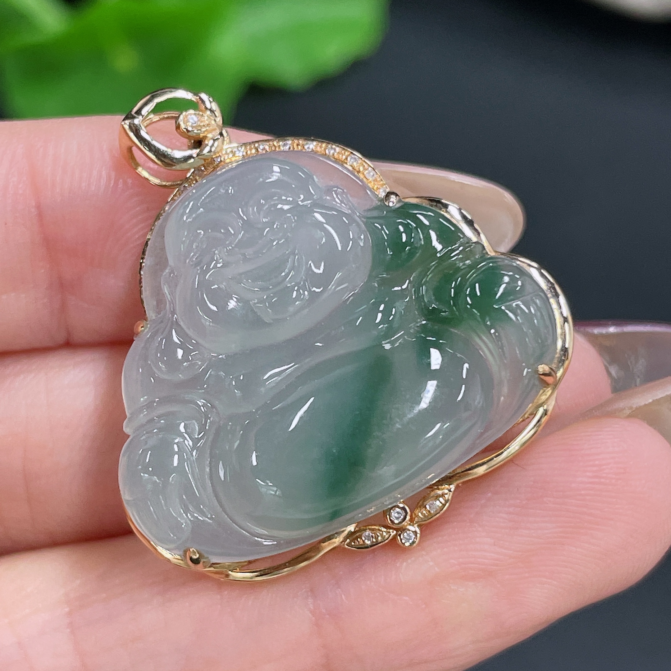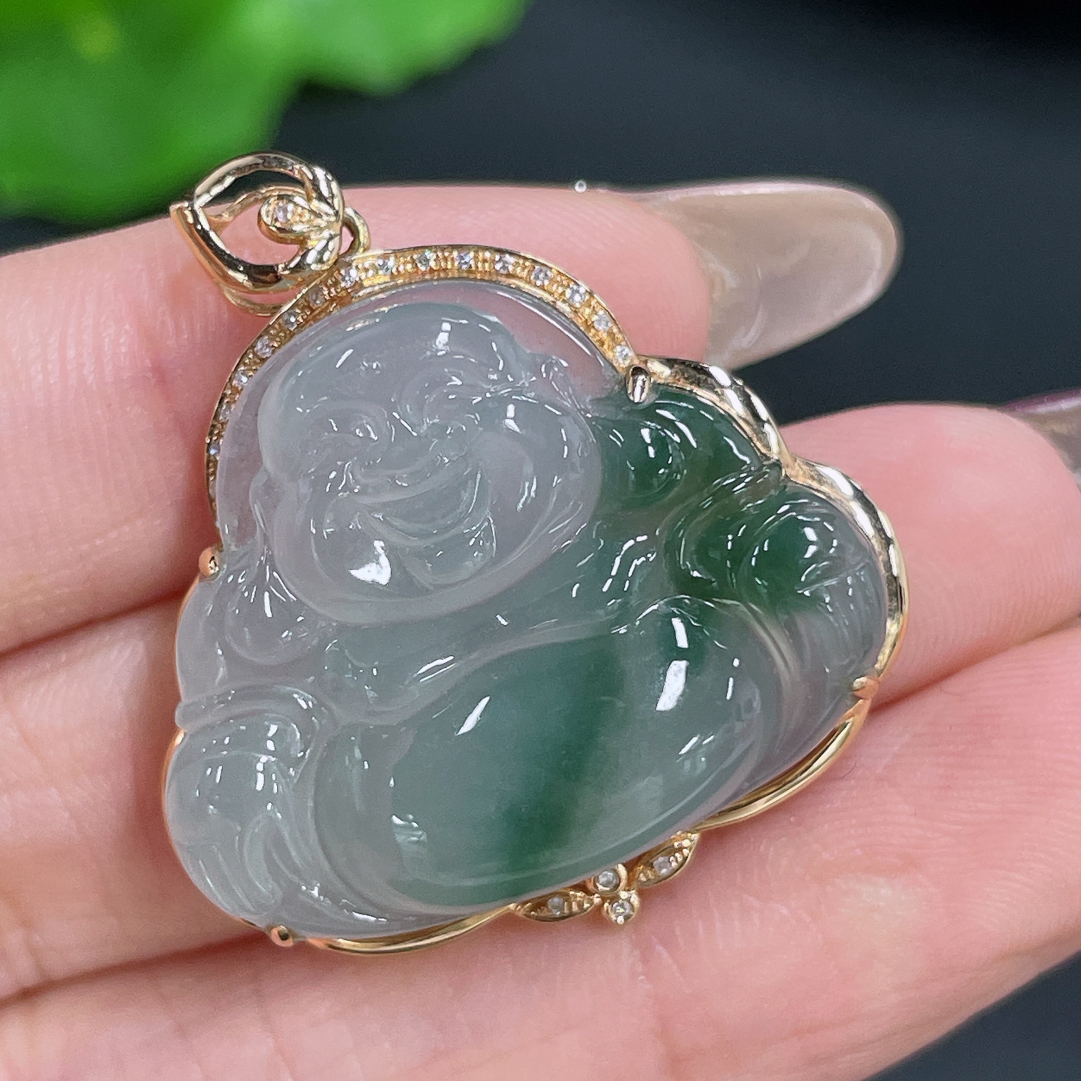 Jadeite Pendant Buddha 18K Gold Inlaid with Diamonds Total Weight Approx. 6.44g