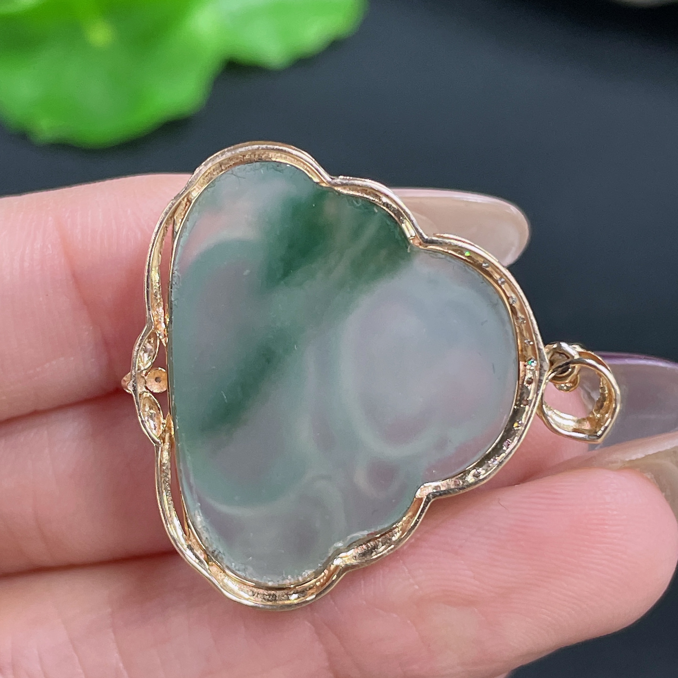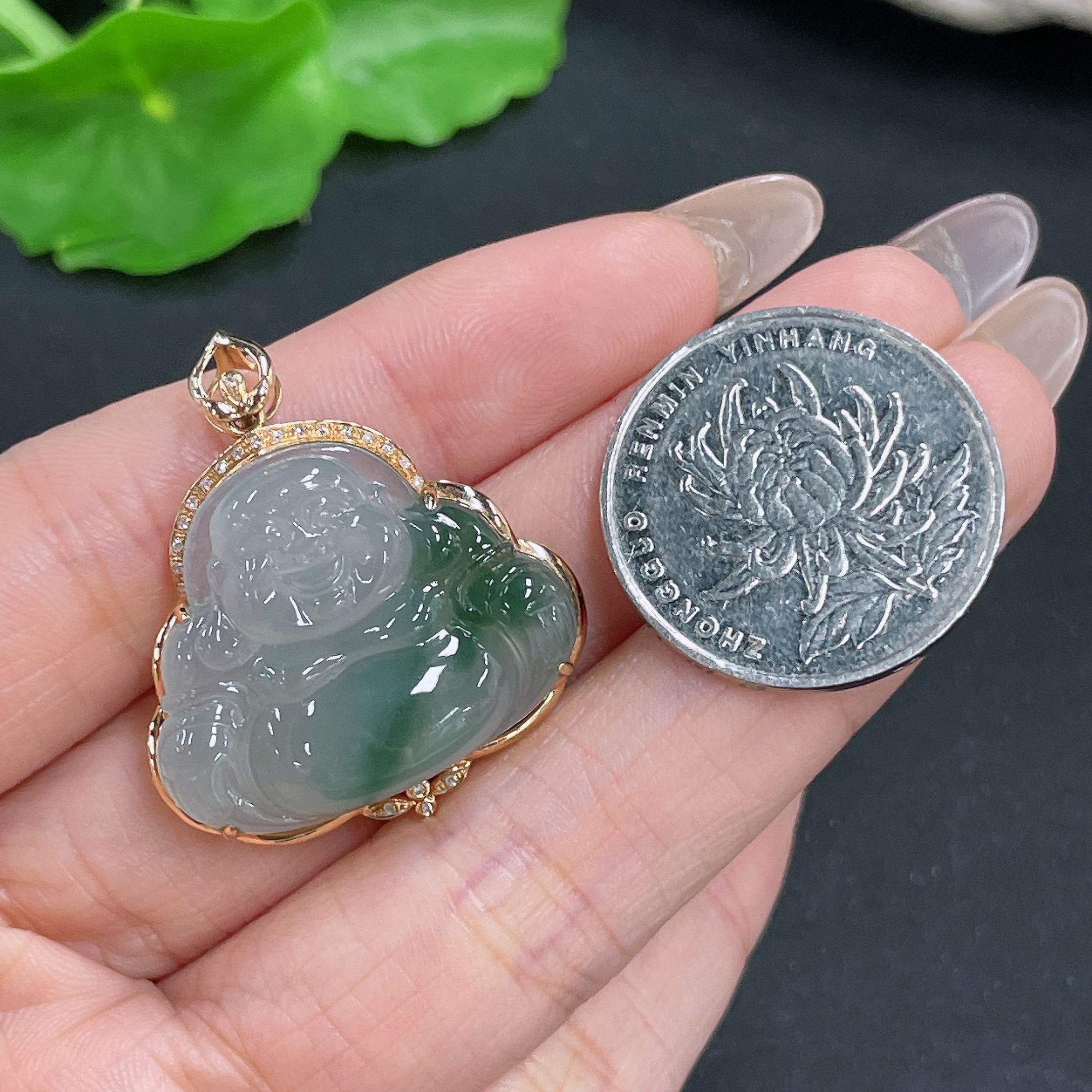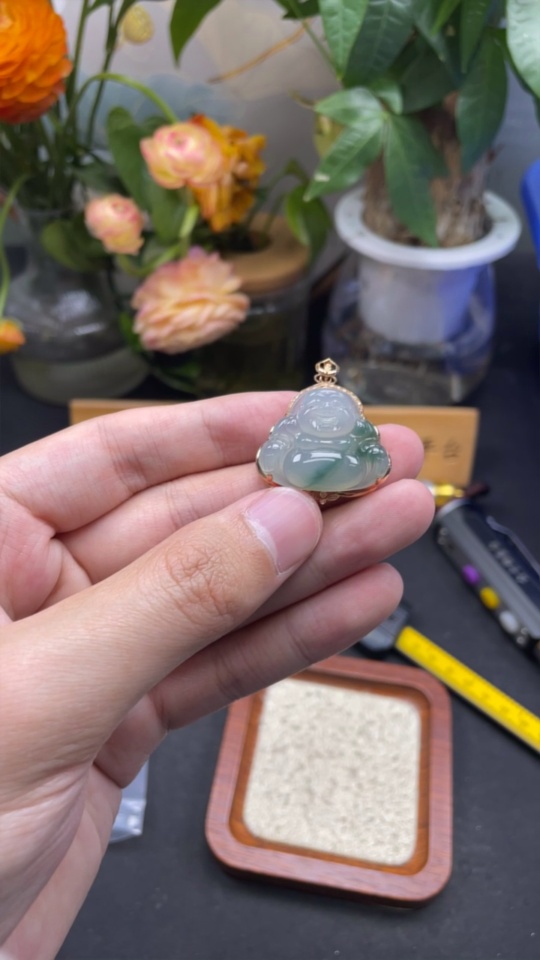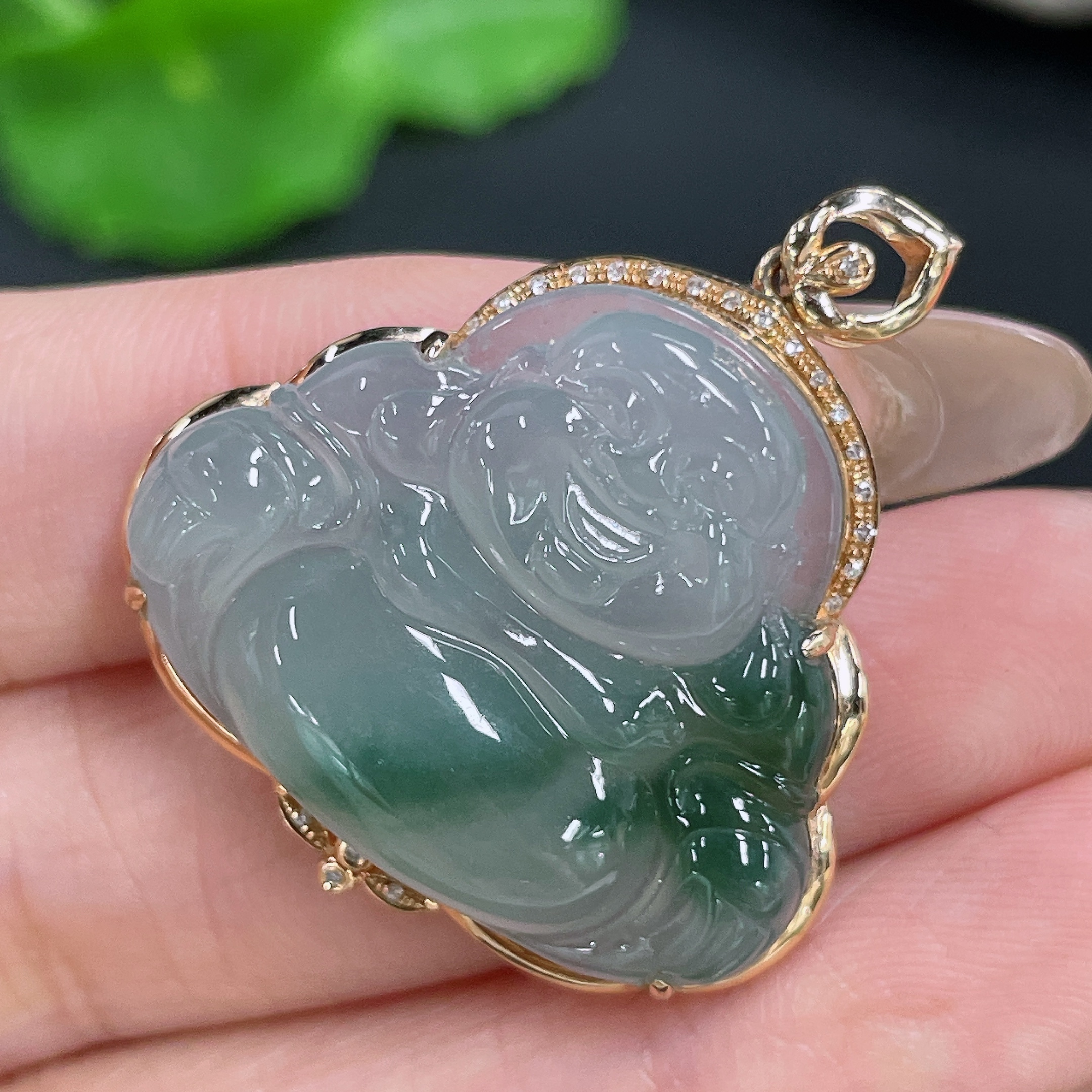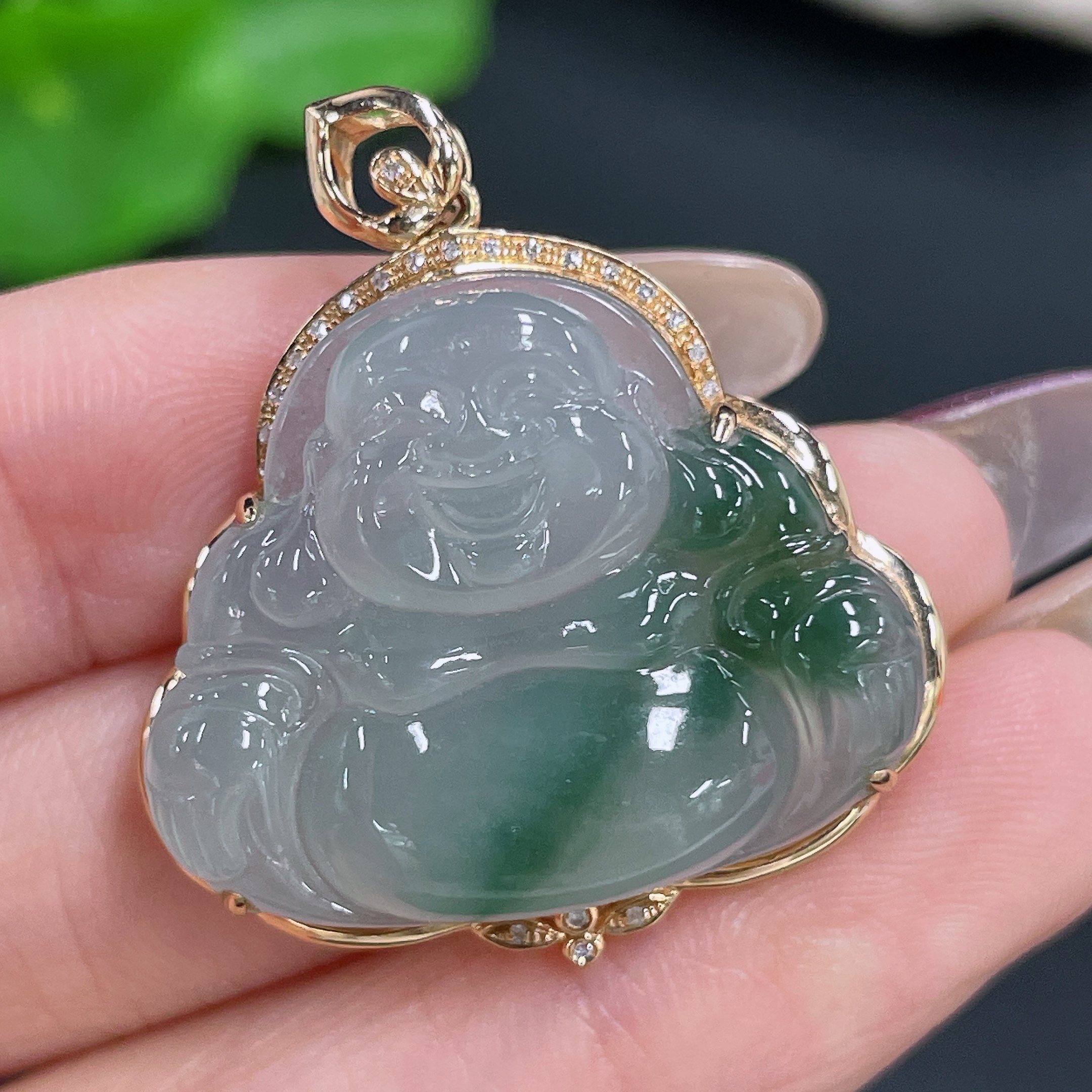 Jadeite Pendant Buddha 18K Gold Inlaid with Diamonds Total Weight Approx. 6.44g