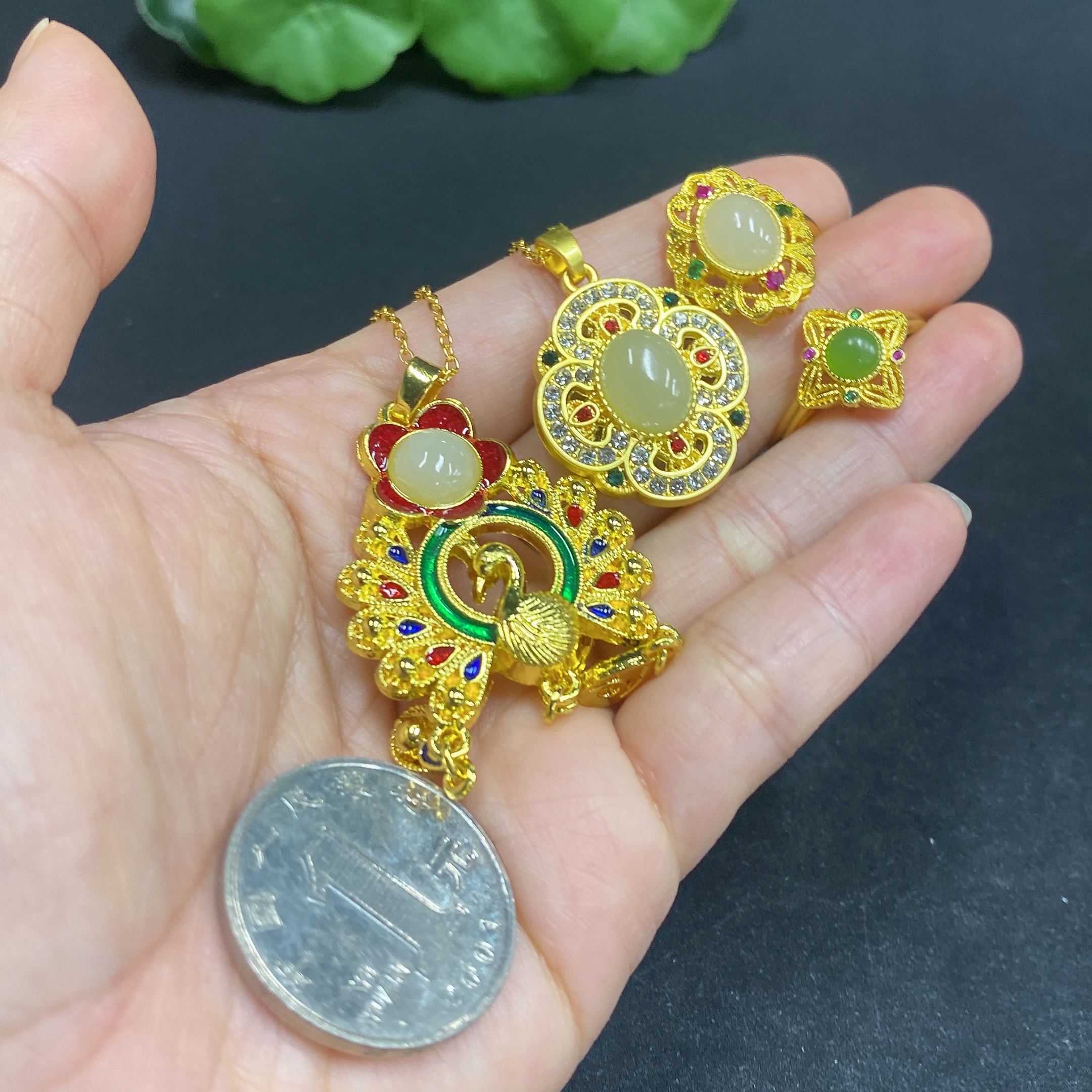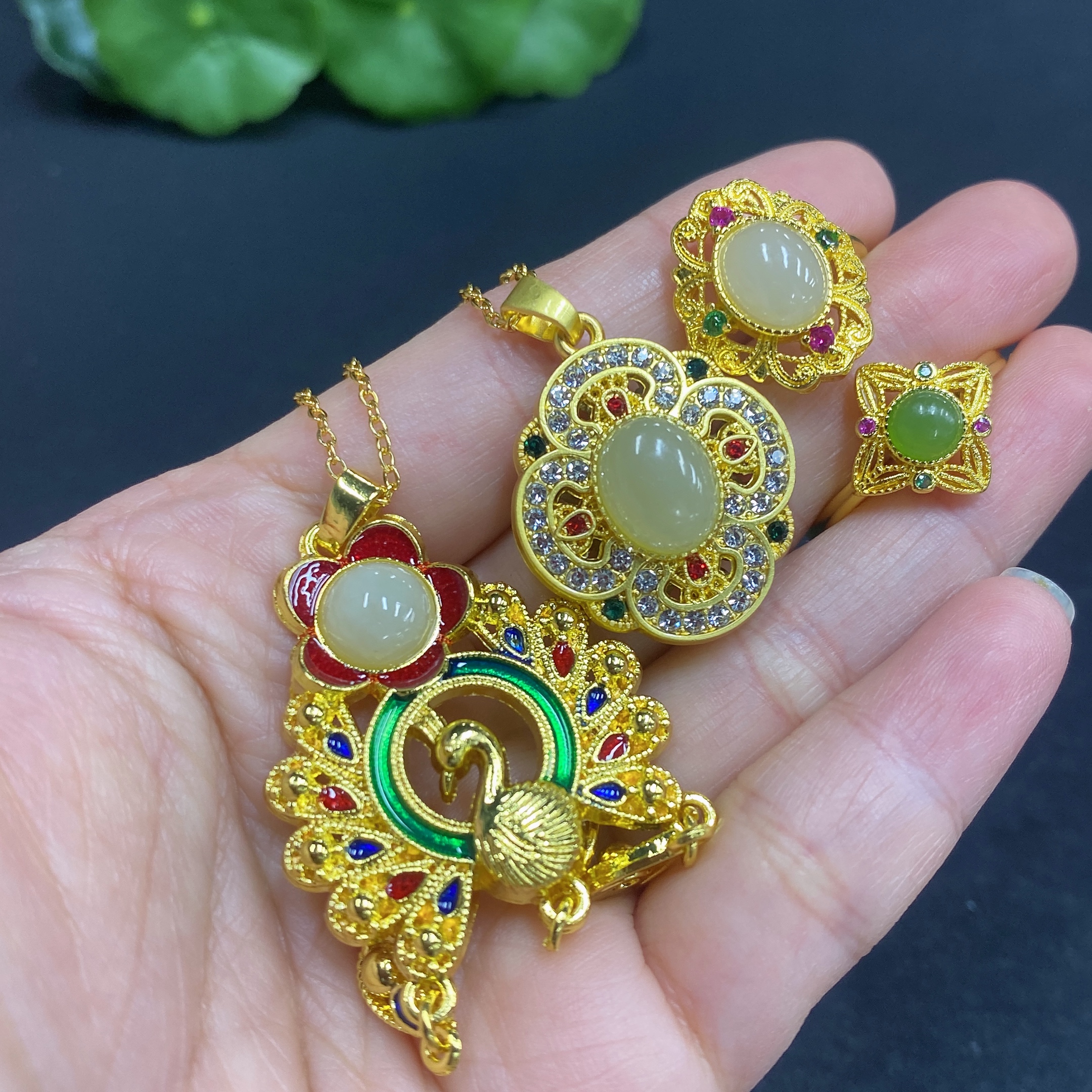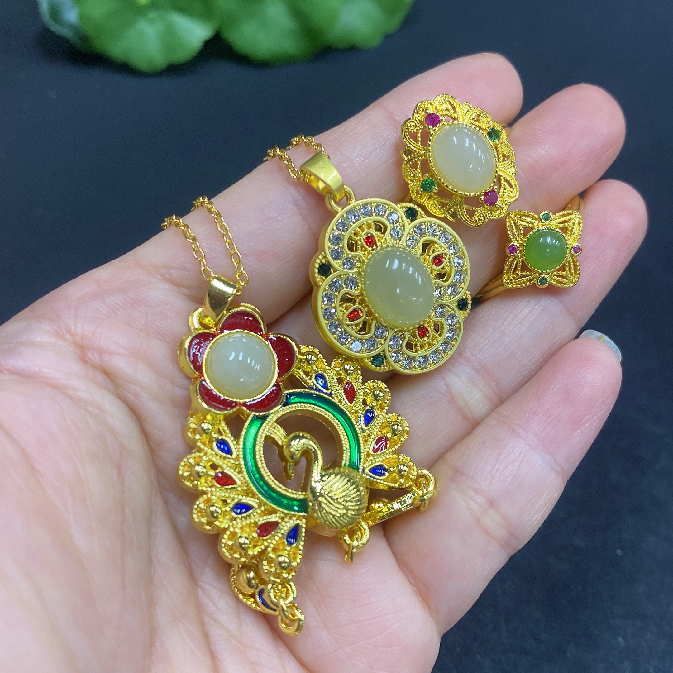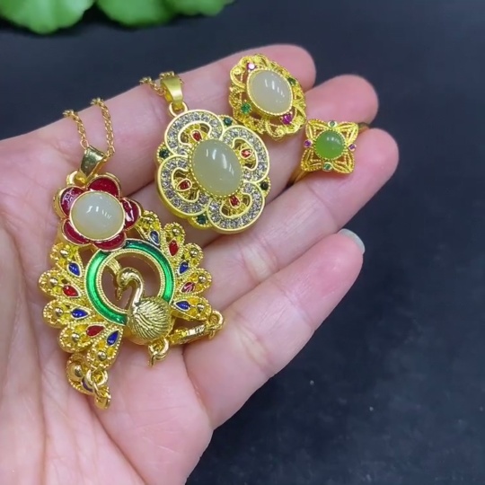 Hetian Jade Inlaid Pendant with Adjustable Ring, Non-Gold Inlay, Non-Gold Chain, Total Weight Approx. 21.5g (Including Chain)