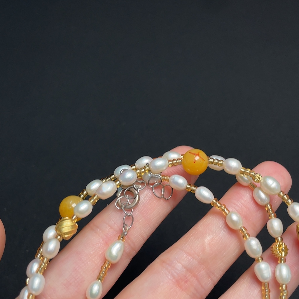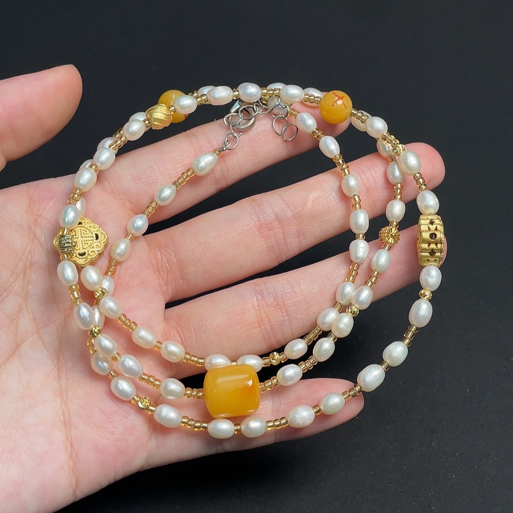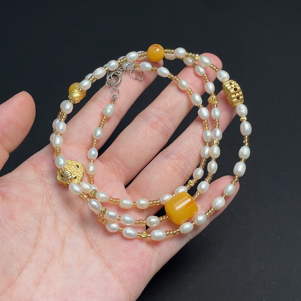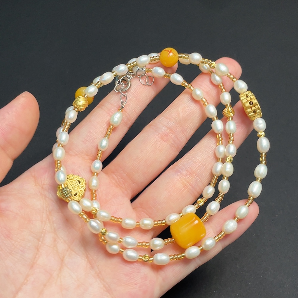 Amber and Beeswax Bead Necklace with Pearls and Non-Natural Gemstones, Non-Gold, Total Weight Approximately 21.01g
