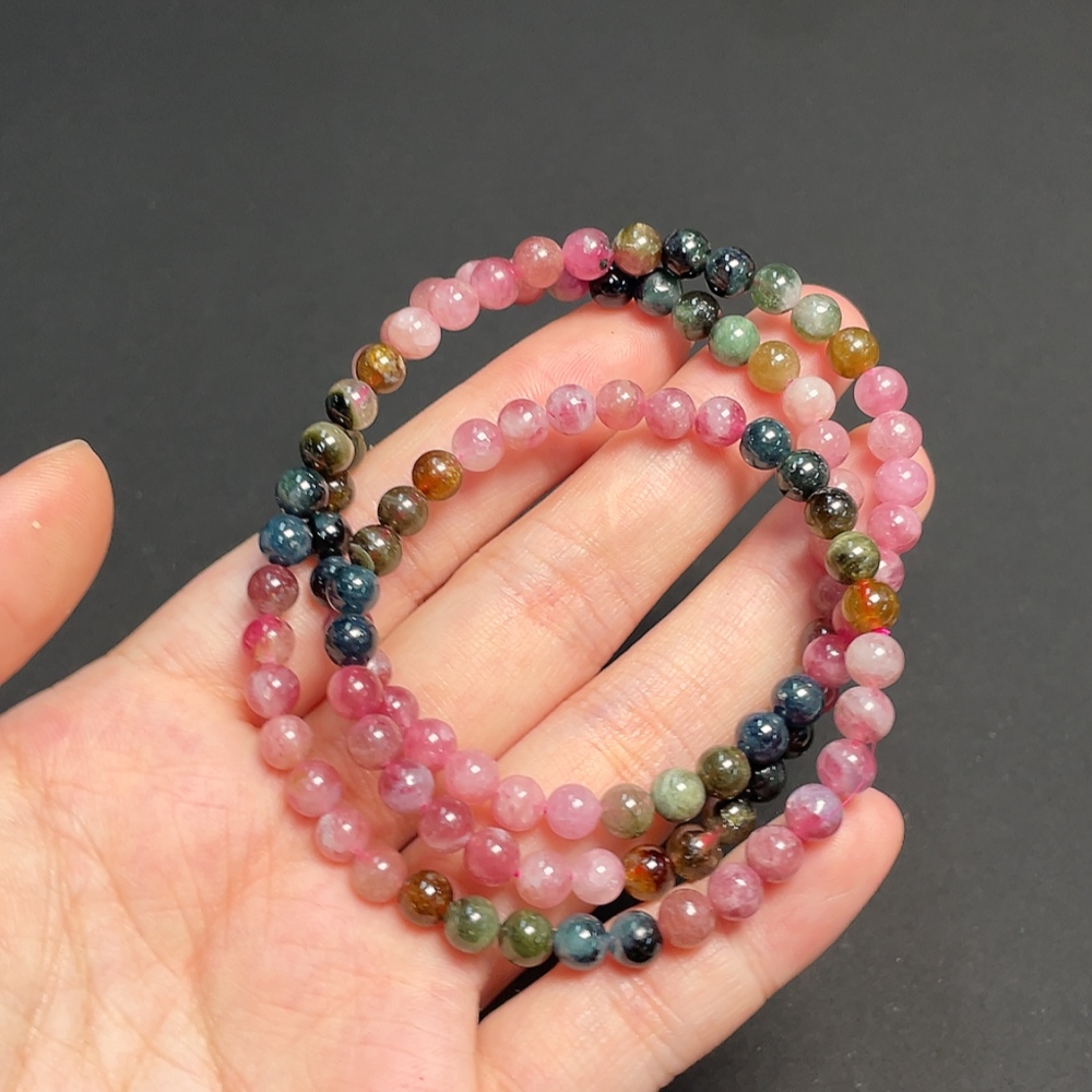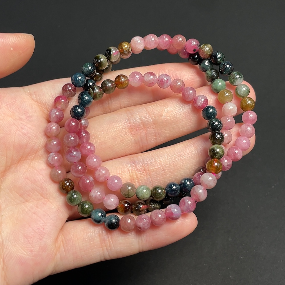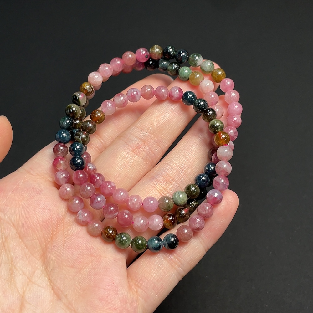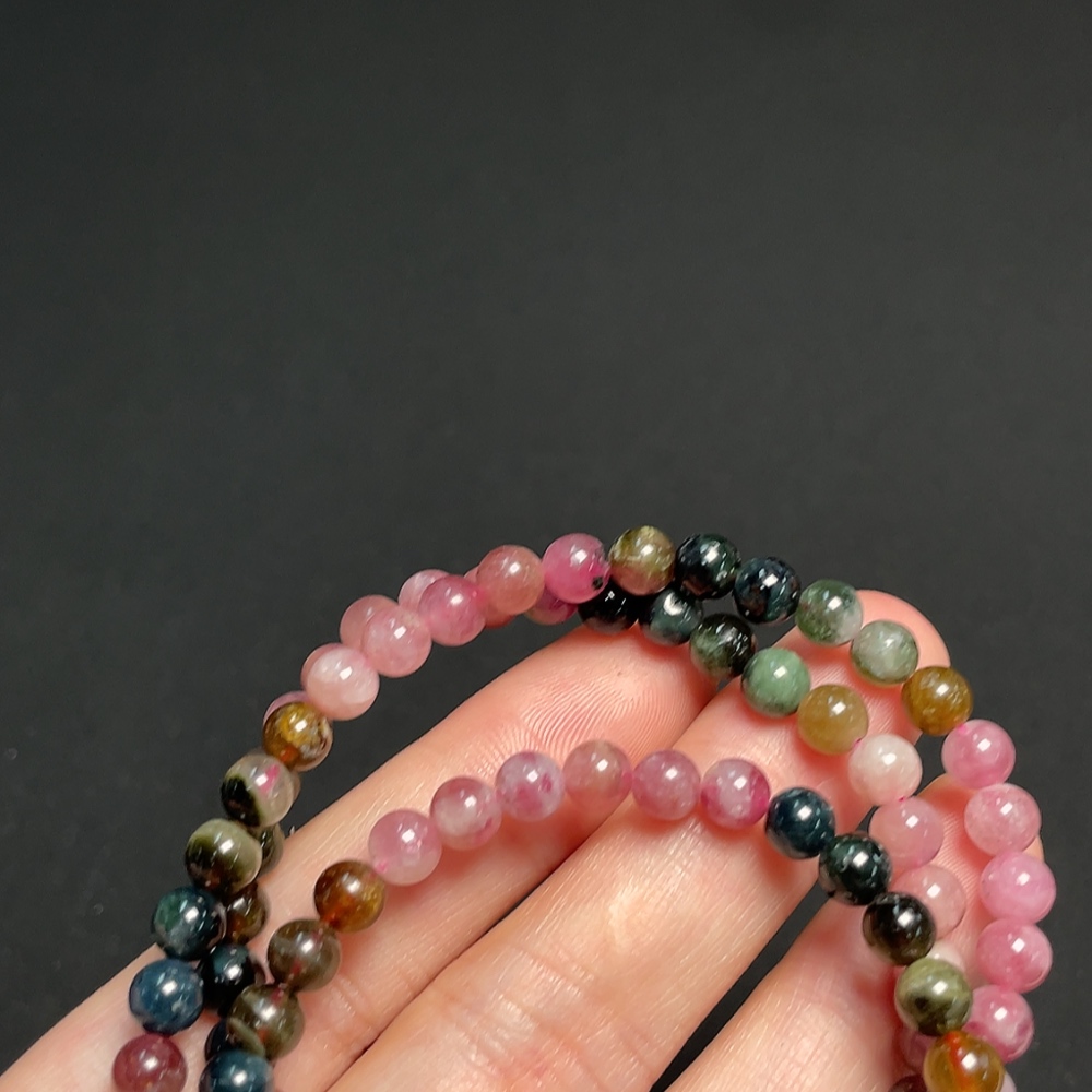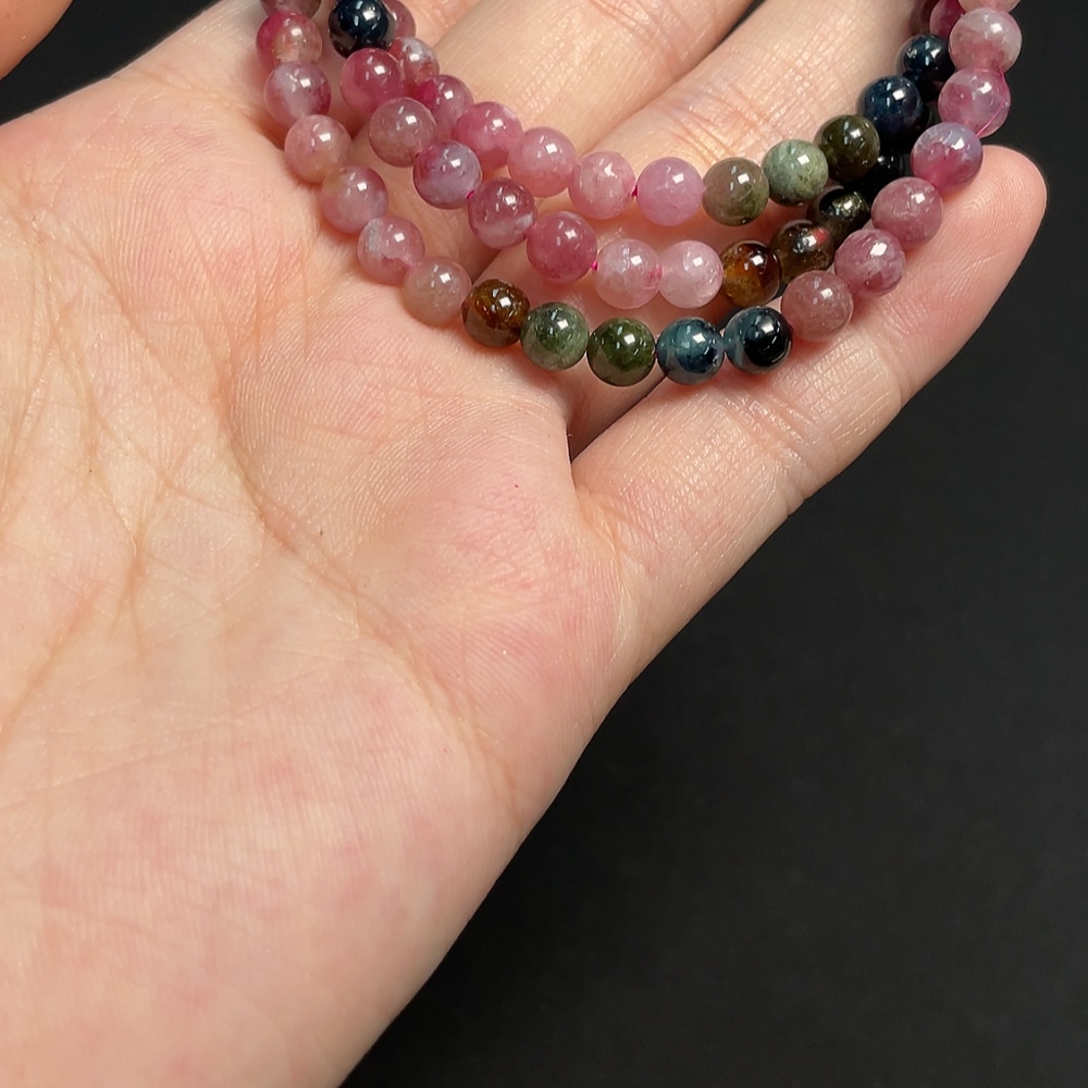 Tourmaline bead strand containing other mineral components with visible organic matter, total weight approximately 23.38g, size about 5.3mm