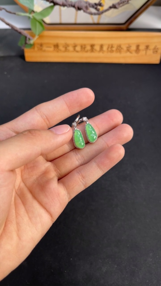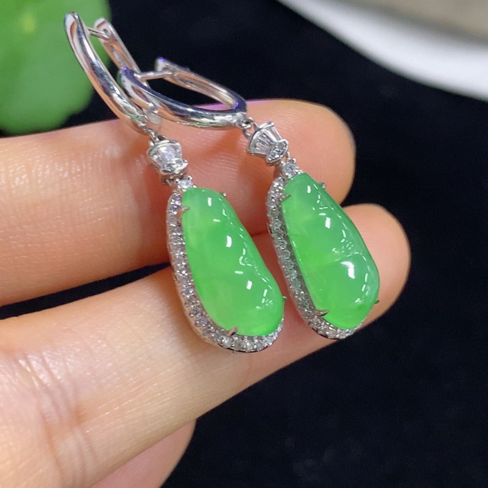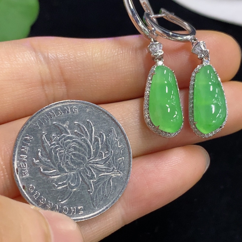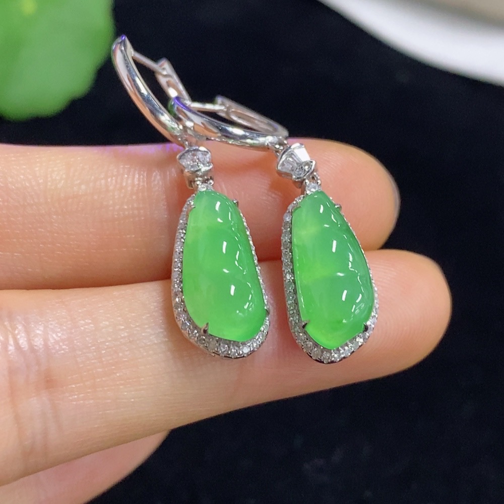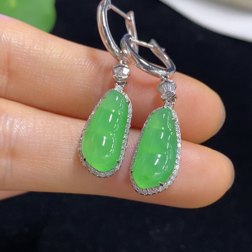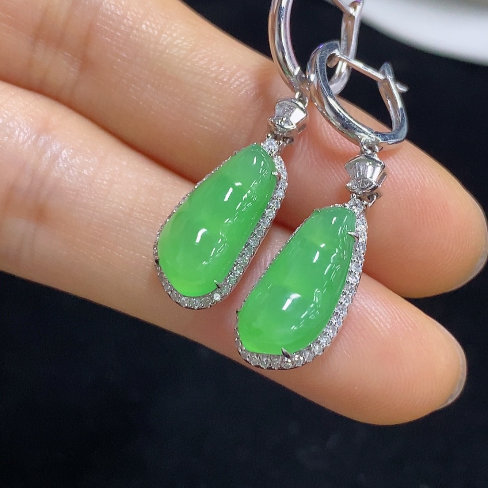 Jadeite earrings set in 18k gold with diamond accents, total weight approximately 5.42 grams