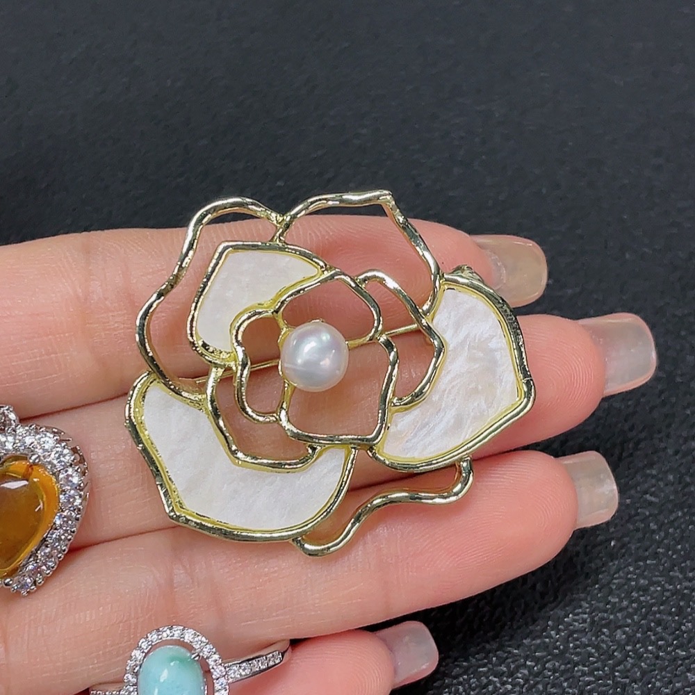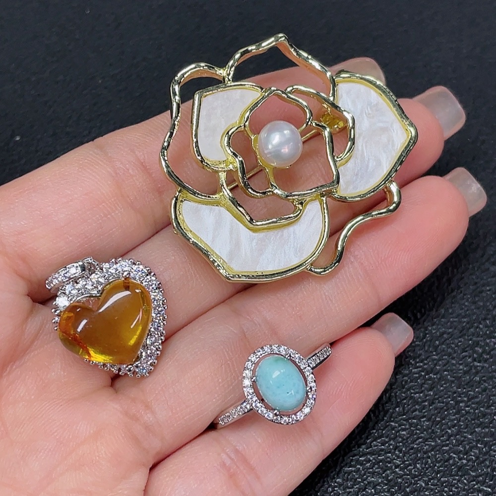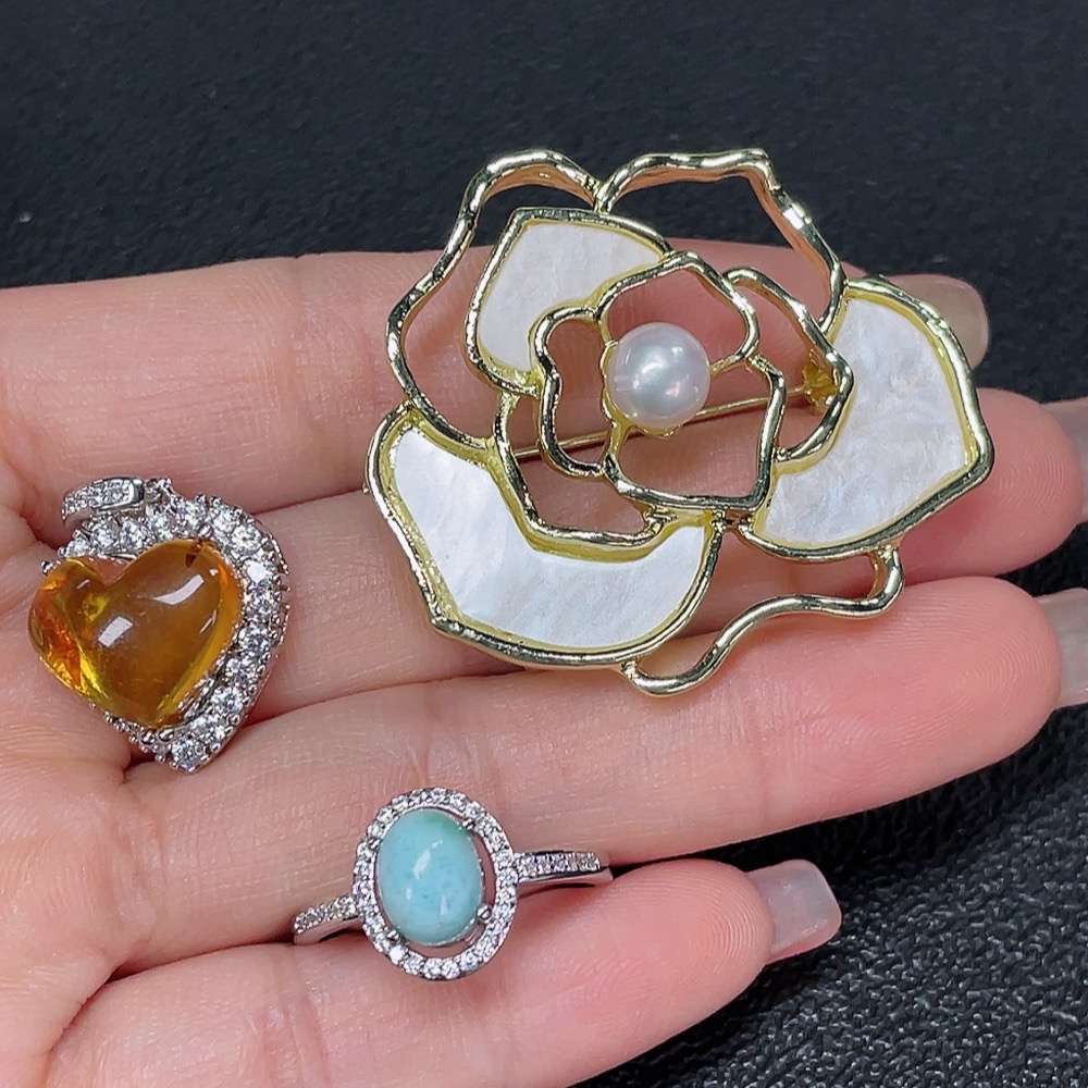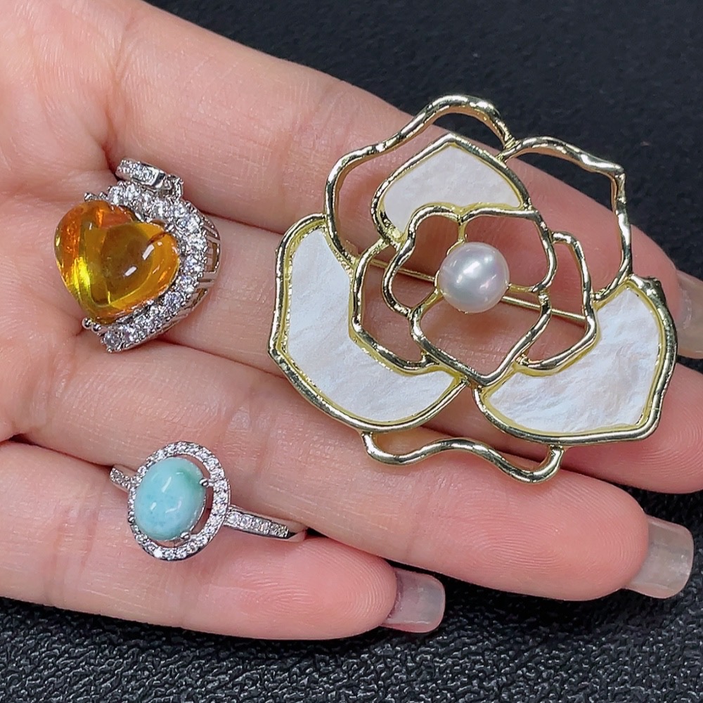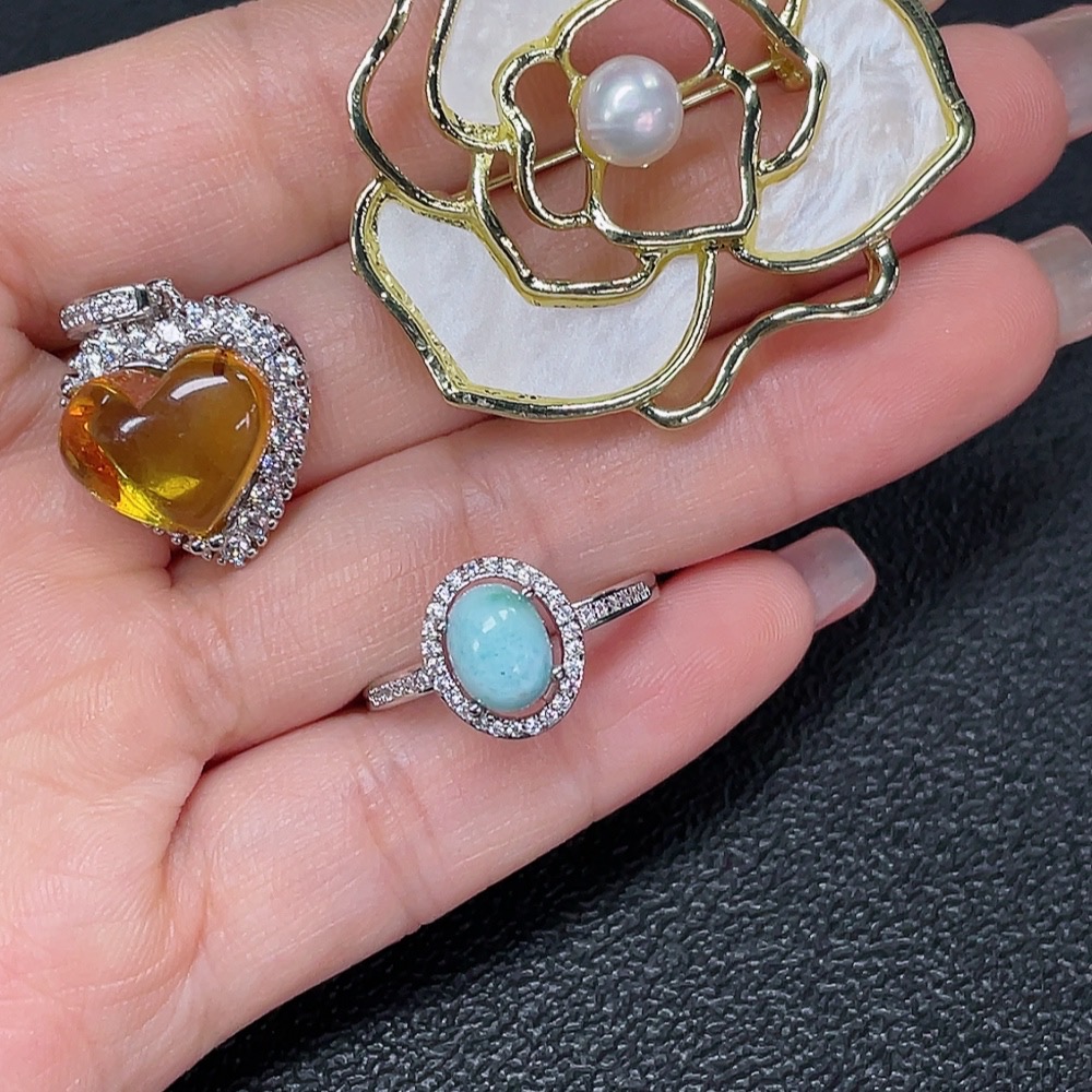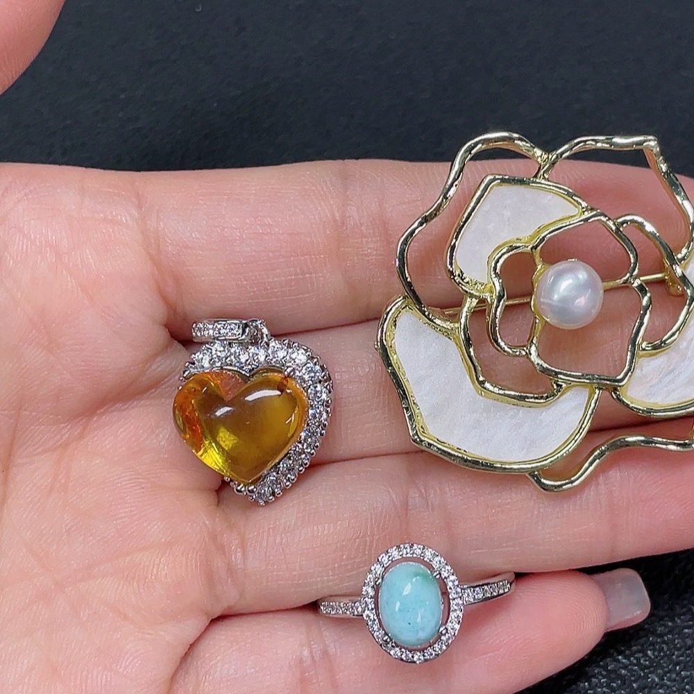 Pearl with non-natural gemstones, larimar, amber and beeswax inlaid ring + brooch + pendant, non-gold setting, total weight approximately 17.09 grams