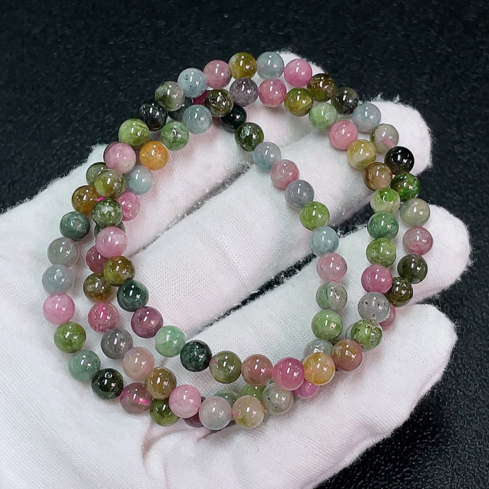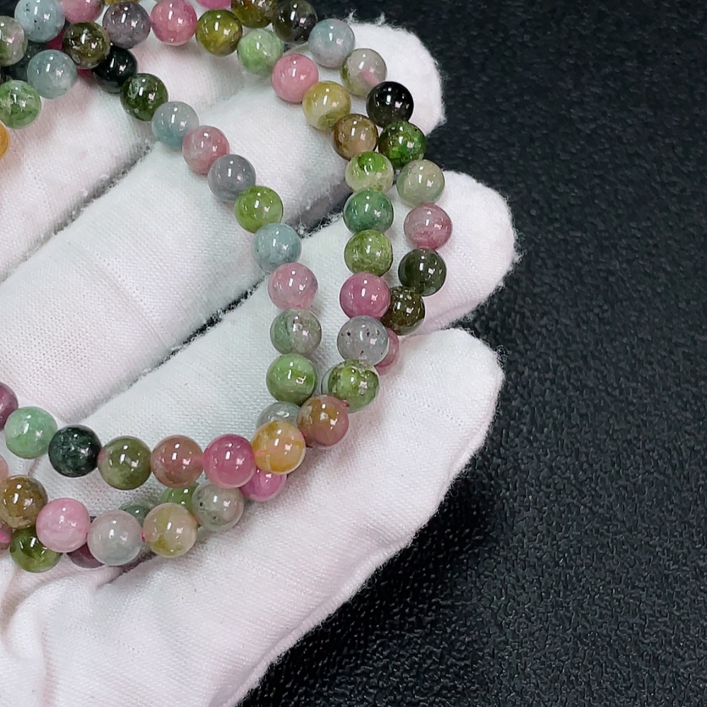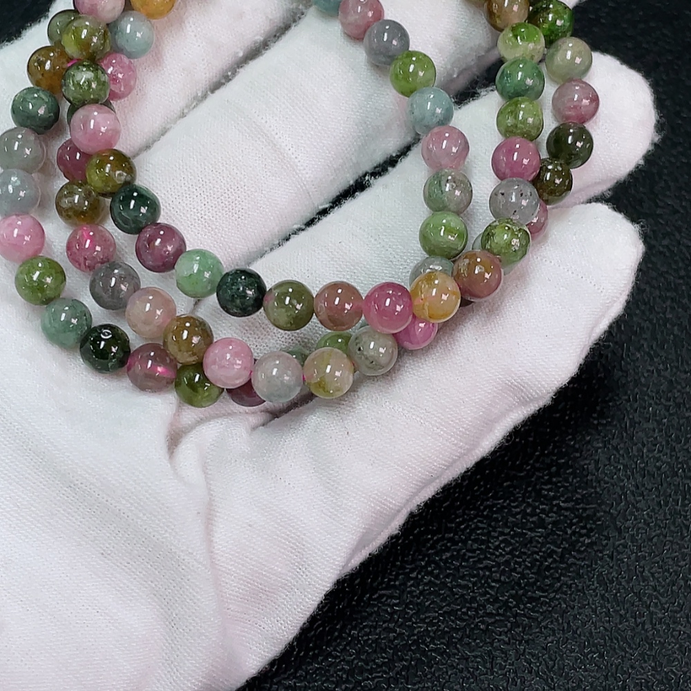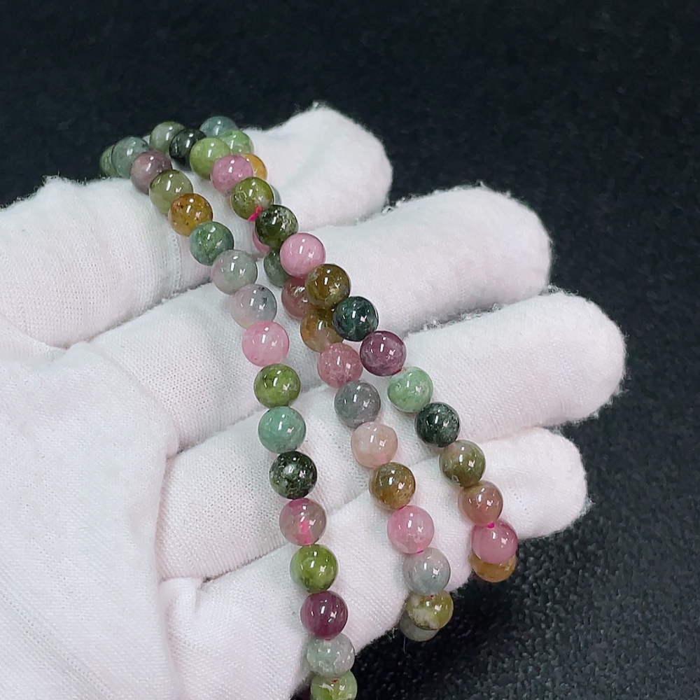 Tourmaline bead strand with other mineral components, visible organic matter, total weight approximately 28.73g, about 5.6mm in size