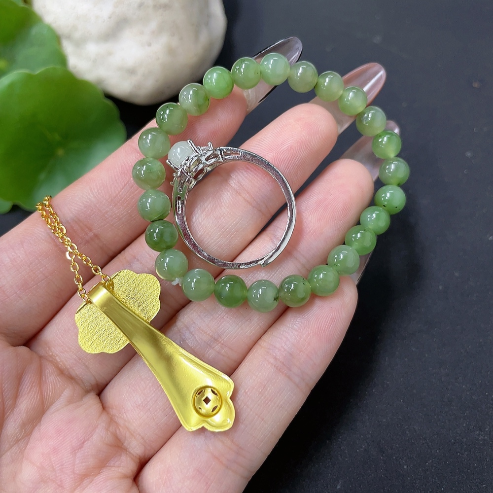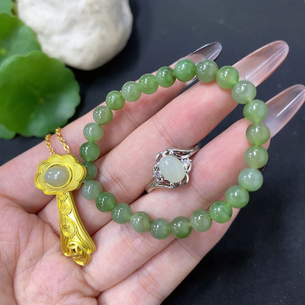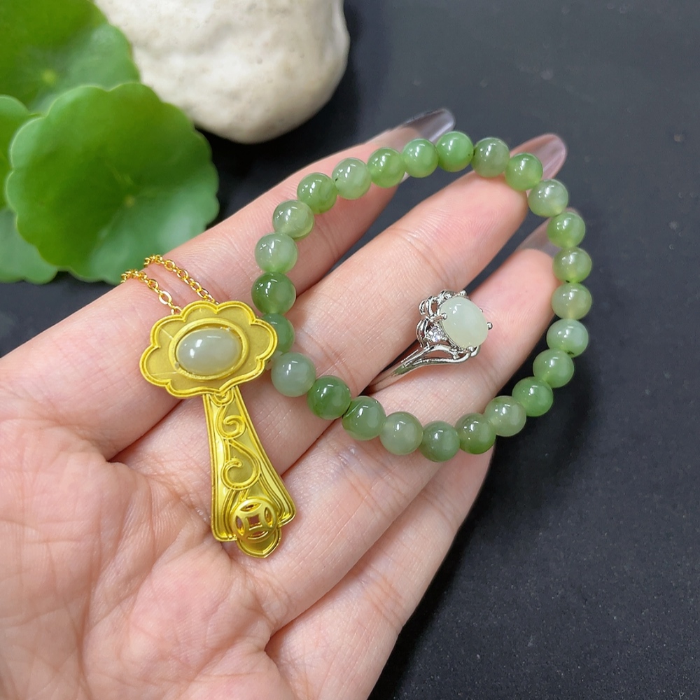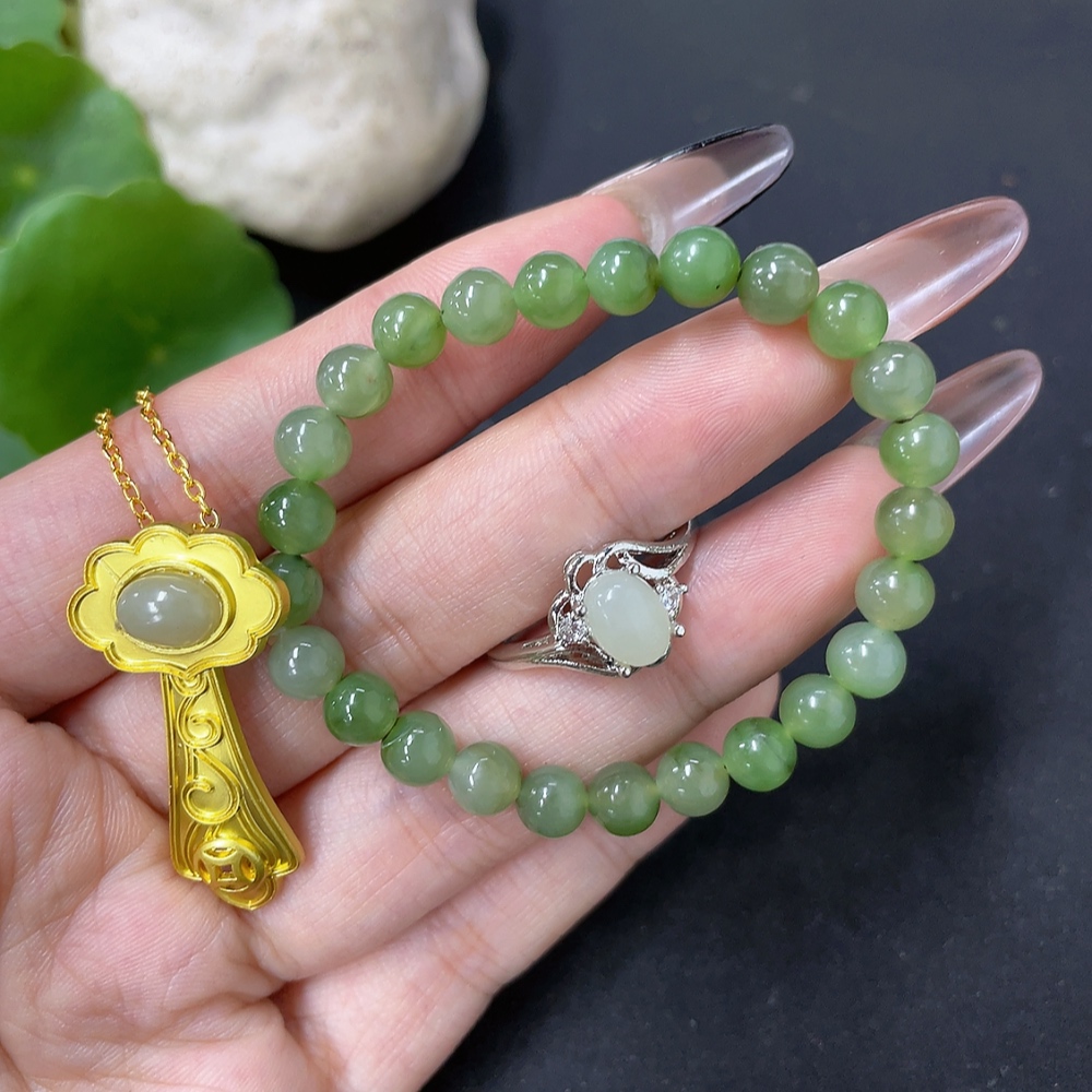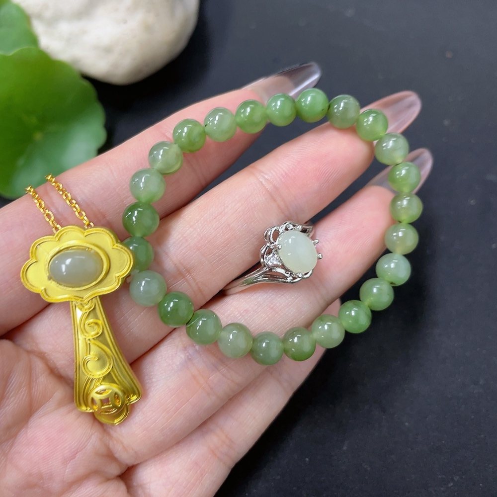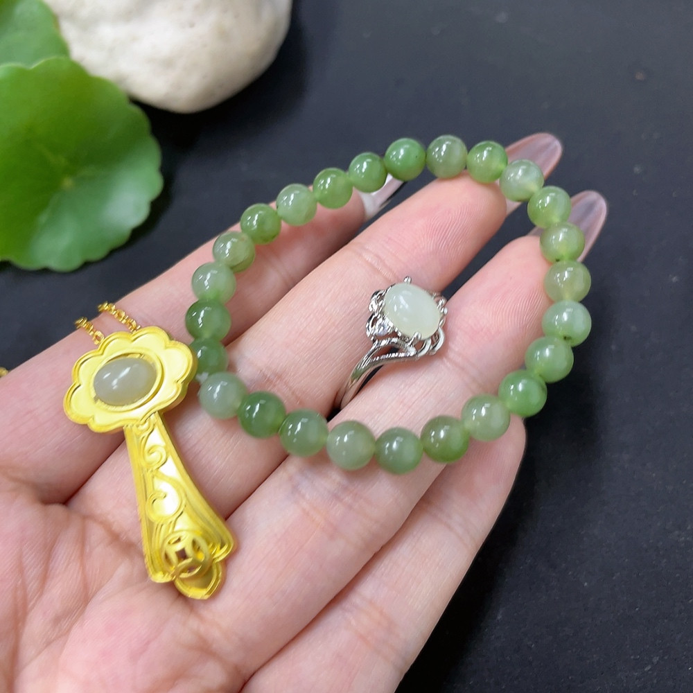 Hetian Jade Inlaid Pendant Adjustable Ring Non-Gold Inlay Hand String Beads Approx. 5.6mm Total Weight Approx. 14.6g