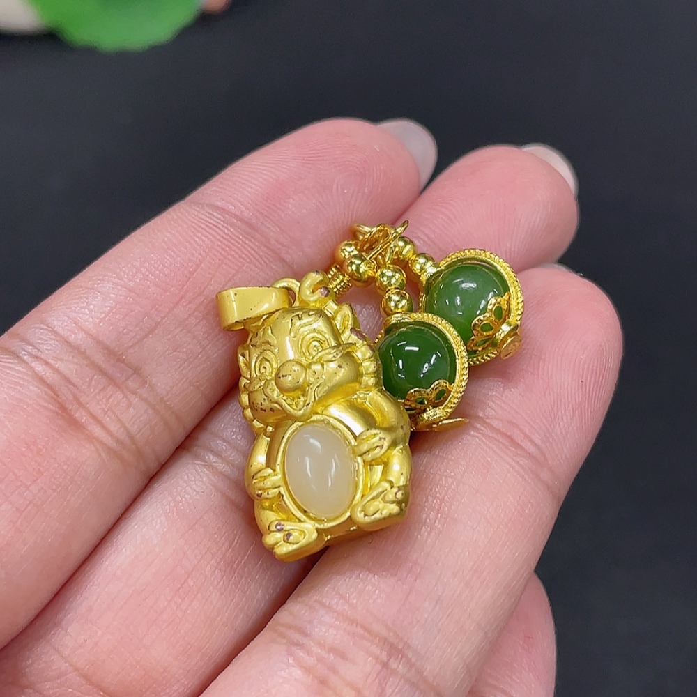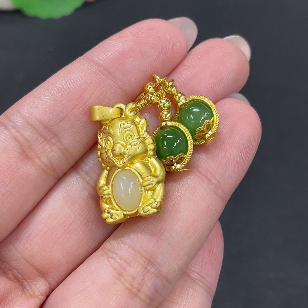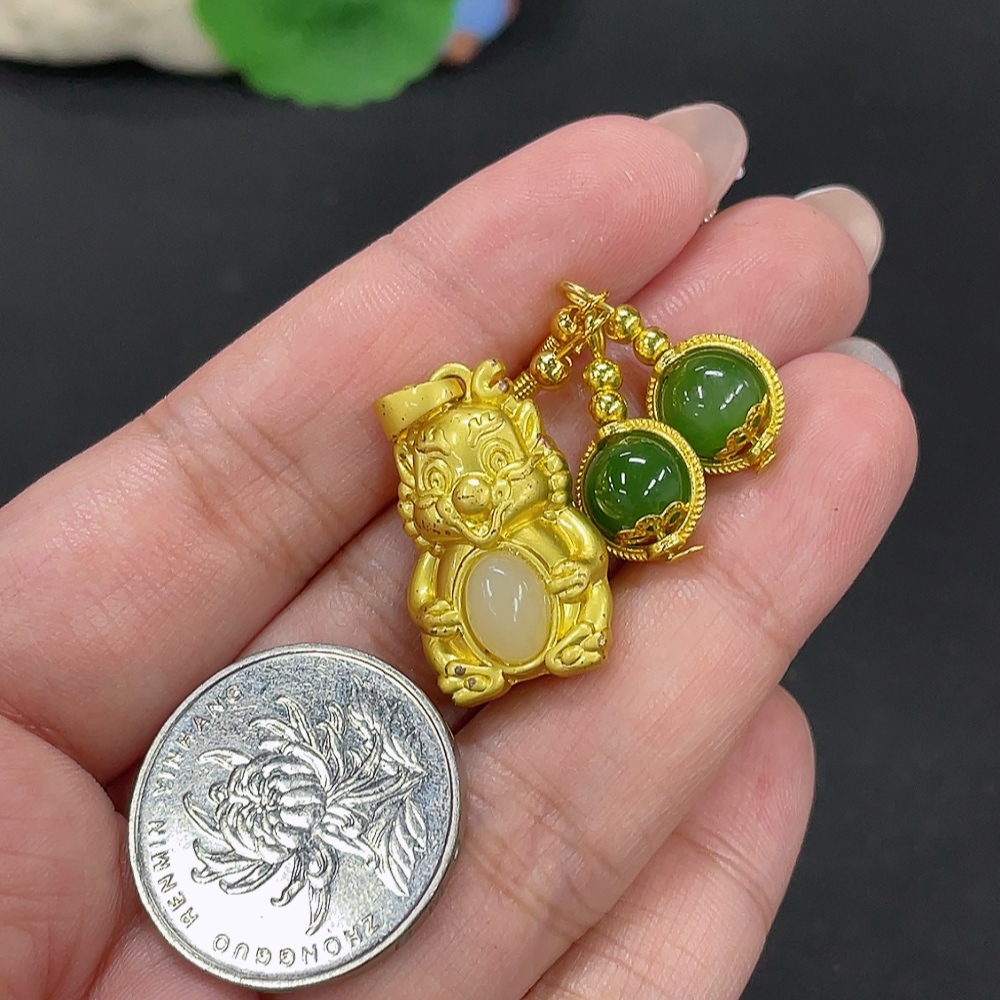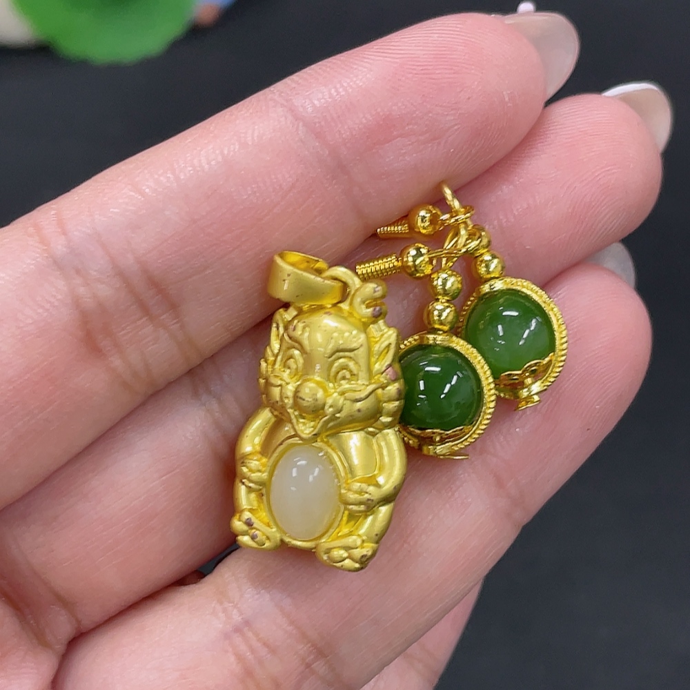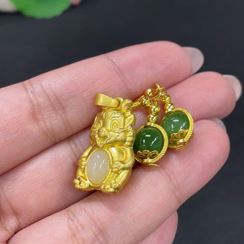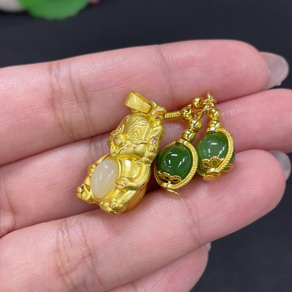 Hetian Jade inlaid pendant + earrings total weight about 13.6g non-gold