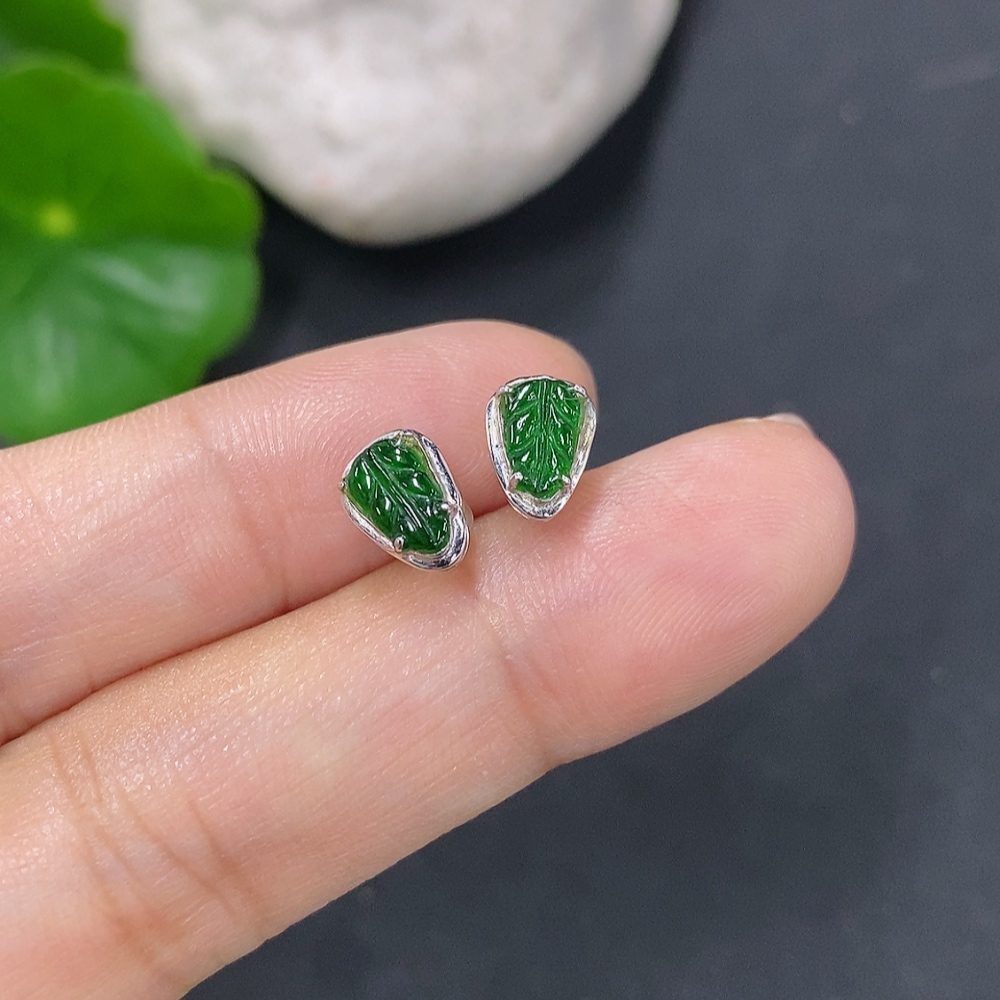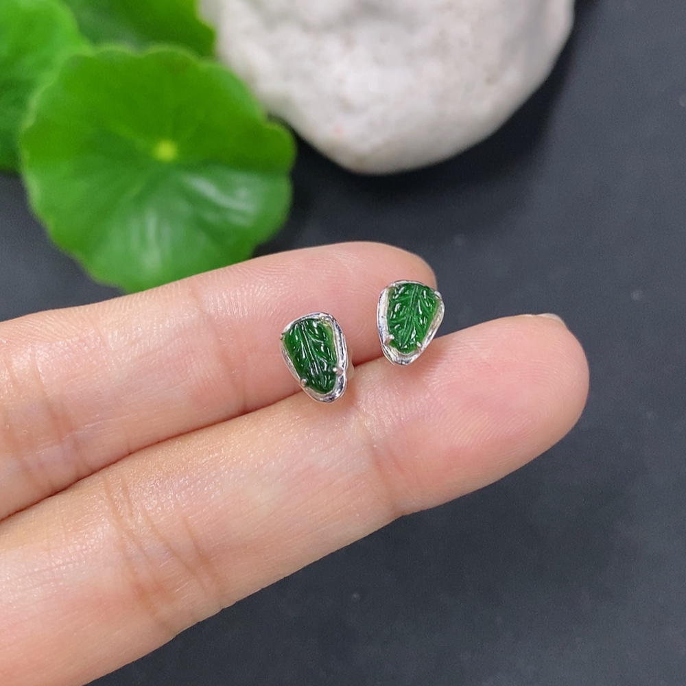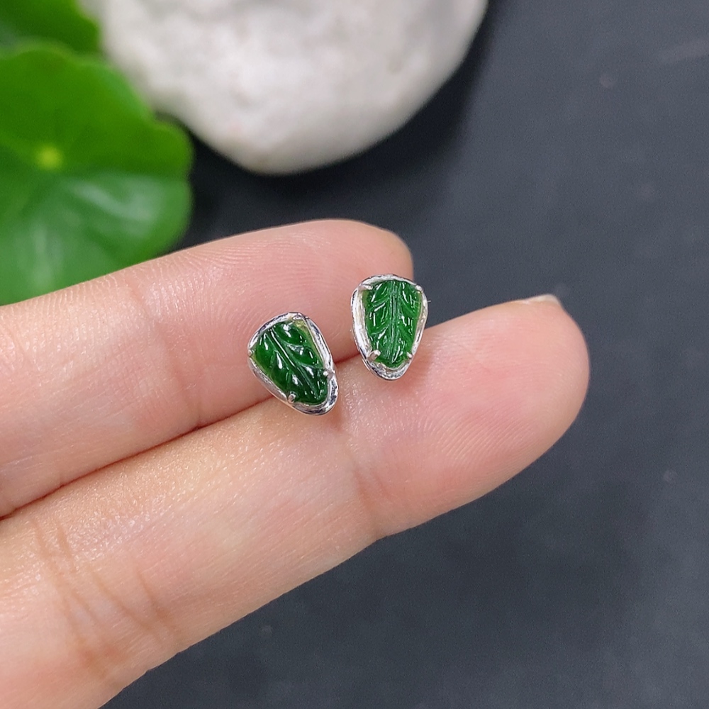 Jadeite Leaf Inlaid Earrings 18K Gold Total Weight Approximately 0.6g Without Ear Studs