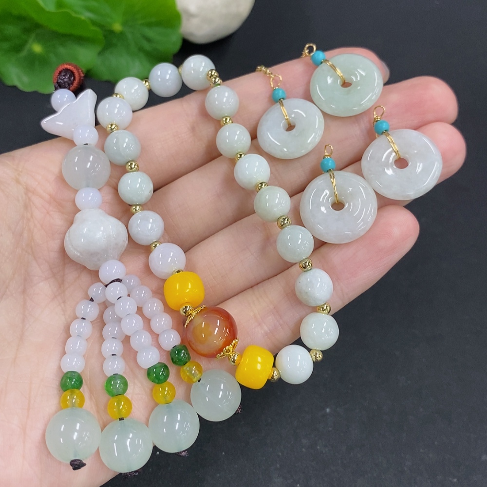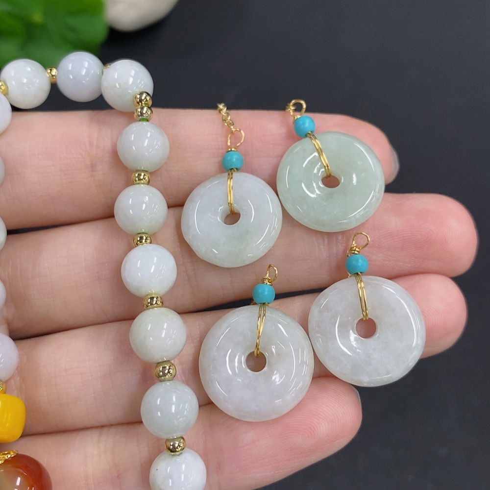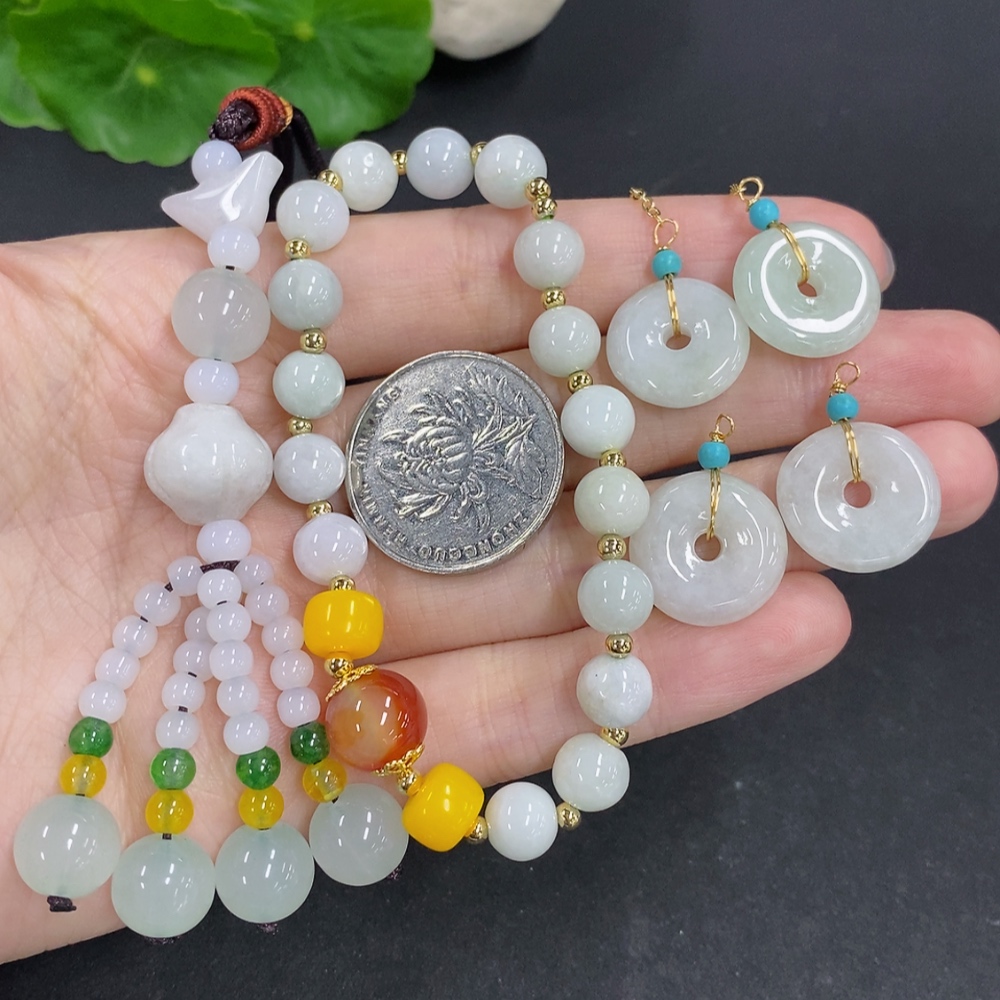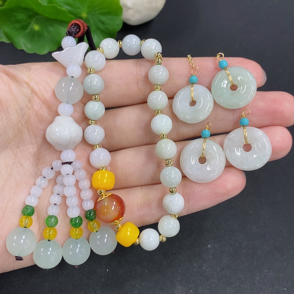 Jadeite pendant with bead chain and earrings sell as a lot non-gold inlay (matching beads non-A)