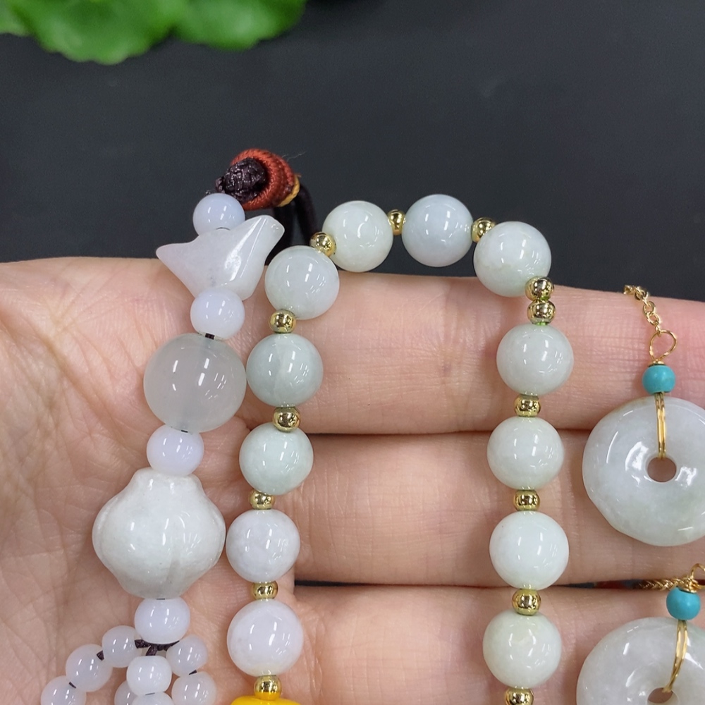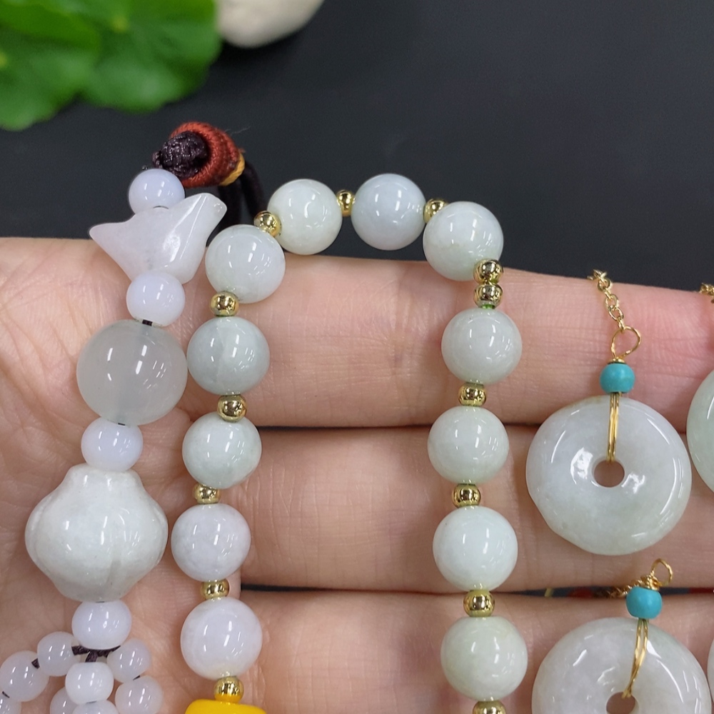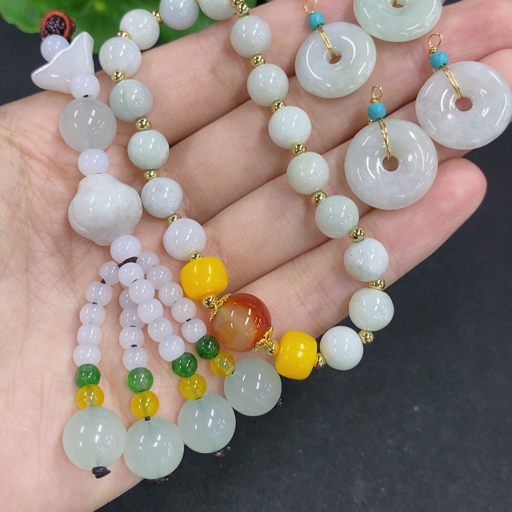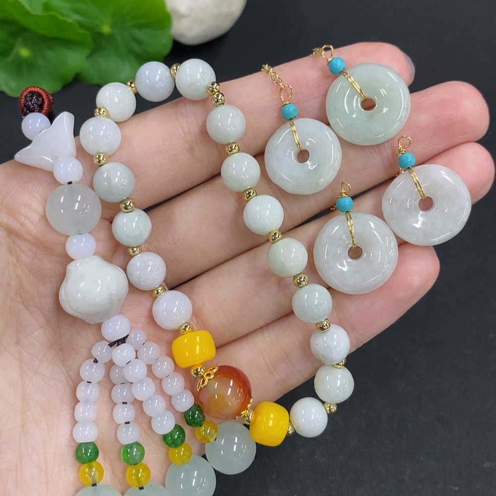 Jadeite pendant with bead chain and earrings sell as a lot non-gold inlay (matching beads non-A)