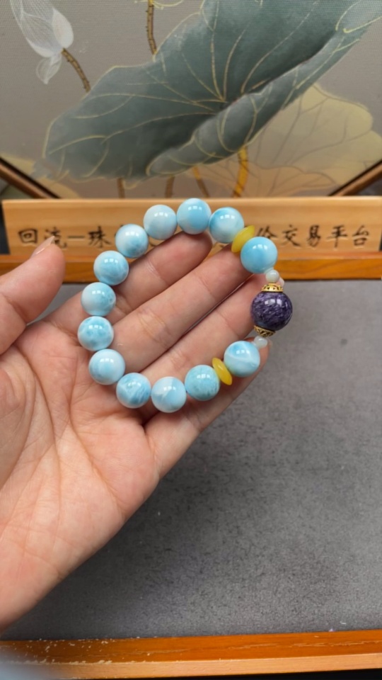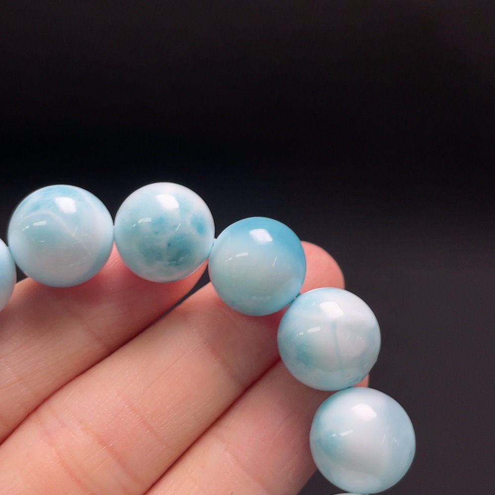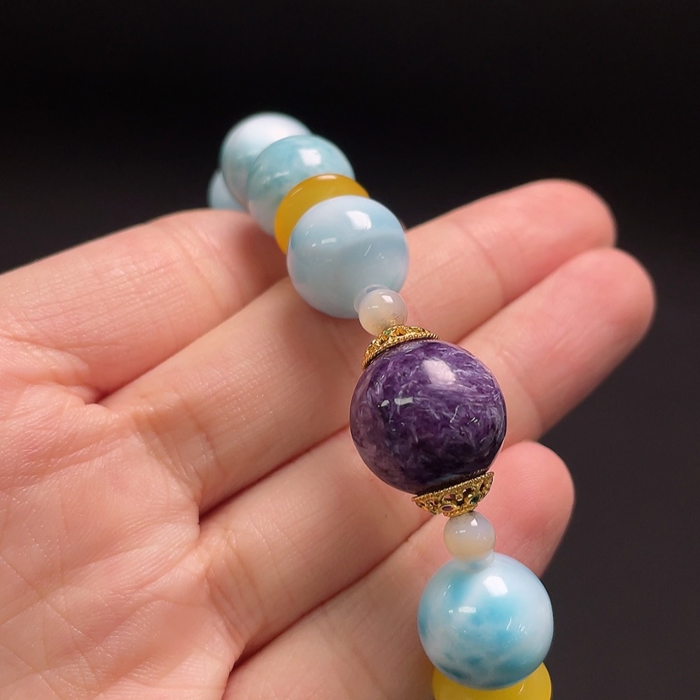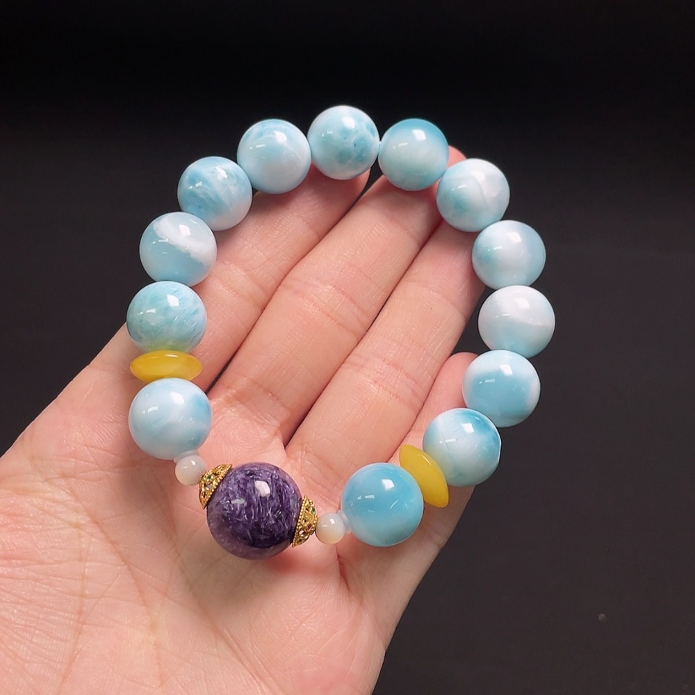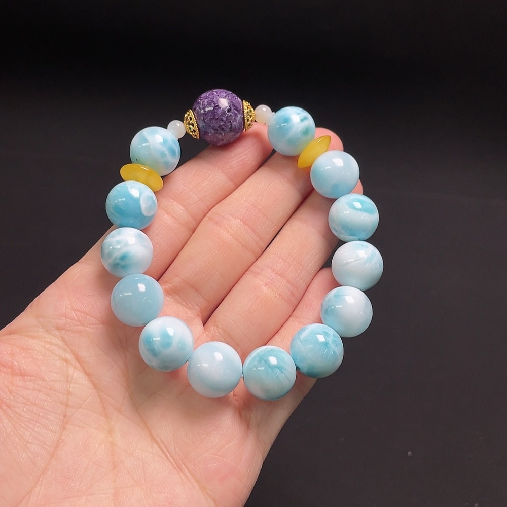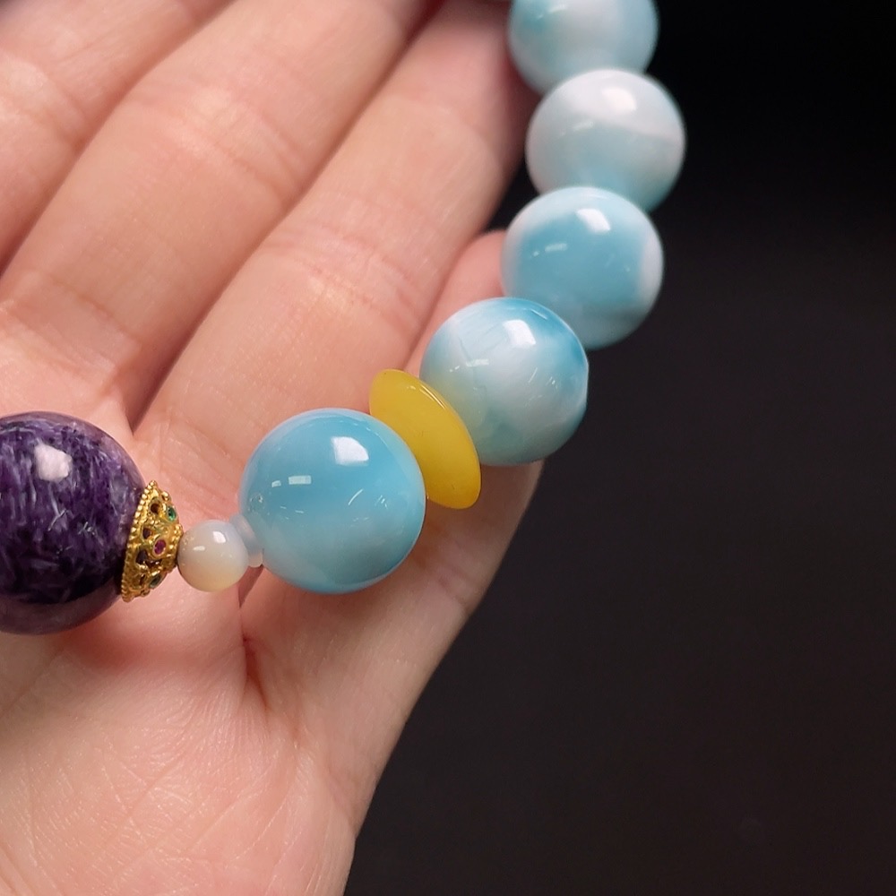 Larimar bracelet with amber, visible organic matter, non-natural/non-metal accent stones, total weight approx. 38.4g, 12mm beads