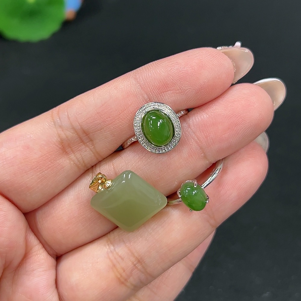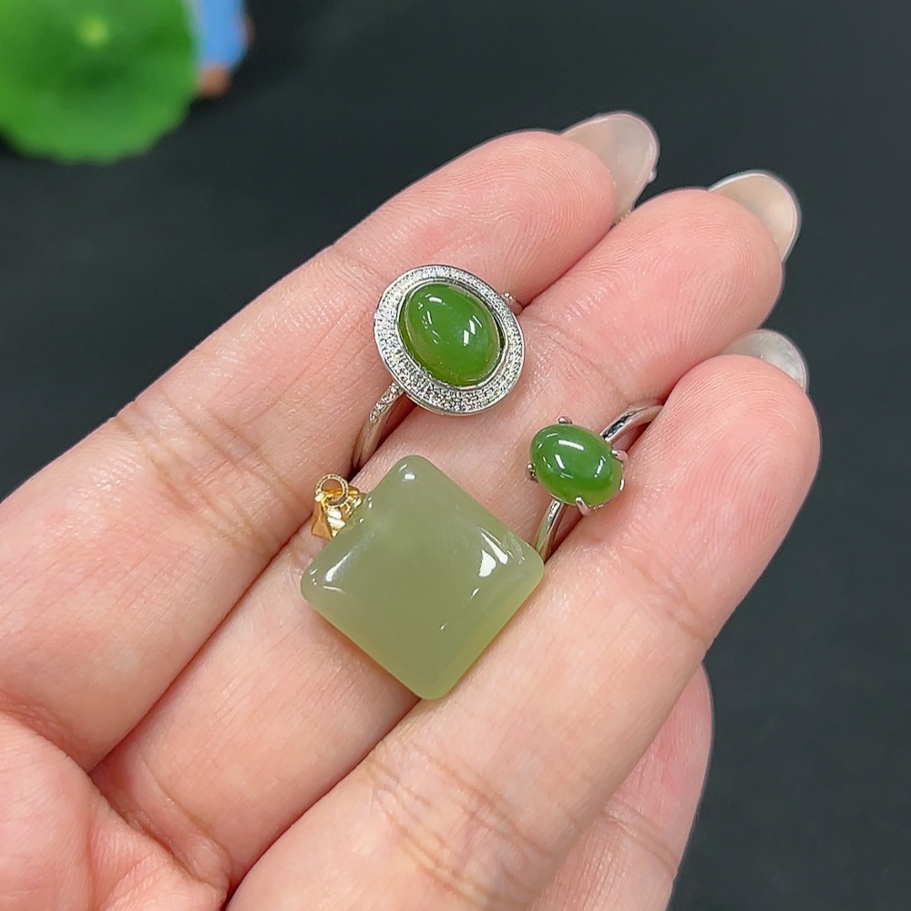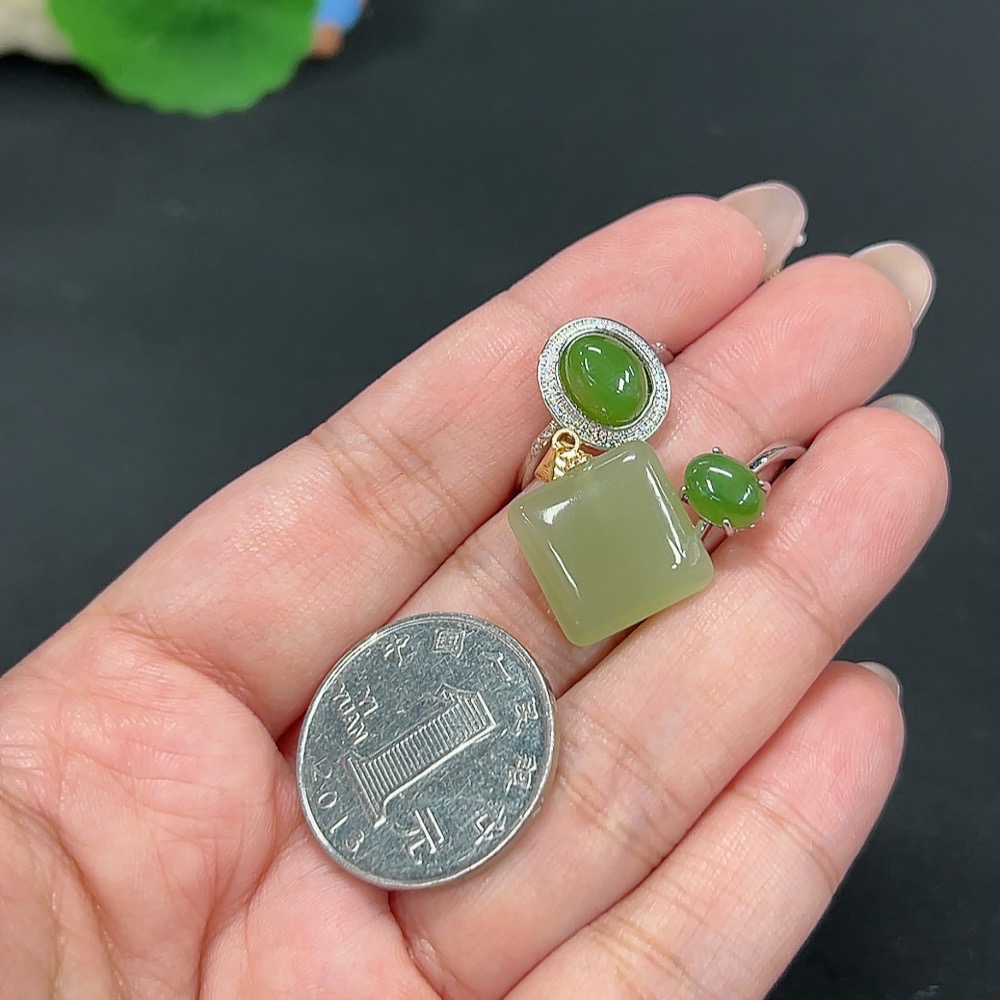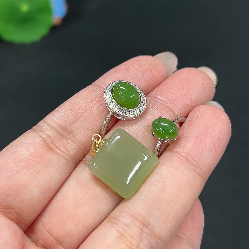 Hetian Jade inlaid pendant + adjustable ring, total weight approx. 6.7g, non-gold
