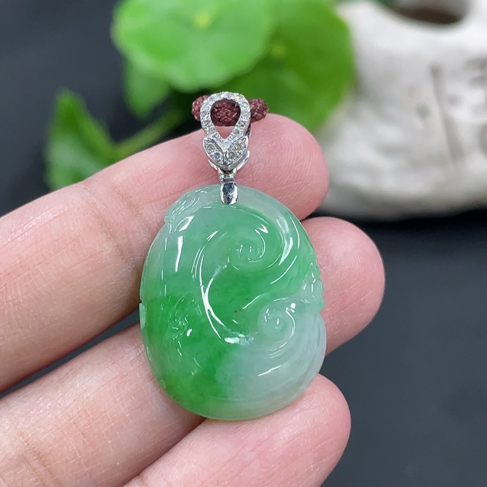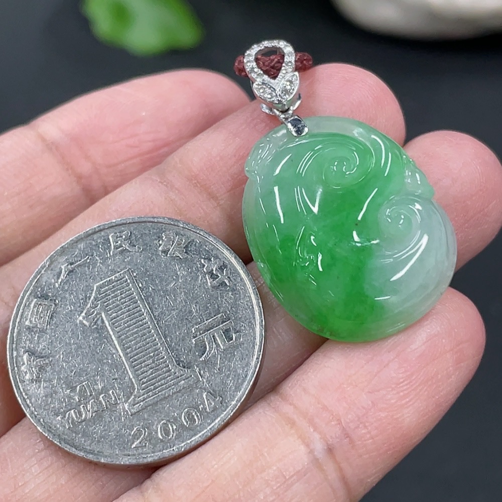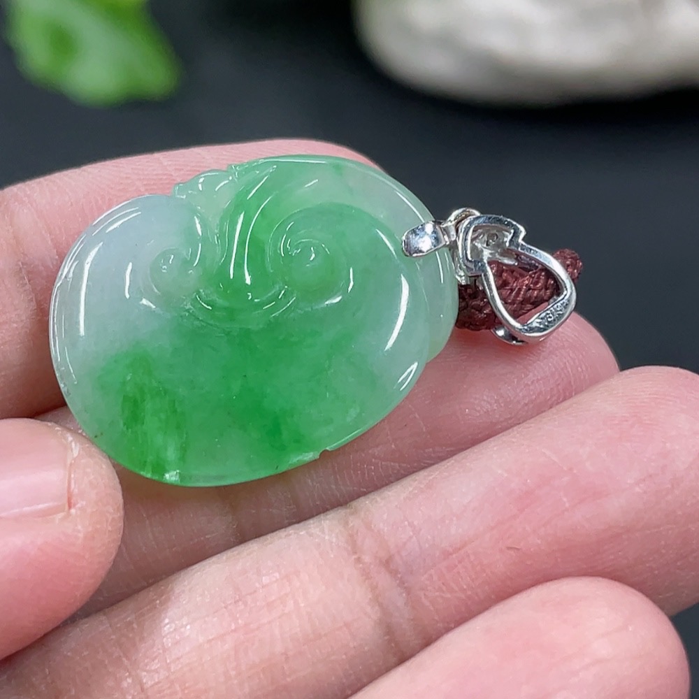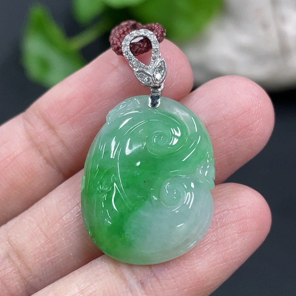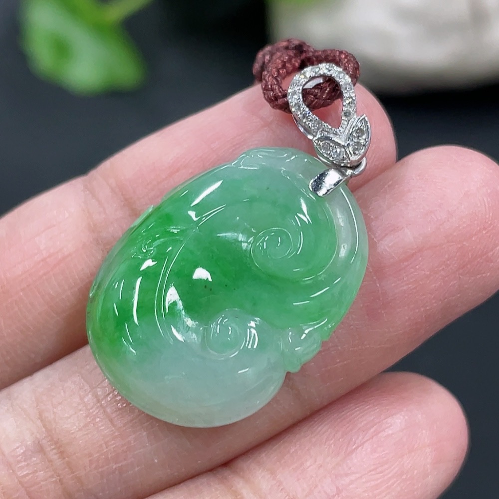 Jadeite Ruyi Pendant with 18K Gold Clasp and Diamond Accents, Total Weight Including Cord Approximately 6.93g