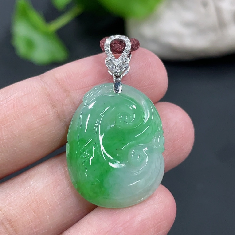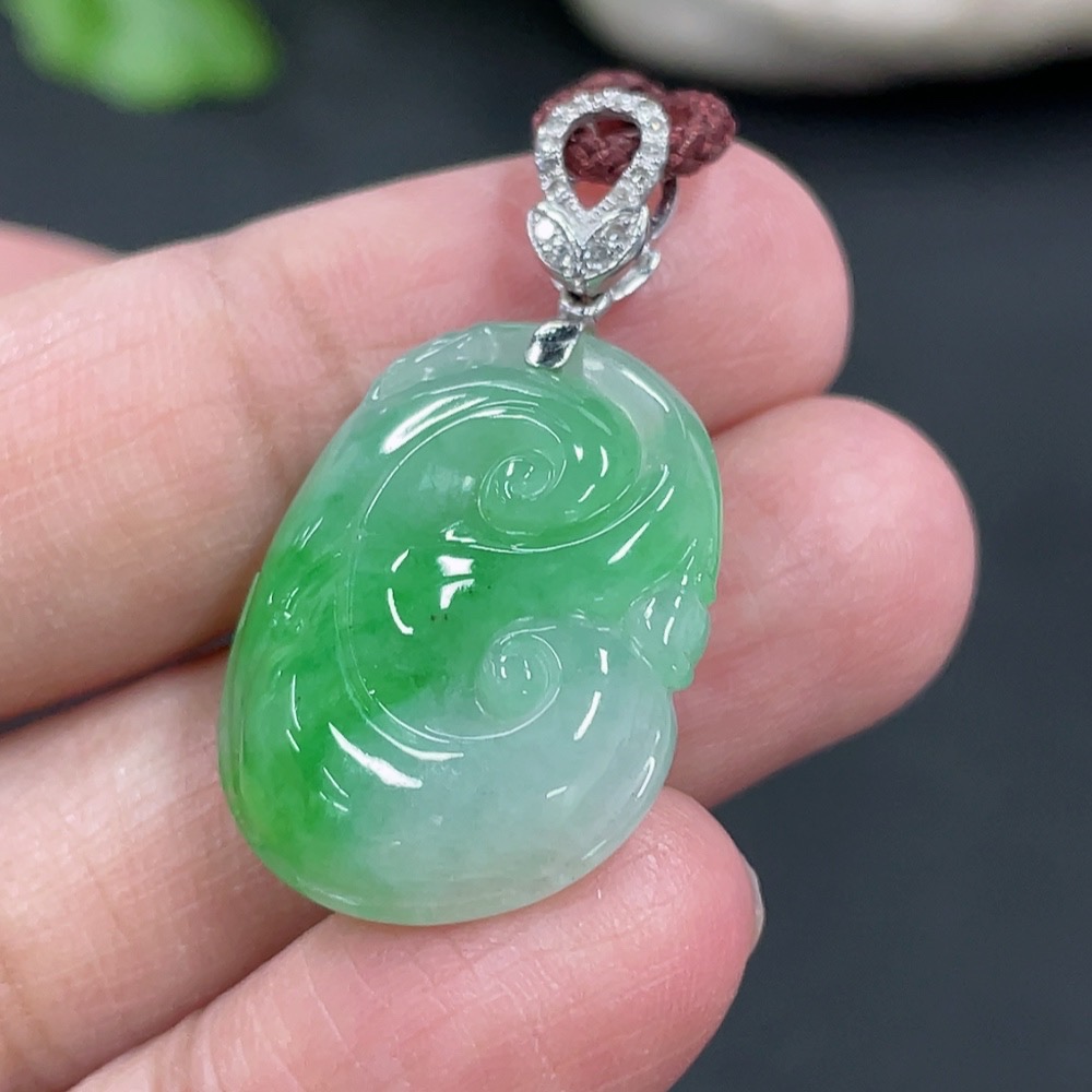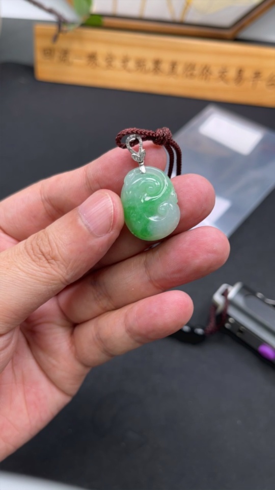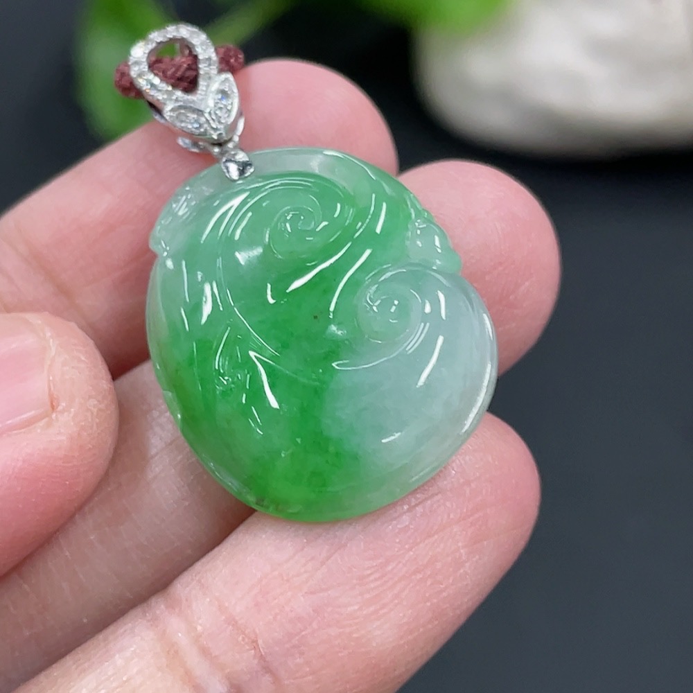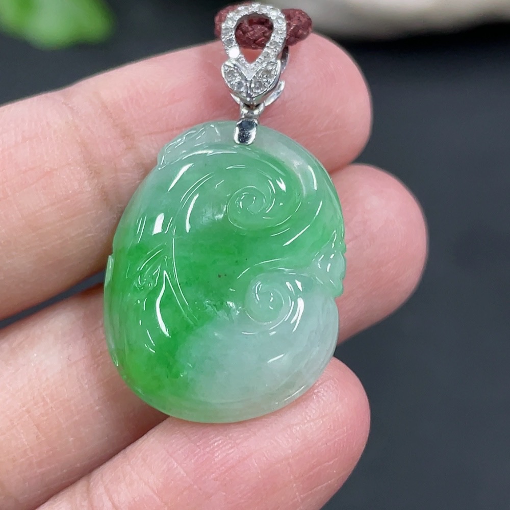 Jadeite Ruyi Pendant with 18K Gold Clasp and Diamond Accents, Total Weight Including Cord Approximately 6.93g