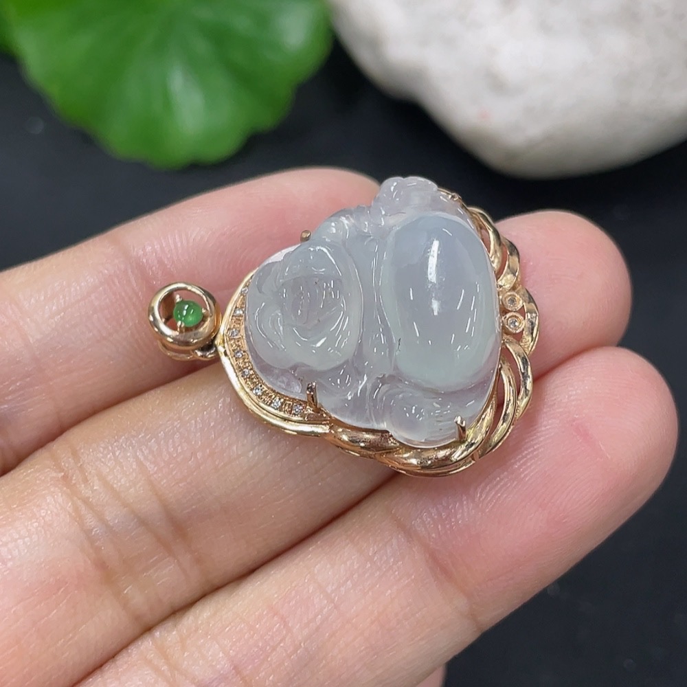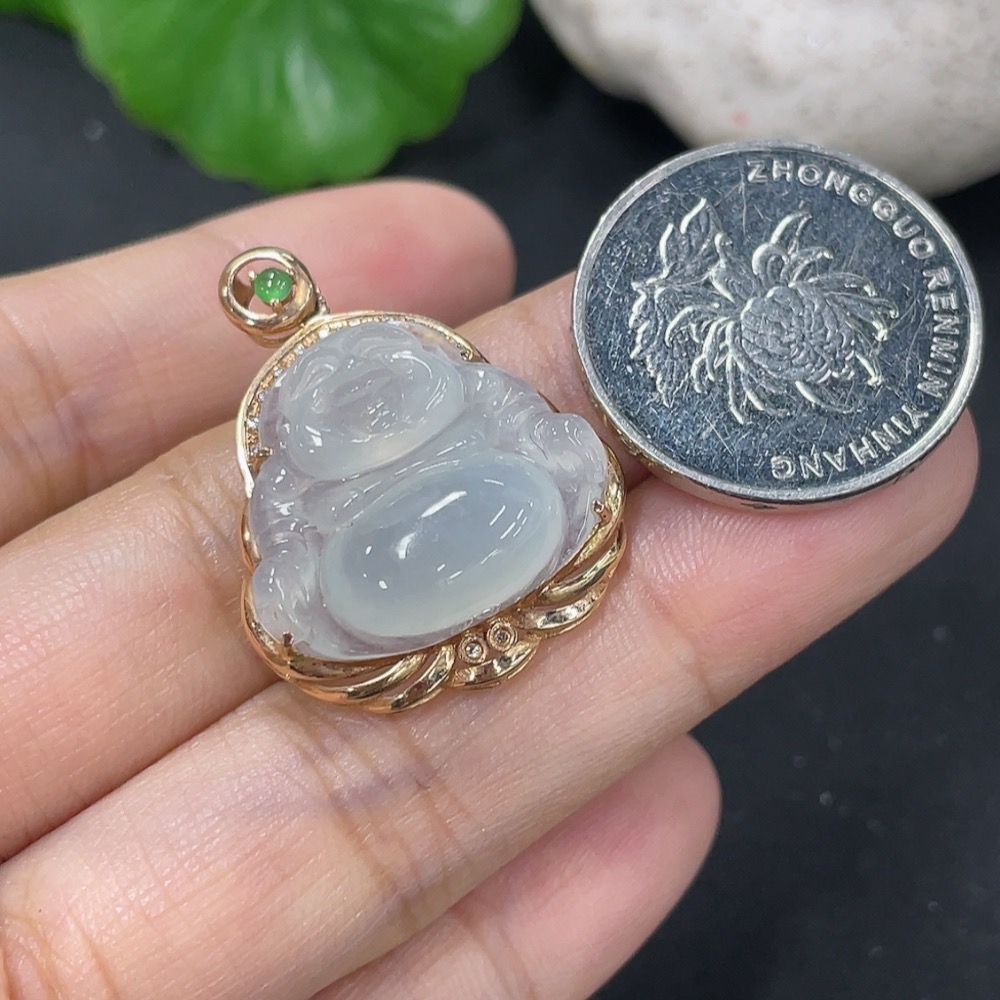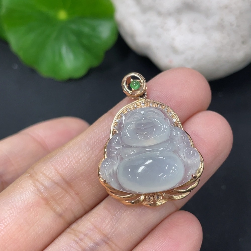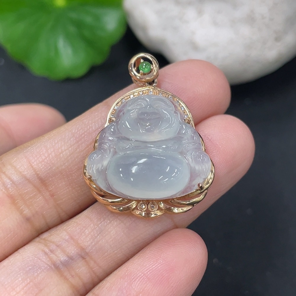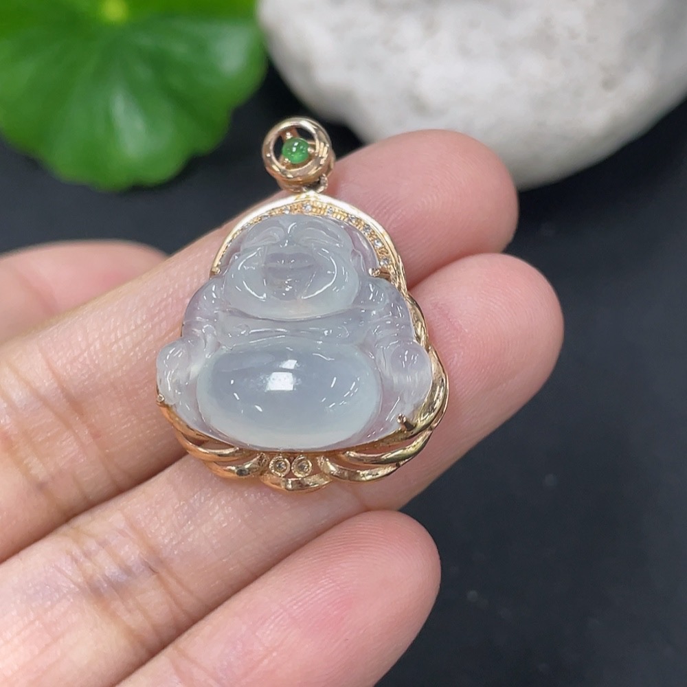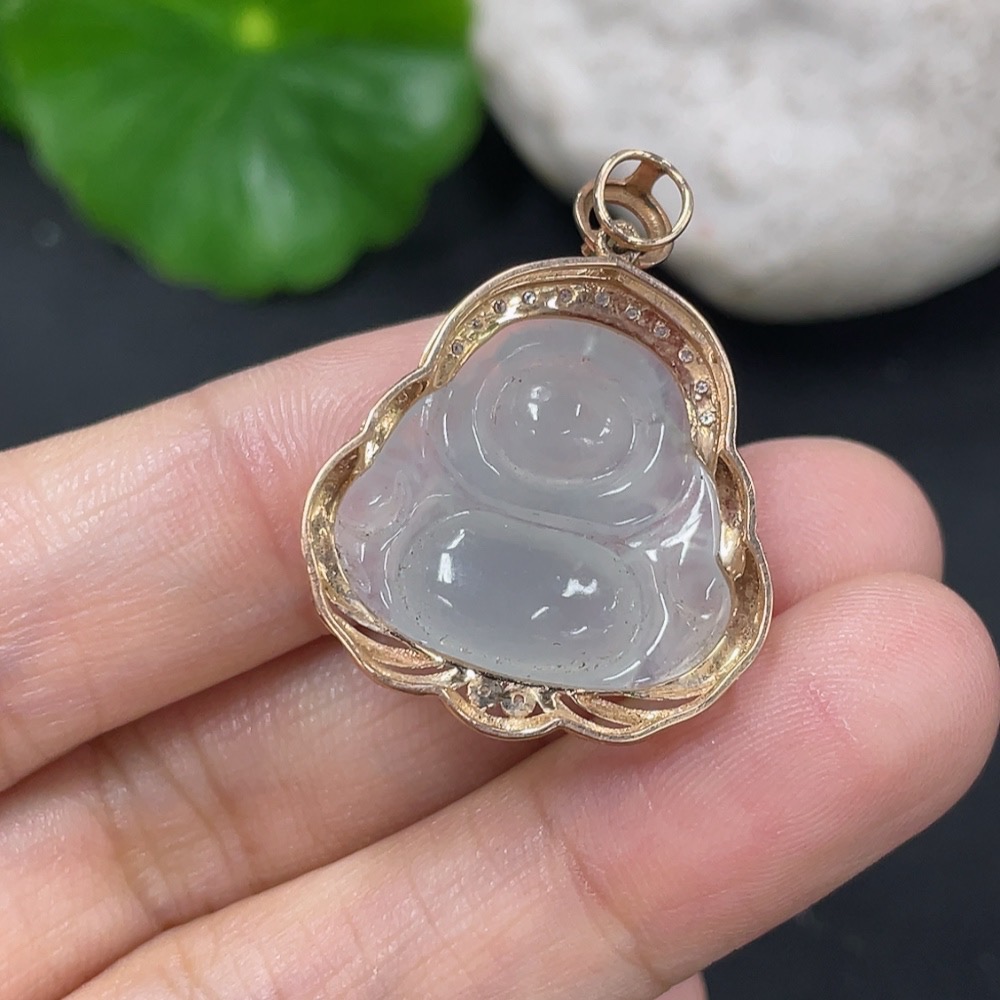 Jadeite Inlaid Buddha Pendant with 18k Gold and Diamond Accents, Total Weight Approximately 374g
