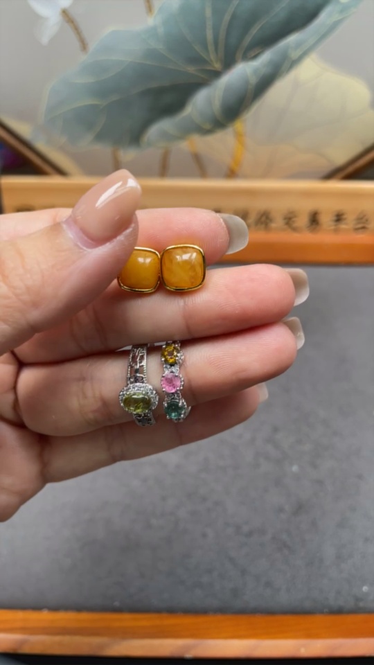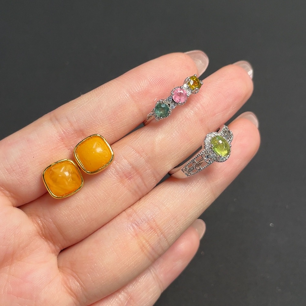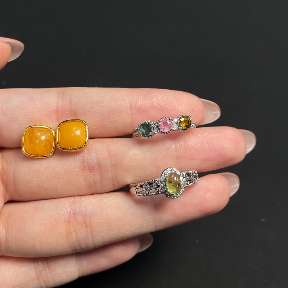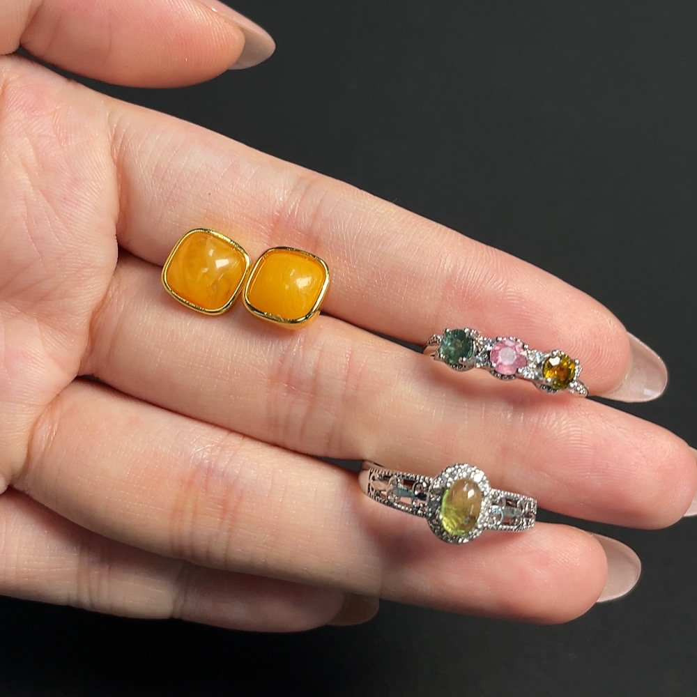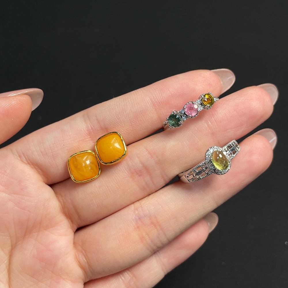 Tourmaline Organic Inclusion Amber Beeswax Inlay Ring & Earrings Non-Gold Setting Total Weight Approx. 4.92g