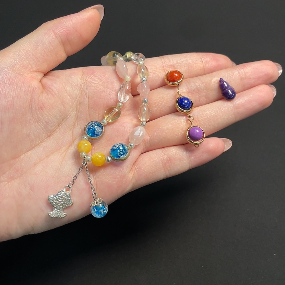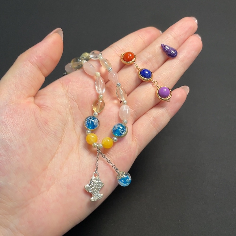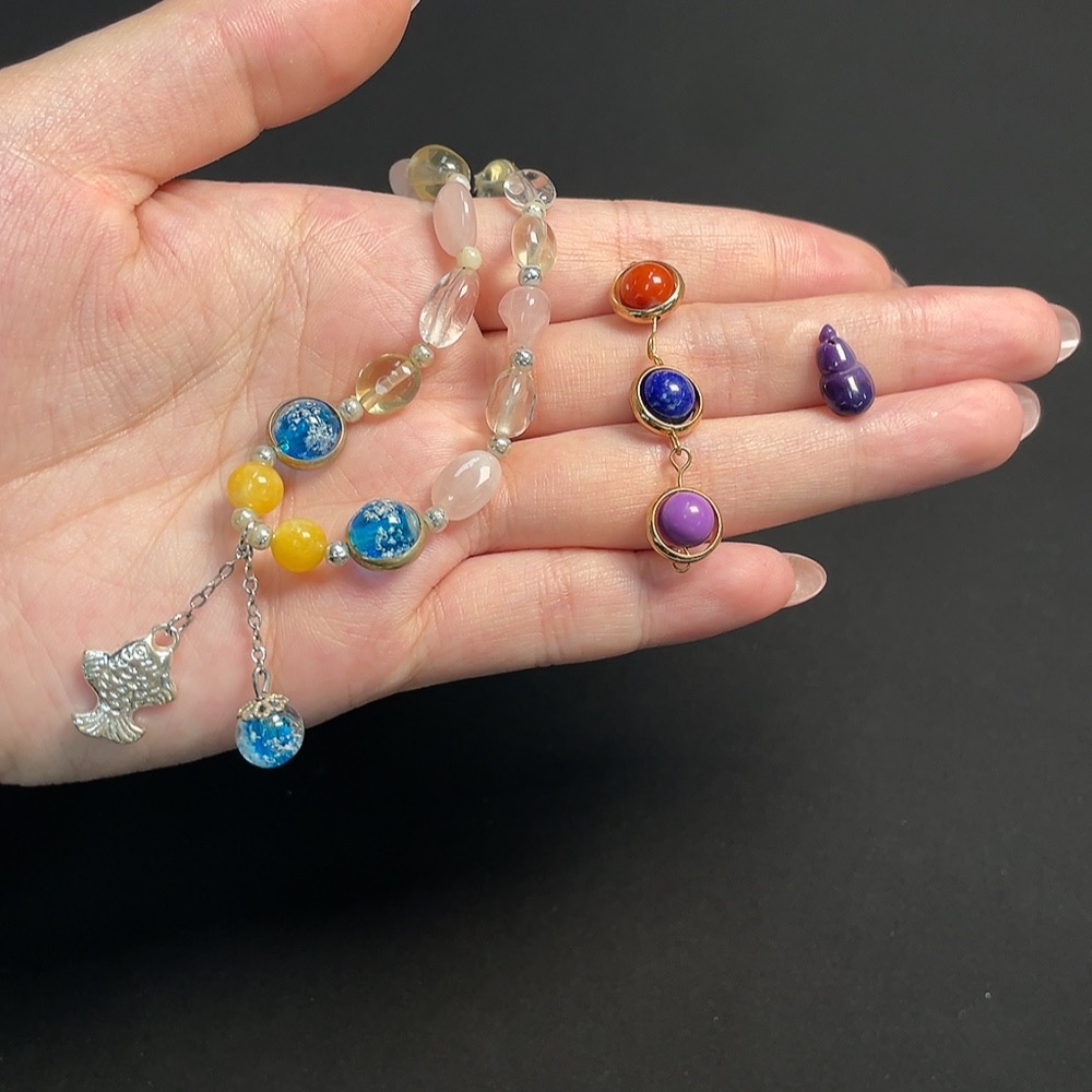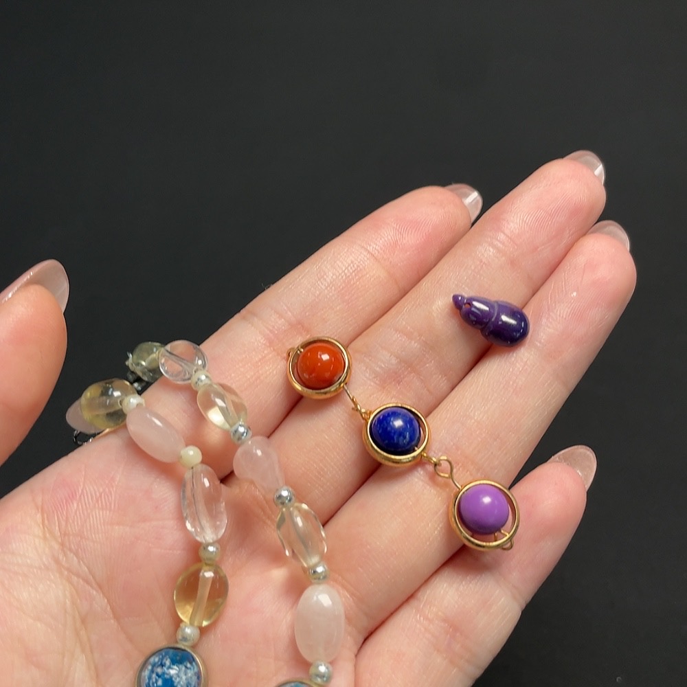 Crystal (only pink, colorless, visible organic matter (inclusions)), Sugilite (only purple, containing other mineral components, visible organic matter), Red Agate (only red) inlaid bracelet + jewelry non-gold inlaid total weight about 14.20g stones may be non-natural