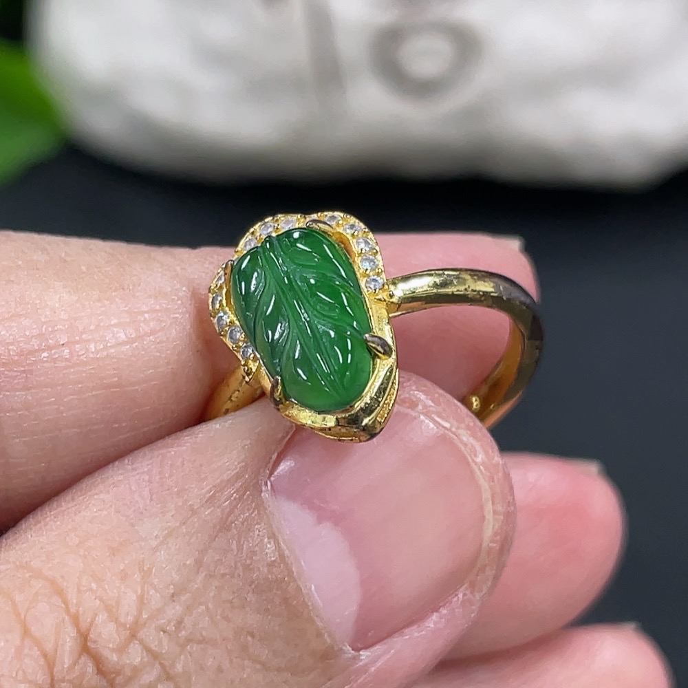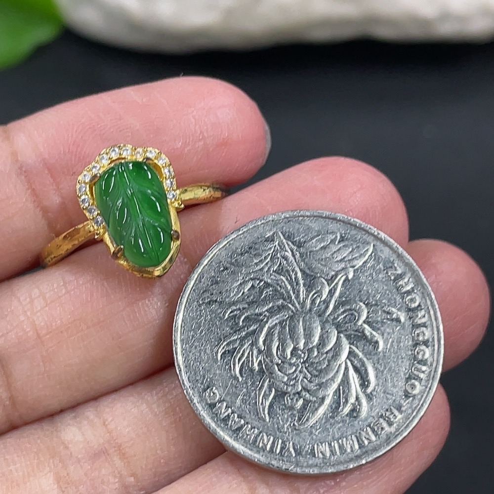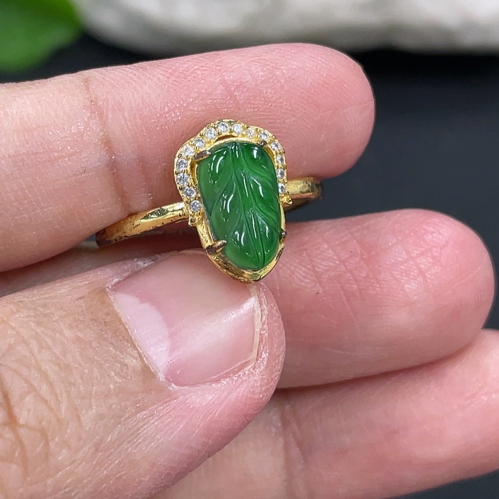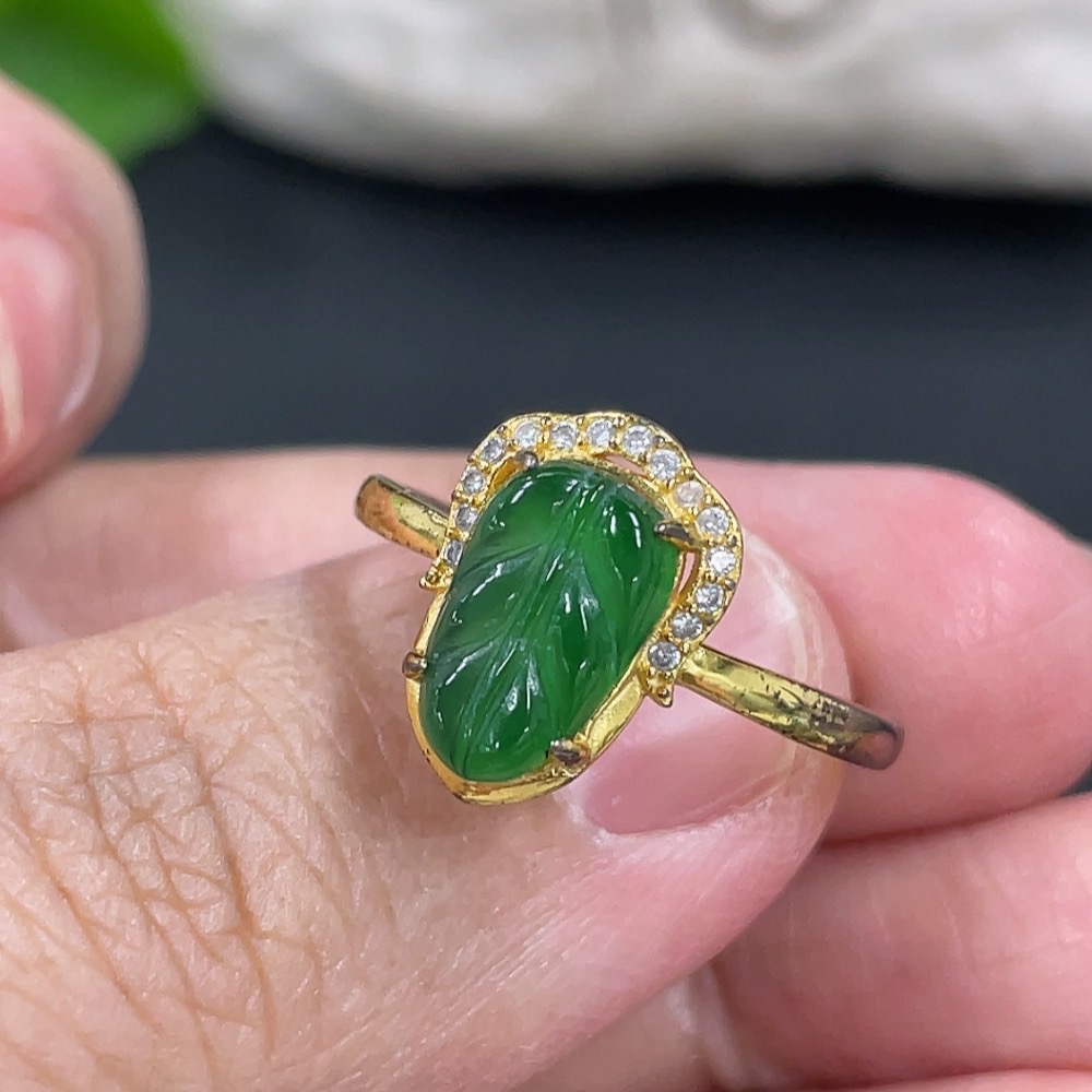 Jadeite Leaf Inlaid Ring Non-Gold Inlaid Adjustable Size Total Weight Approx.1.61g