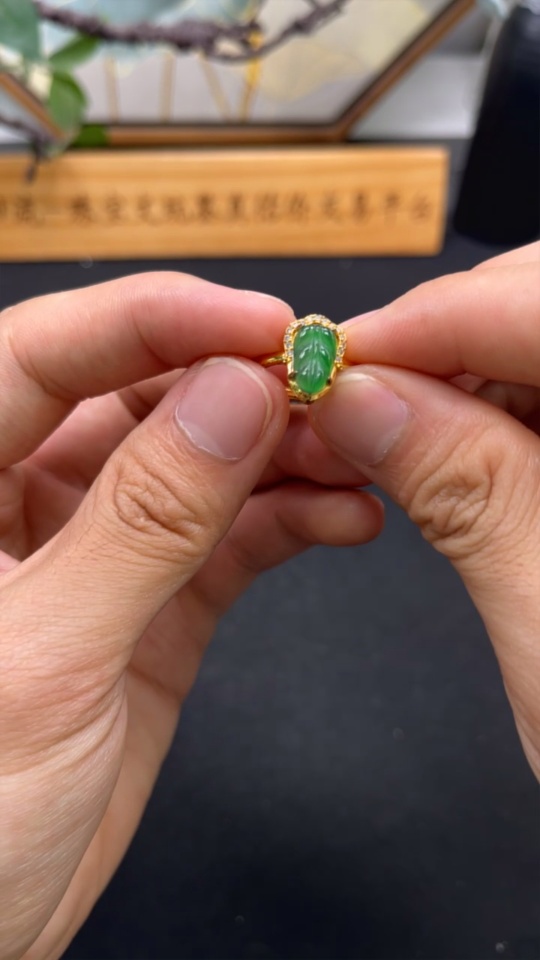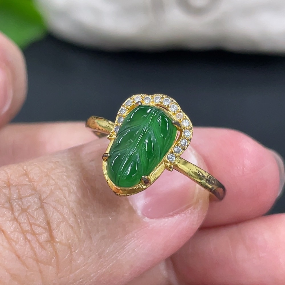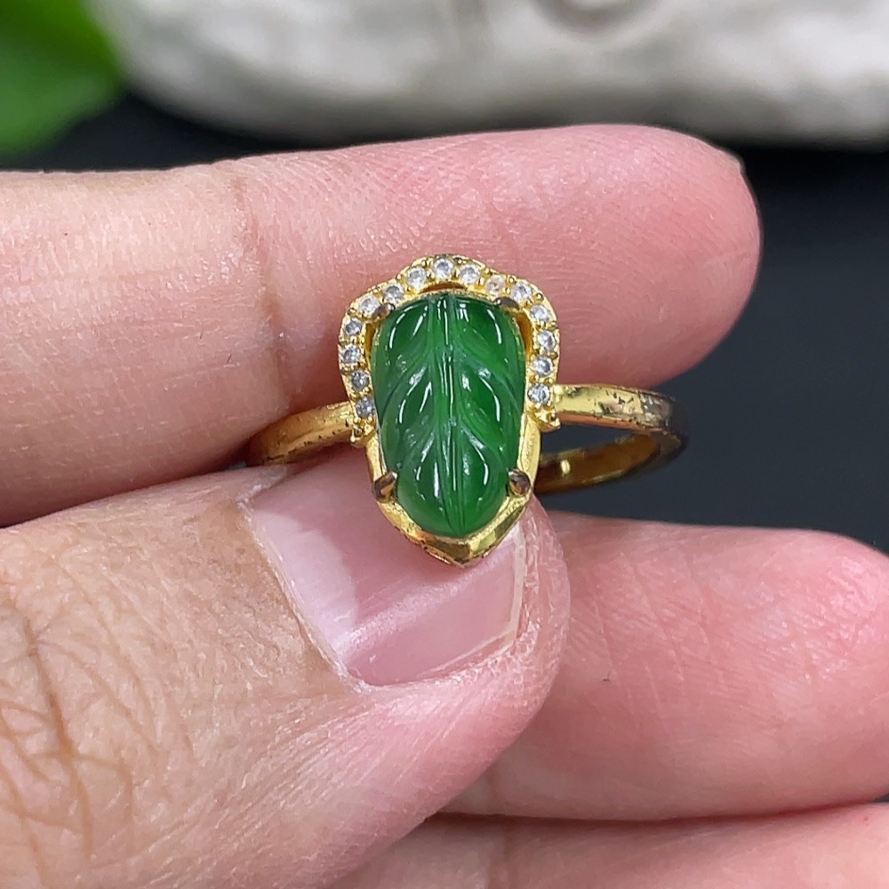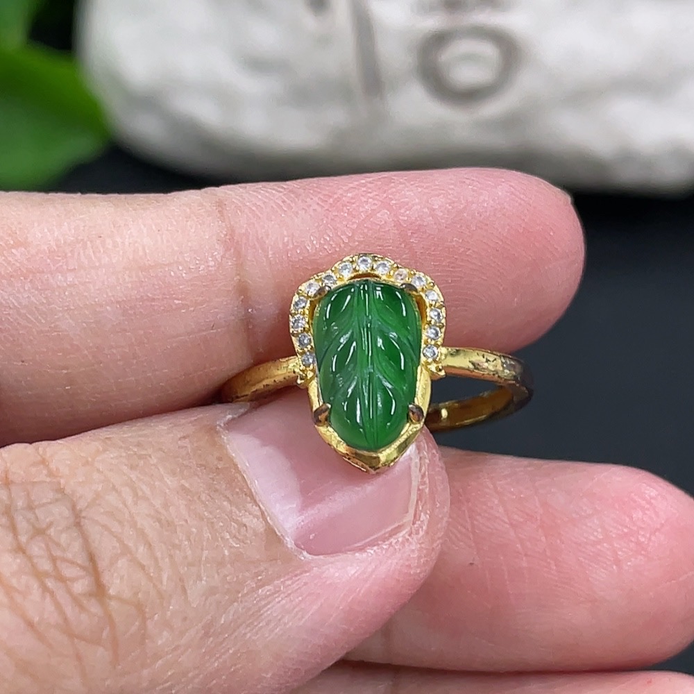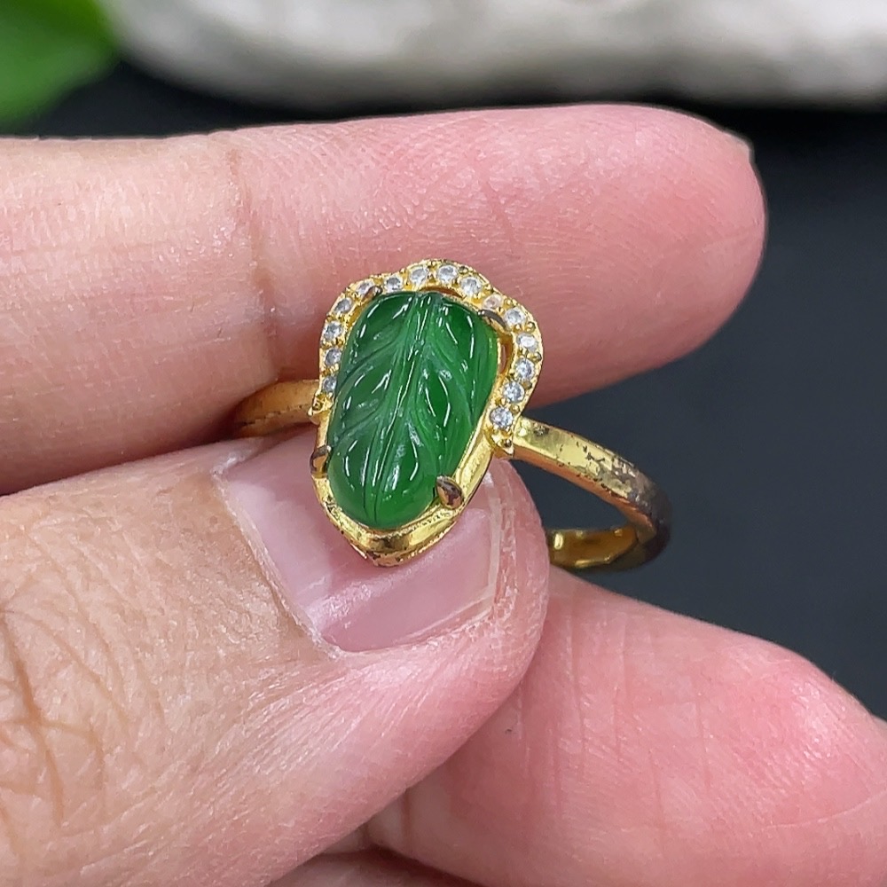 Jadeite Leaf Inlaid Ring Non-Gold Inlaid Adjustable Size Total Weight Approx.1.61g