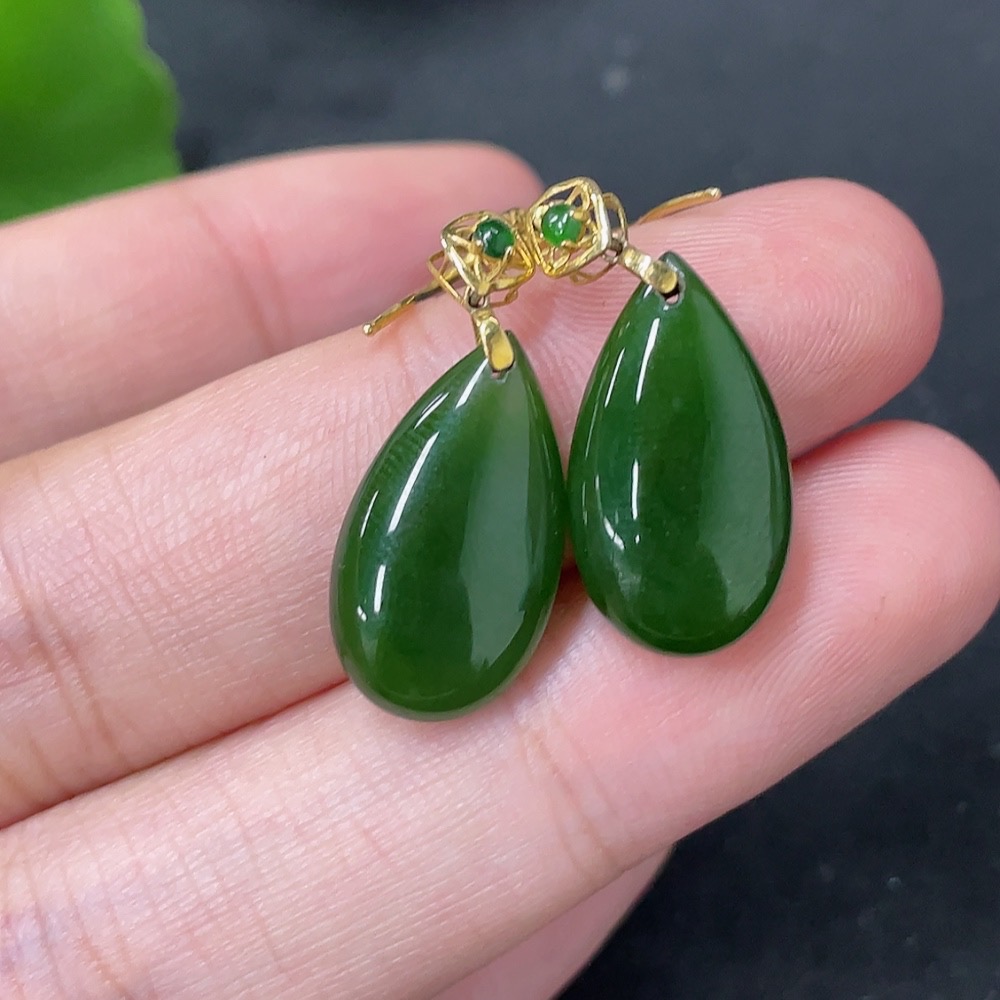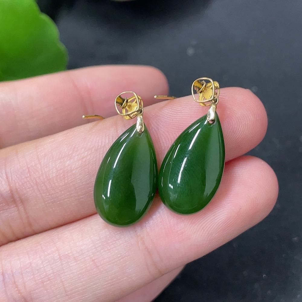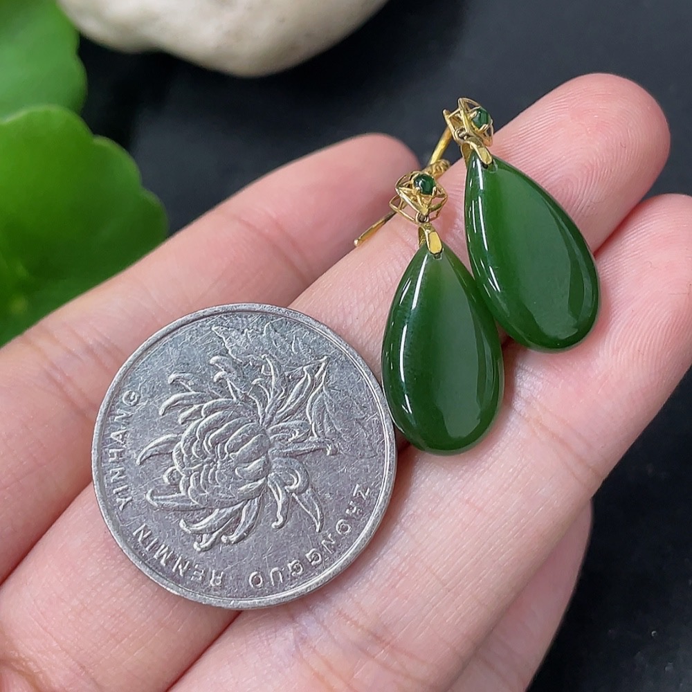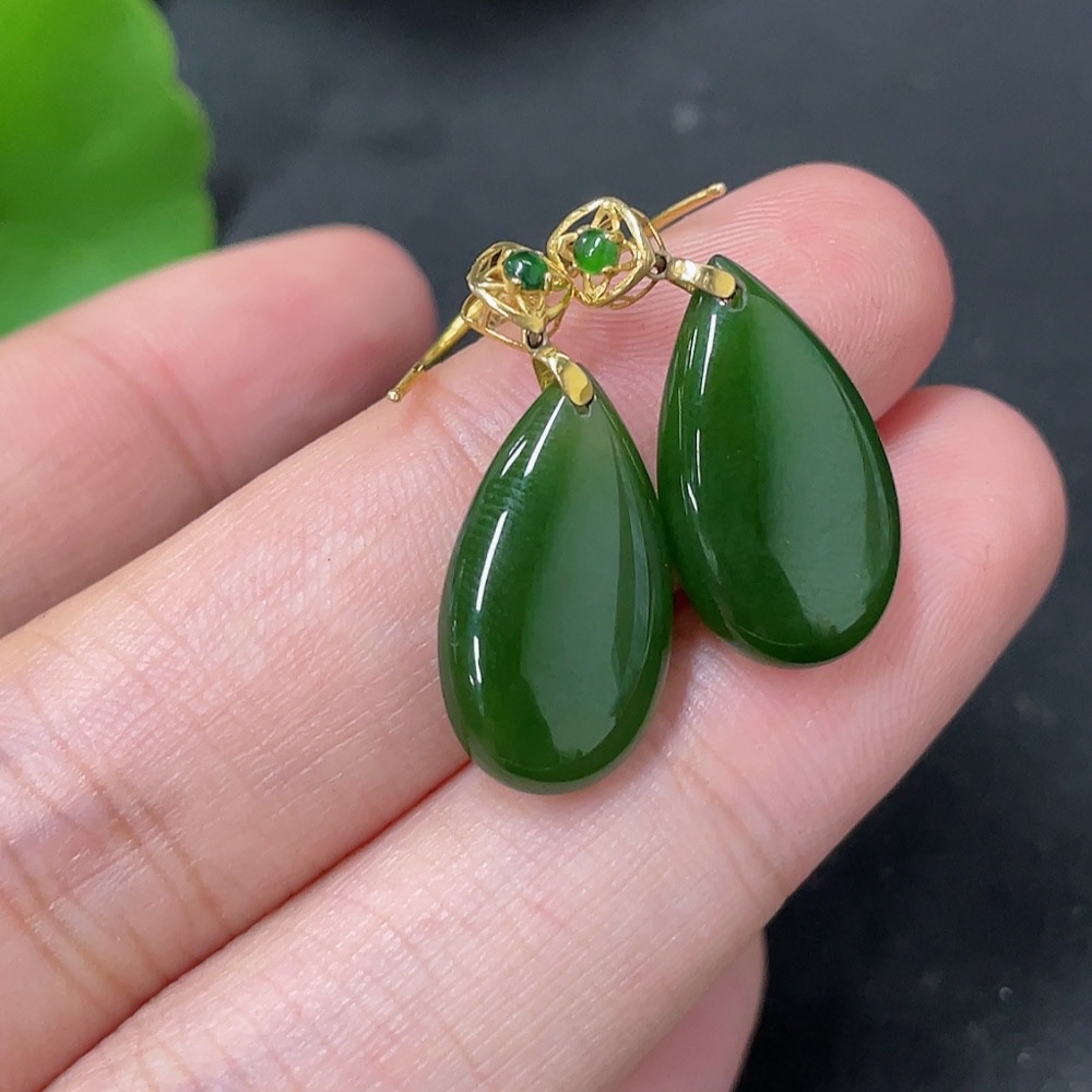 Hetian Jade Jasper Inlaid Earrings 18k Gold, Total Weight Approx. 3.3g