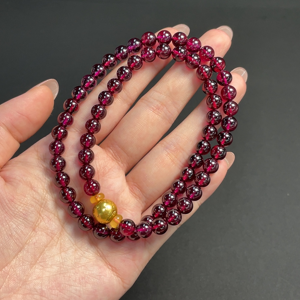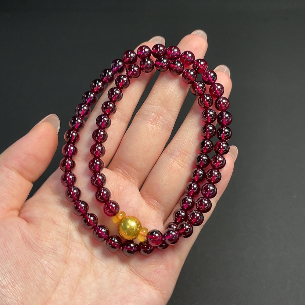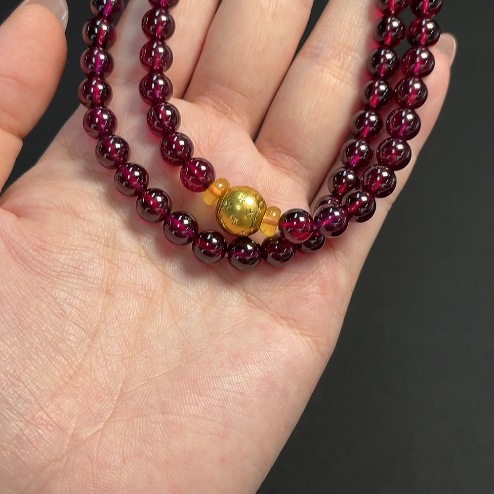 Garnet bead chain, no imprint, gold content tested at Au 99%, total weight approximately 43.57g, bead size about 6.6mm
