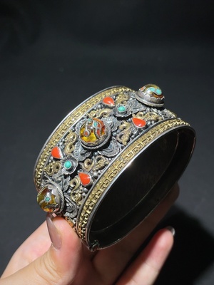 W34988041 Approximately 19th Century, West Asia/Nepal Region, Exotic Ethnic Style, Silver-Inlaid Copper with Floral Platinum Accents Bracelet, Miscellaneous