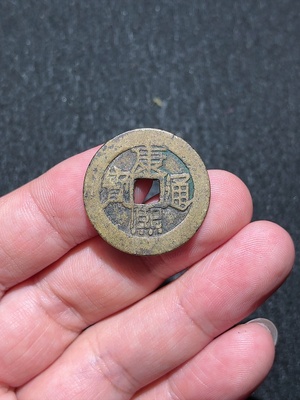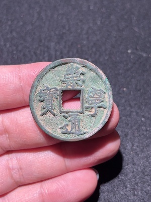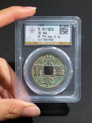 Q33915632 Northern Song Dynasty Chongning Tongbao Zheshi Zhengzi Narrow Characters with Raised Rim, Clear and Deep Character Impressions, Neat Reverse Rim, Natural Green Patina, Tidy Hole, Ancient Coin