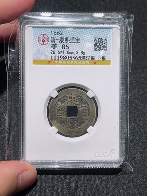 Q33915434 Kangxi Tongbao with Manchu and Han 'Fu' Characters, Small 'Fu' Version, Naturally Toned Yellowish Luster, GBCA Graded 85, Premium Ancient Coin
