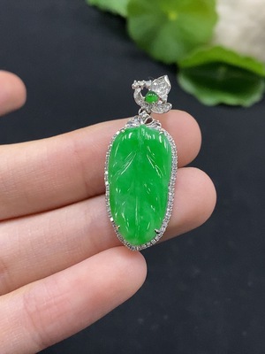 F36277945 Jadeite Leaf Pendant 18K Gold Total Weight Approx. 4.1g (With Diamond Accents)