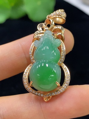 F35135138 Jadeite Gourd Pendant with 18K Gold and Diamond Accents, Total Weight Approximately 9.66 Grams