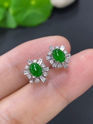 F39553142 Jadeite cabochon stud earrings in 18K gold with diamond accents, total weight approximately 2.4g (excluding ear backs)