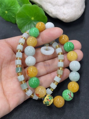 F40740776 Jadeite Bracelet Sell as a Lot with Non-A Beads (Yellow, Green) Non-Gold