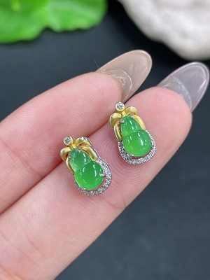 F39586948 Jadeite Gourd Inlaid Earrings, 18K Gold with Diamond Accents, Total Weight Approximately 1.45g (Excluding Ear Studs)