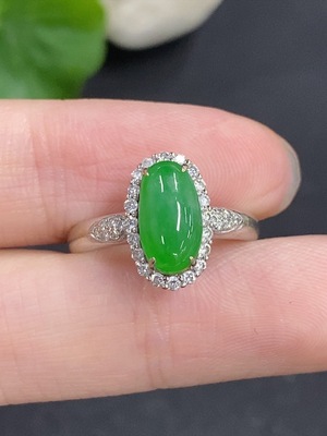 F39647358 Jadeite Cabochon Ring in 18K Gold, Size 14, Total Weight Approx. 3.1g (with Diamond Accents)