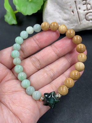 F39658128 Jadeite and Wood Bead Bracelet, Approx. 7.4mm, Total Weight Approx. 14.5g, Contains Other Mineral Components, Non-Gold Matching Beads