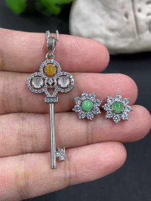 F40763764 Jadeite Cabochon Pendant + Stud Earrings Non-Gold Setting Total Weight Approx. 6.58g