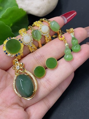 H39571358 Hetian Jade Inlaid Pendant + Adjustable Ring + Earrings Non-Gold Total Weight Approx. (Including Ear Studs) 23.8g