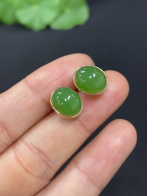H38522572 Hetian Jade Inlaid Earrings, approx. 7.6mm, 18k Gold Posts, 58% Gold Content, Total Weight approx. 1.7g