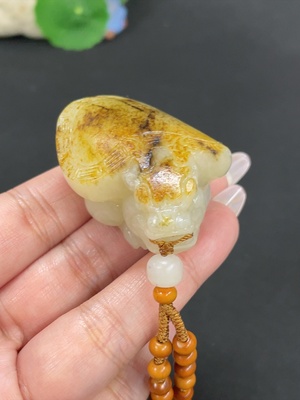 H39676208 Hetian Jade Handheld Carving - Auspicious Monkey Presenting Blessings, Total Weight Approx. 215.3g, Undetermined Skin Color Origin, Contains Other Mineral Components