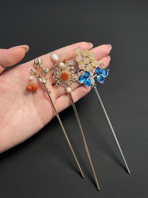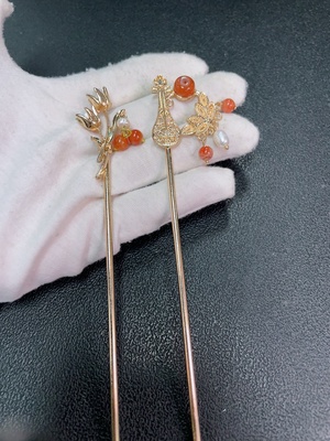 C39557651 Red Agate Hairpin with Visible Organic Matter and Pearl Accents, Non-Gold, Total Weight Approx. 20.29g, Sell as a Lot