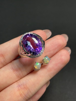 C40679393 Crystal and Opal Inlaid Earrings + Ring, Non-Gold Setting, Total Weight Approximately 7.42 Grams