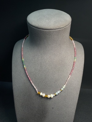 C36301901 Tourmaline Bead Necklace with Visible Organic Matter, Pearl, Jadeite, and Amber (Possible Non-Natural Accent Stones, Non-Metal, Total Weight Approx. 12.56g, Bead Size 3-4.8mm)