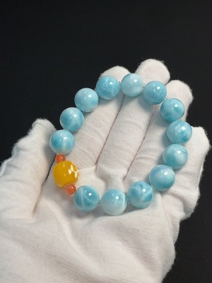 C39642289 Amber Beeswax Bracelet, approximately 12.4mm, total weight about 40.90g, with Larimar and Red Agate, visible organic matter