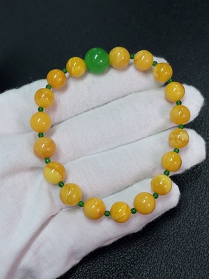 C39583413 Amber Beeswax Bracelet with Green Stones (Possibly Non-Natural), Total Weight Approx. 7.65g, Size About 8.2mm
