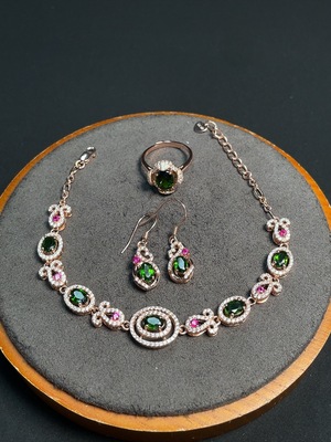 C40679316 Diopside Inlaid Bracelet + Earrings + Ring Non-gold Inlay Total Weight Approx. 15.39g