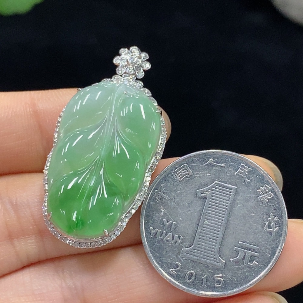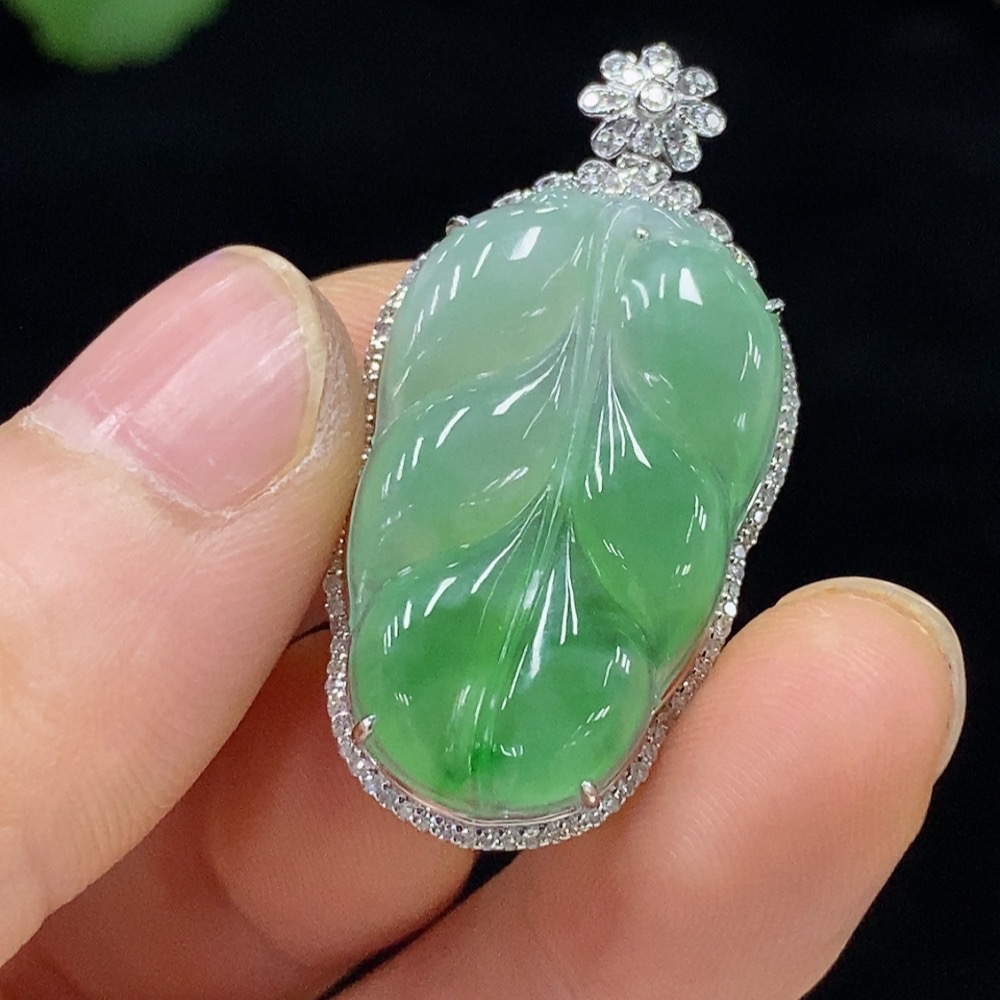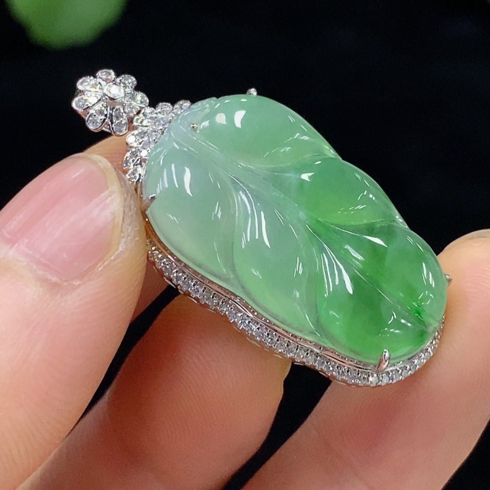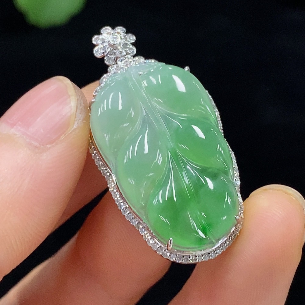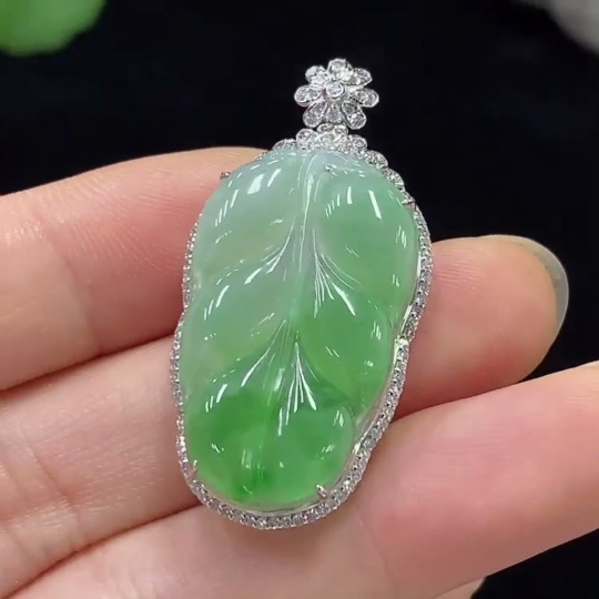 Jadeite Leaf Inlaid Pendant 18K Gold with Diamond Accent Total Weight Approx. 5.59g
