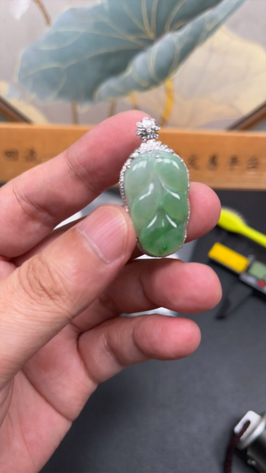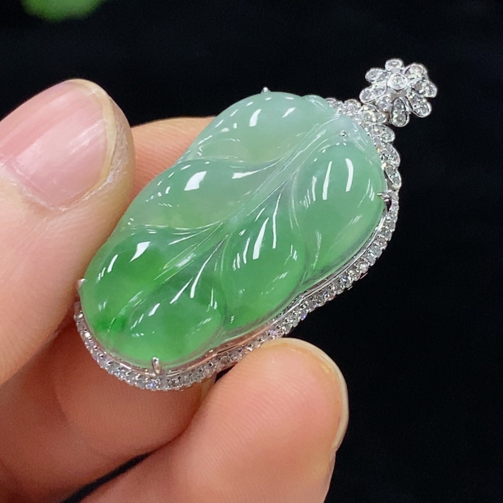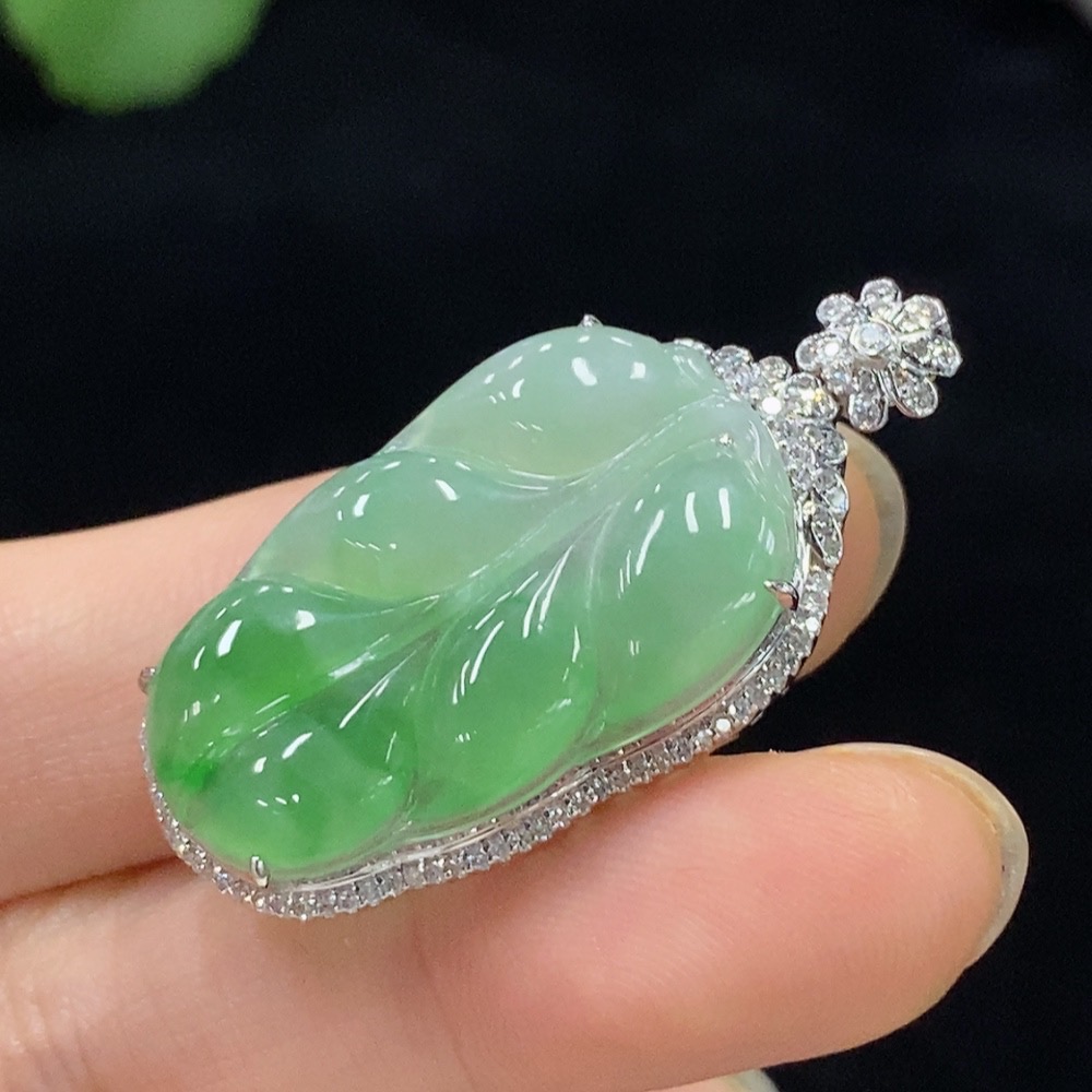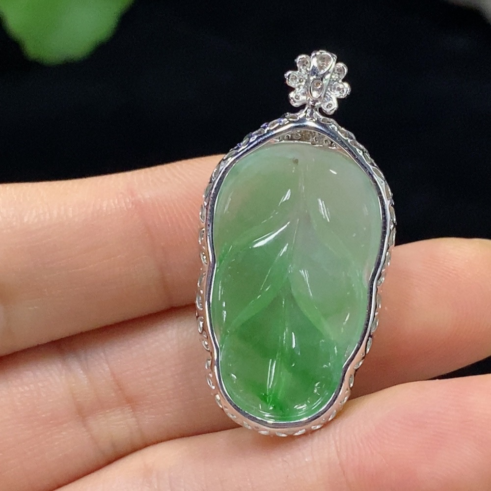Jadeite Leaf Inlaid Pendant 18K Gold with Diamond Accent Total Weight Approx. 5.59g